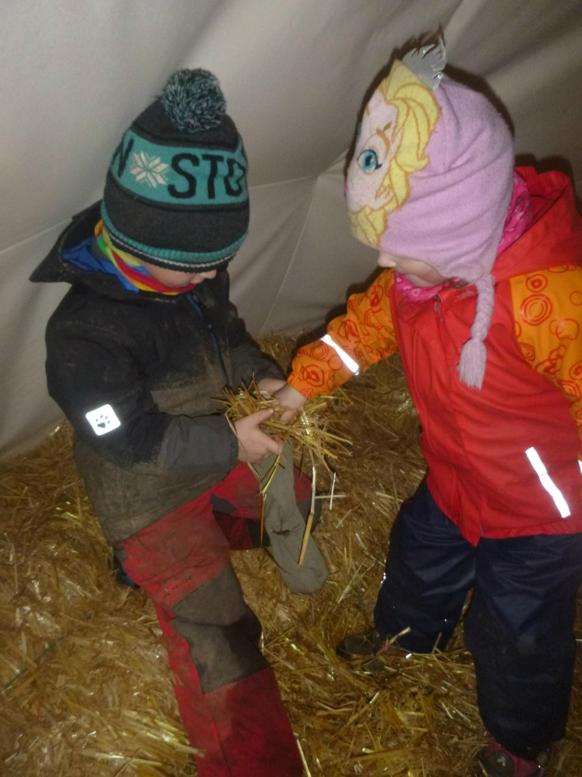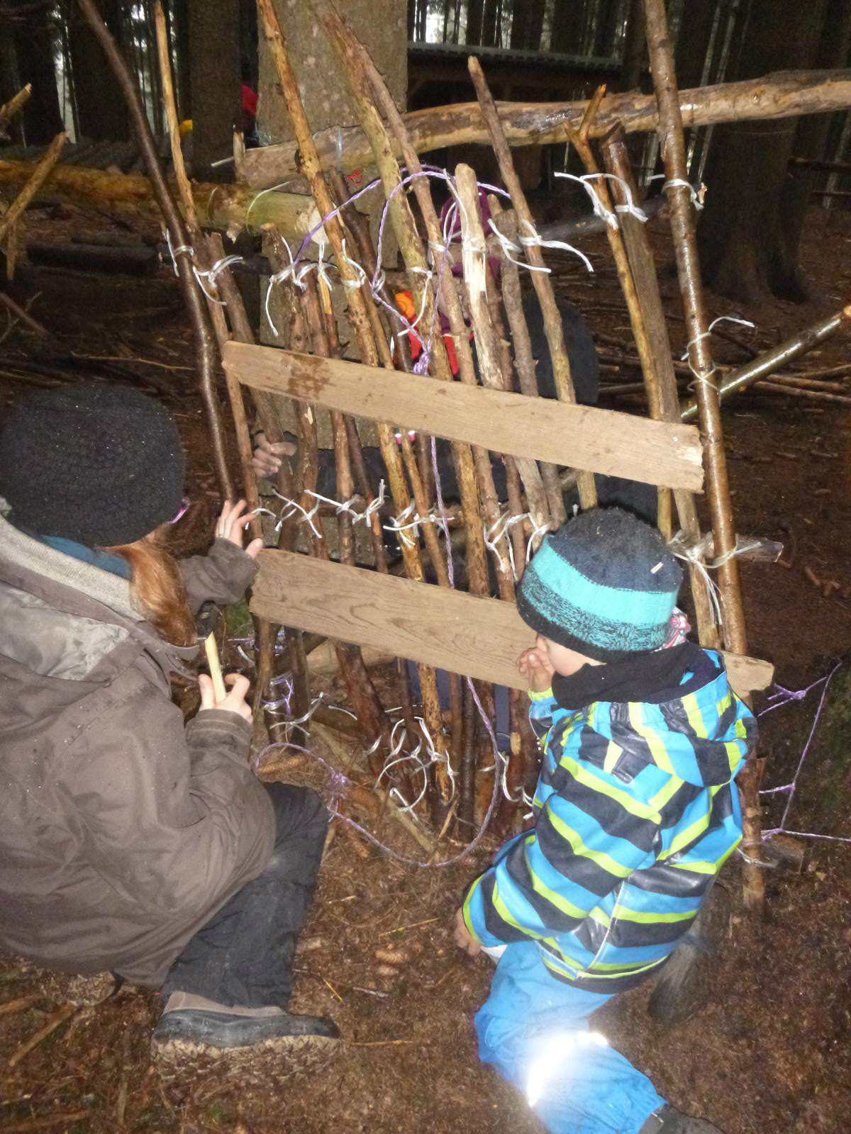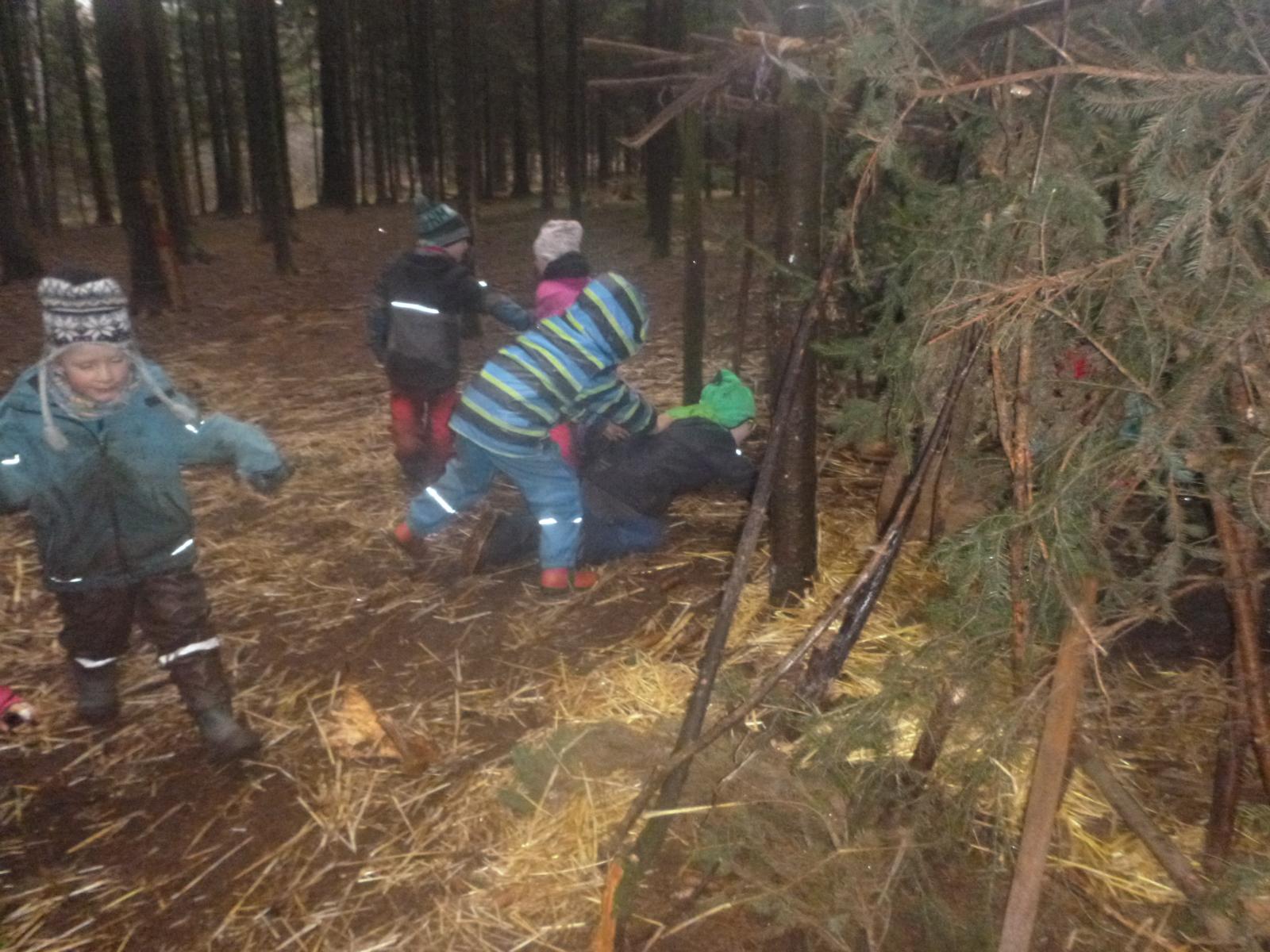 Die Begeisterung für den Bau war am Anfang riesengroß und die Helfer zahlreich. Doch während des Baus schlüpften die Kinder so sehr in ihre Rollen hinein, dass das Bauen zweitrangig wurde und das Rollenspiel an erster Stelle stand Da wurden in dem halbfertigen Bau gleich Wachen positioniert, Pferde untergestellt und die Burgküche in Betrieb genommen. Aber wir Großen brauchen ja auch etwas zu tun und freuten uns, dass die Kinder sich so auf das Thema einliesen.