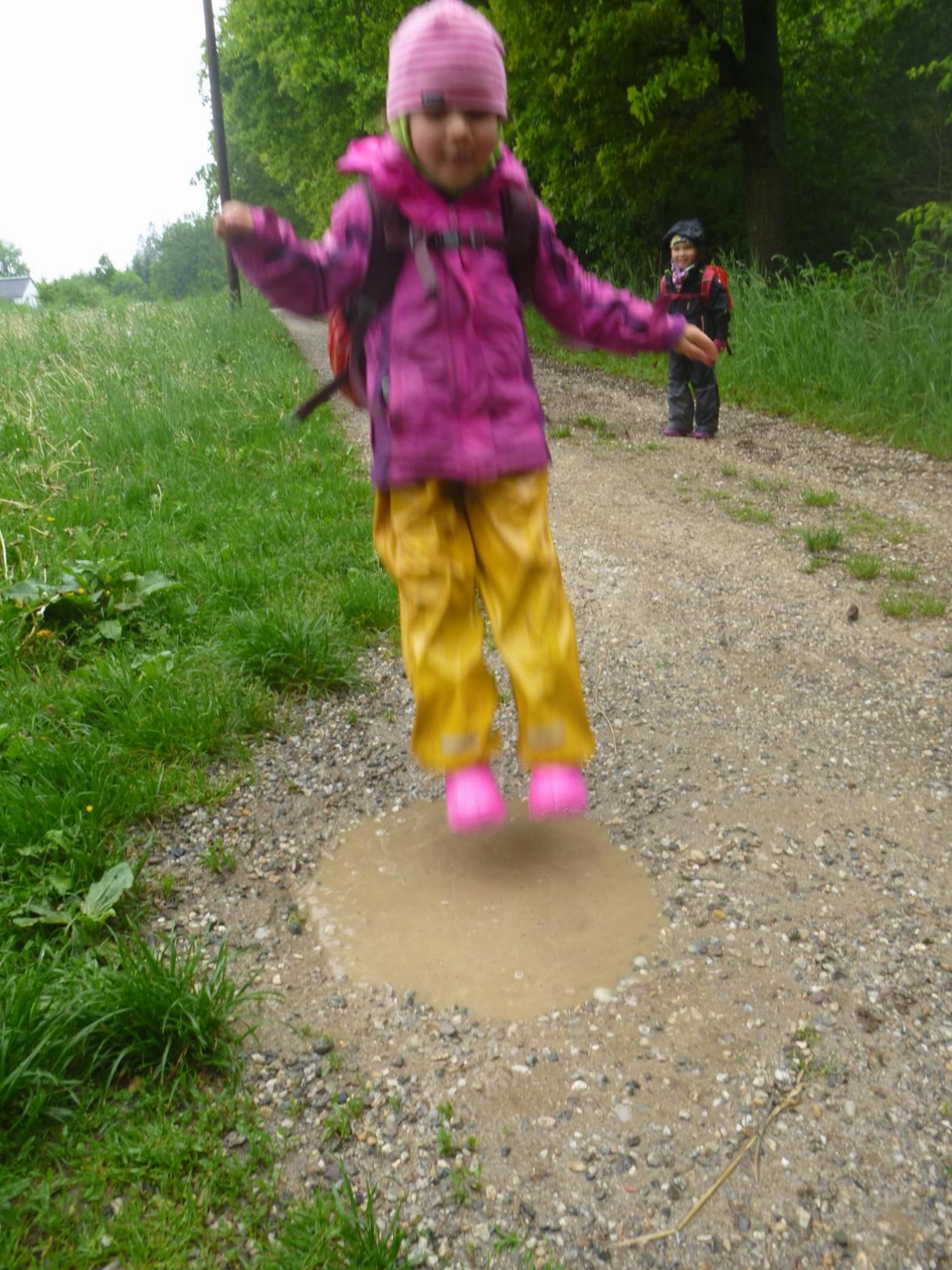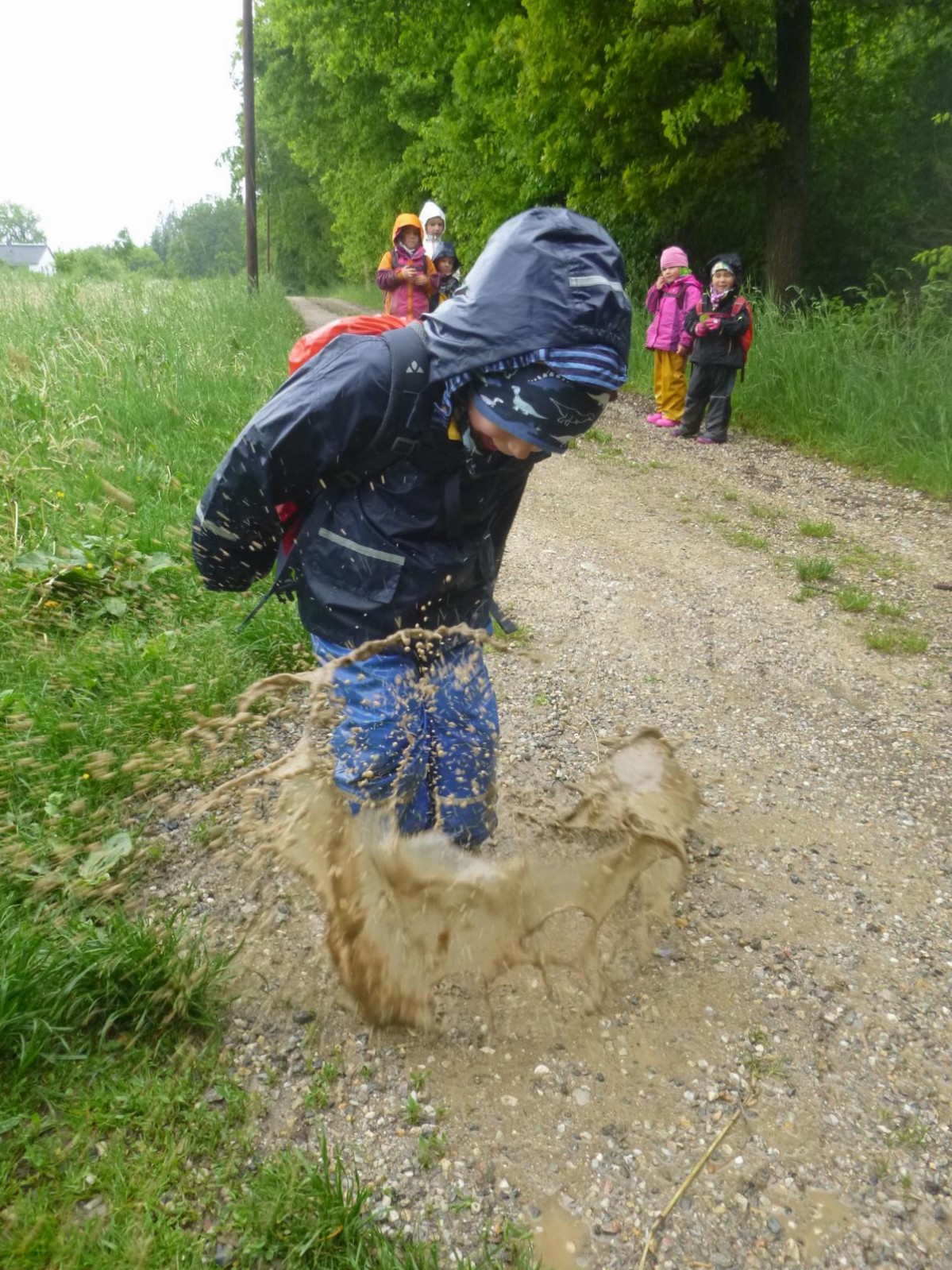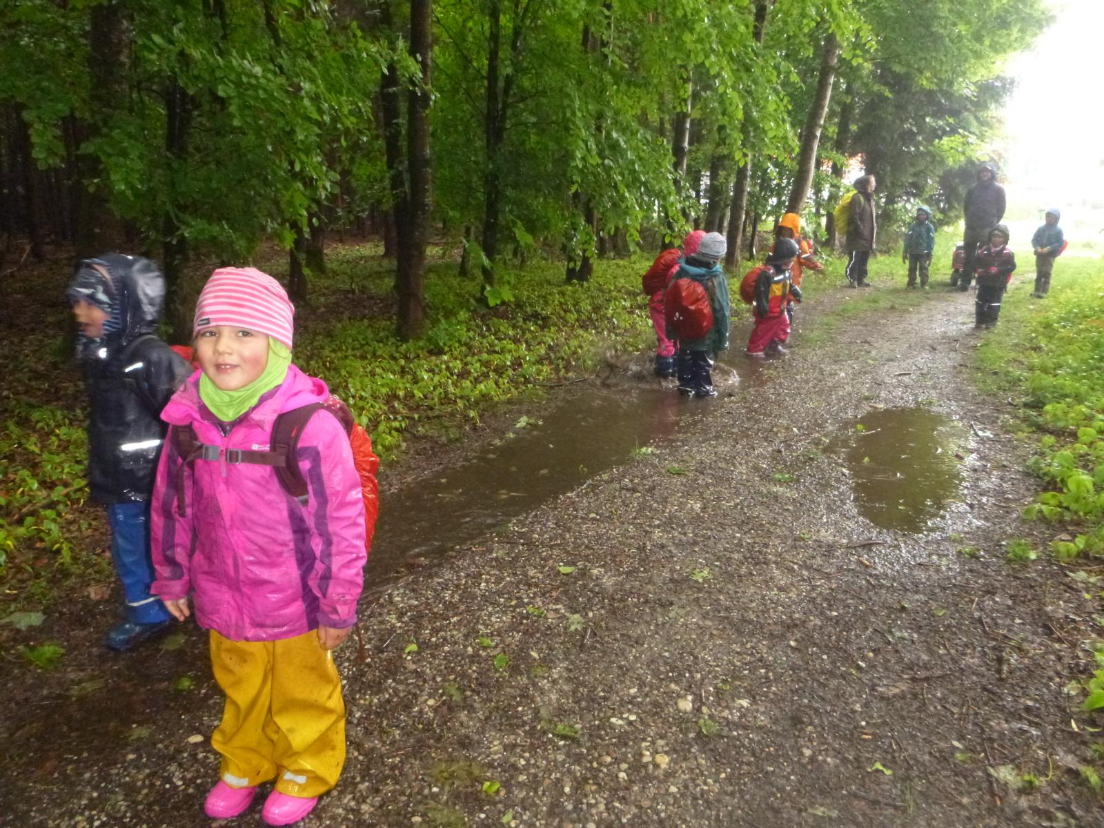 Nicht nur die von der andauernden Trockenheit geplagte Natur freute sich über die Regentage im Mai, auch die Waldlauser hatten ihr großes Vergnügen damit. Endlich gab es wieder Pfützen, die man „leerspringen“ konnte, baatzige Erde, die man als Beton, Knödelmasse, Malfarbe, Rutschbahn und vieles andere nutzen konnte. Der Phantasie sind hier keine Grenzen gesetzt und der Begriff „Spritztour“ bekommt hier mit einem mal eine ganz neue Bedeutung.