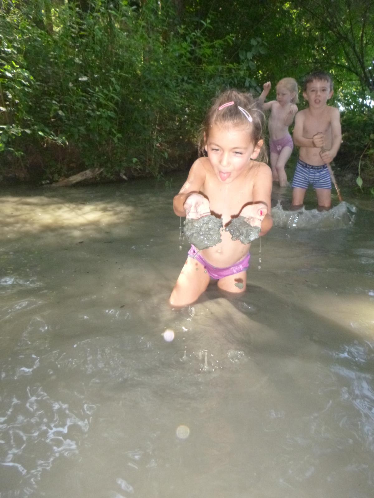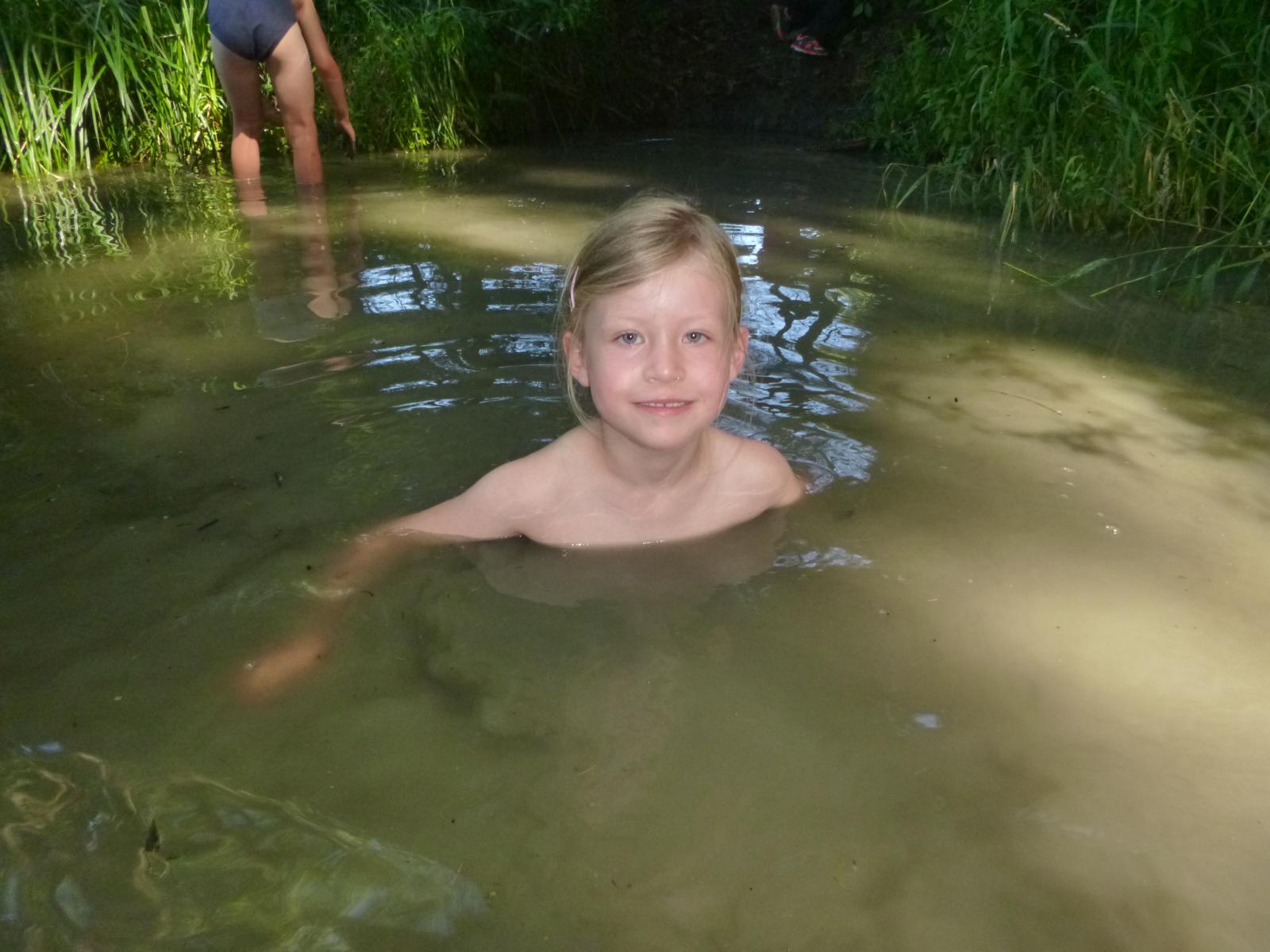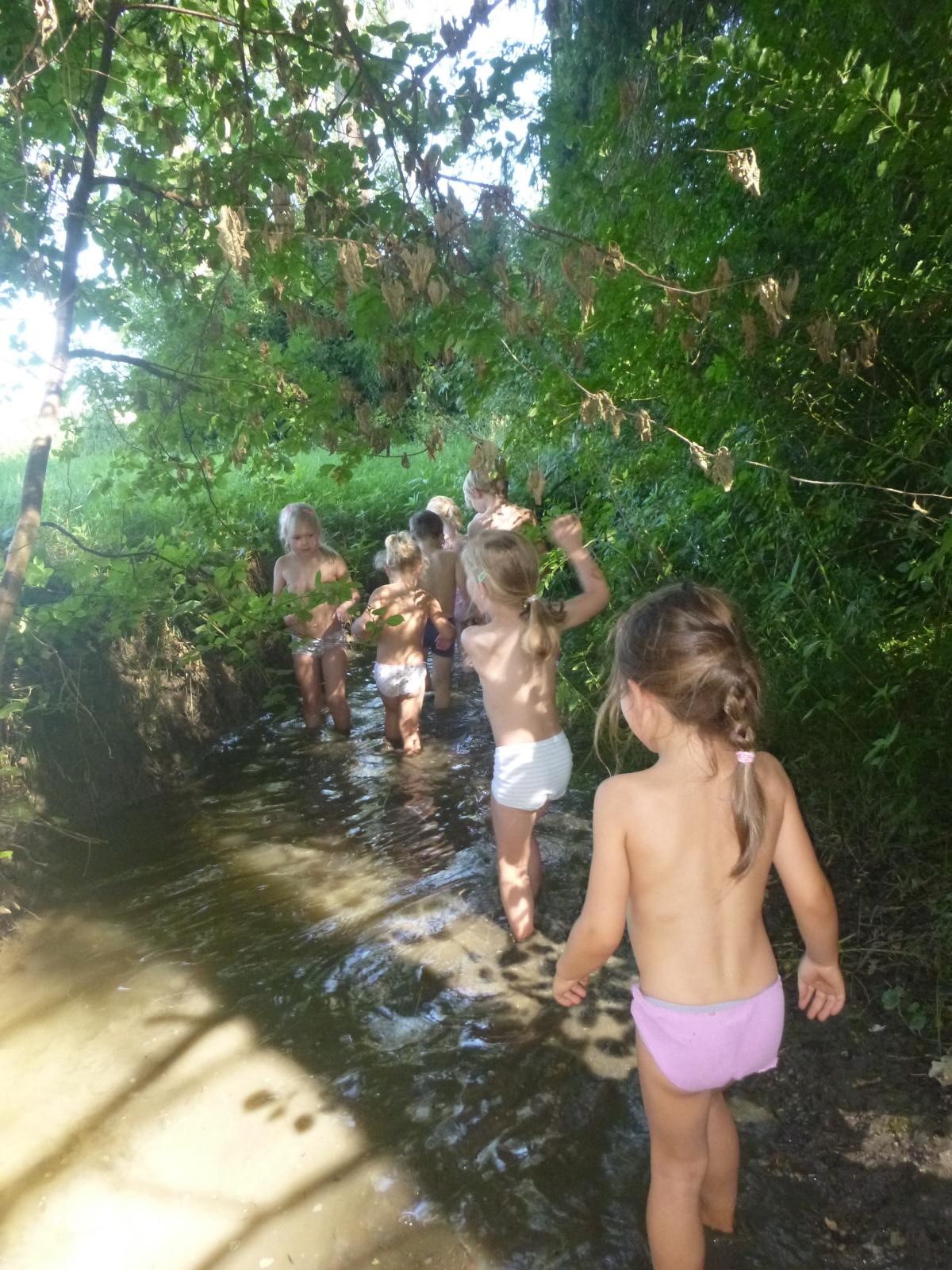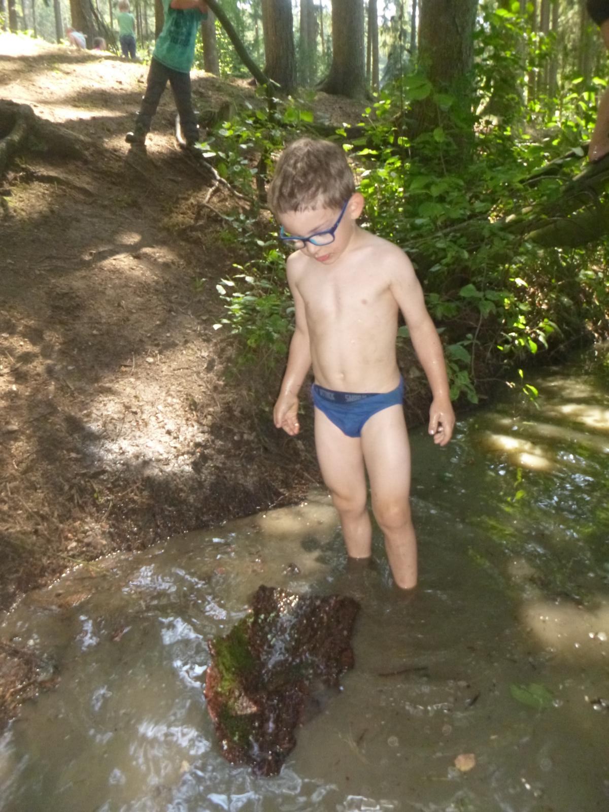 In den letzten Julitagen zieht es uns dann immer wieder zum Lausbach hinunter. Schnell aus den Kleidern geschlüpft und hinein in die überraschend kühlen Fluten. Erst tasten die Waldlauser sich noch vorsichtig voran, doch bald haben sie ihre Scheu verloren und die ersten "schwimmen" an den tiefsten Stellen im Bach herum. Der Untergrund ist weich und ein wenig glitschig, doch schnell wird der Schlamm zum Bauen und Baatzen genutzt und Körperbemalungen entstehen. Libellen umschwirren uns, Wasserläufer werden entdeckt und so manches Rindenschifferl wird beladen und auf die Reise geschickt.
