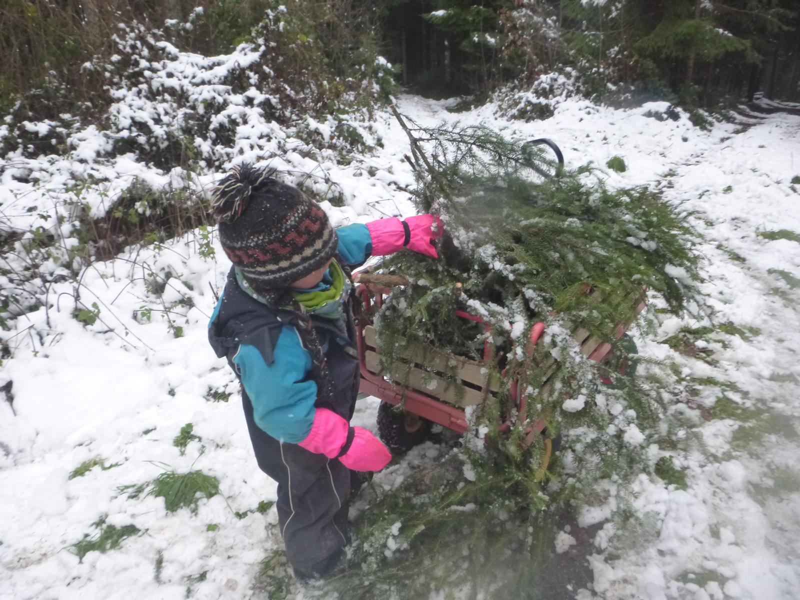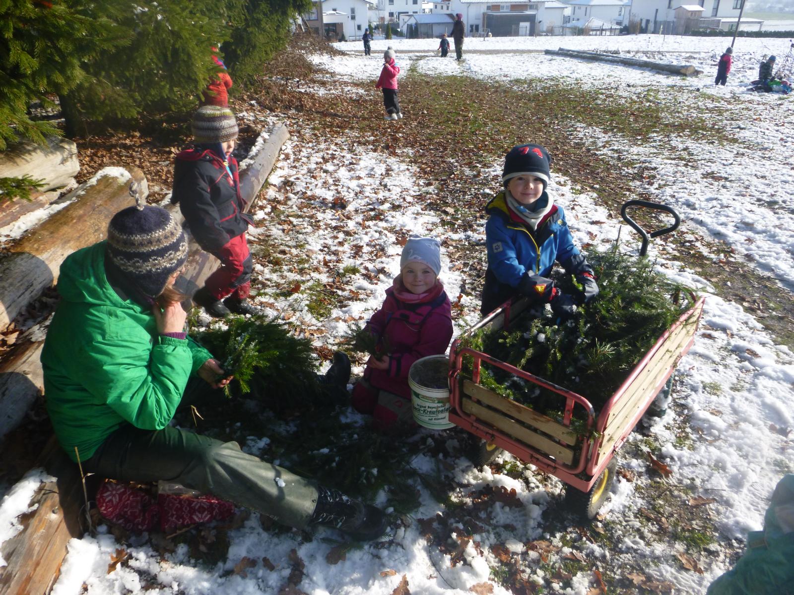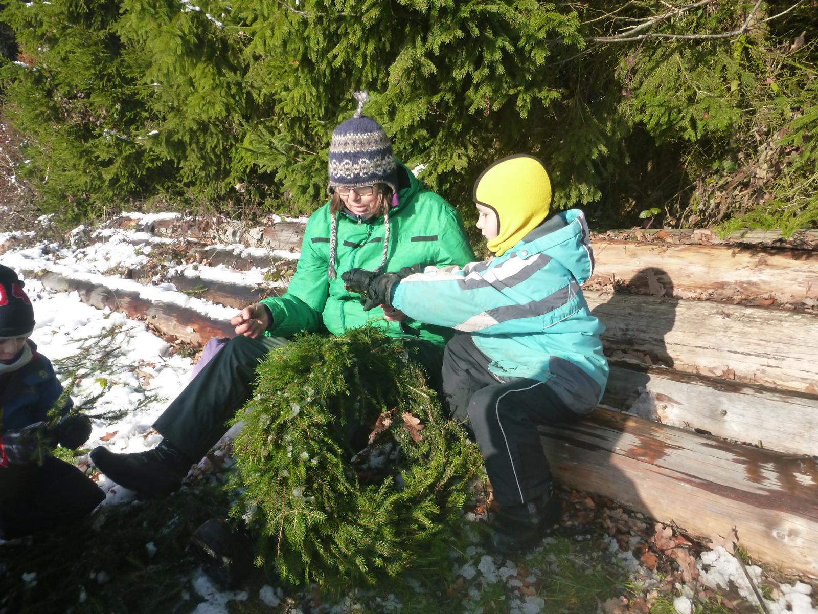 Kaum waren die Ohrwürmer des St-Martinsfestes verklungen, stimmten die Kinder schon das eine oder andere Nikolaus- und Adventslied an. Die ersten Vorbereitungen auf die Weihnachtszeit beginnen, Wollschäfchen für das Kripperl werden schon gebastelt und mit dem ersten Schnee macht sich die Vorfreude auf die Adventszeit immer mehr bemerkbar. Auch bei uns im Wald darf der Adventskranz nicht fehlen. Gemeinsam sammeln wir grüne Fichten- und Kiefernzweigerl und binden sie mit vereinten Kräften zum großen Adventskranz. Der ziert im Dezember unsere Kreismitte und täglich darf ein anderes Kind die Kerzen anzünden. Weit ist es nicht mehr bis zum Heiligen Abend!