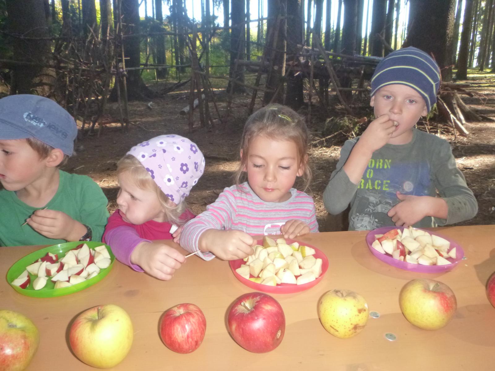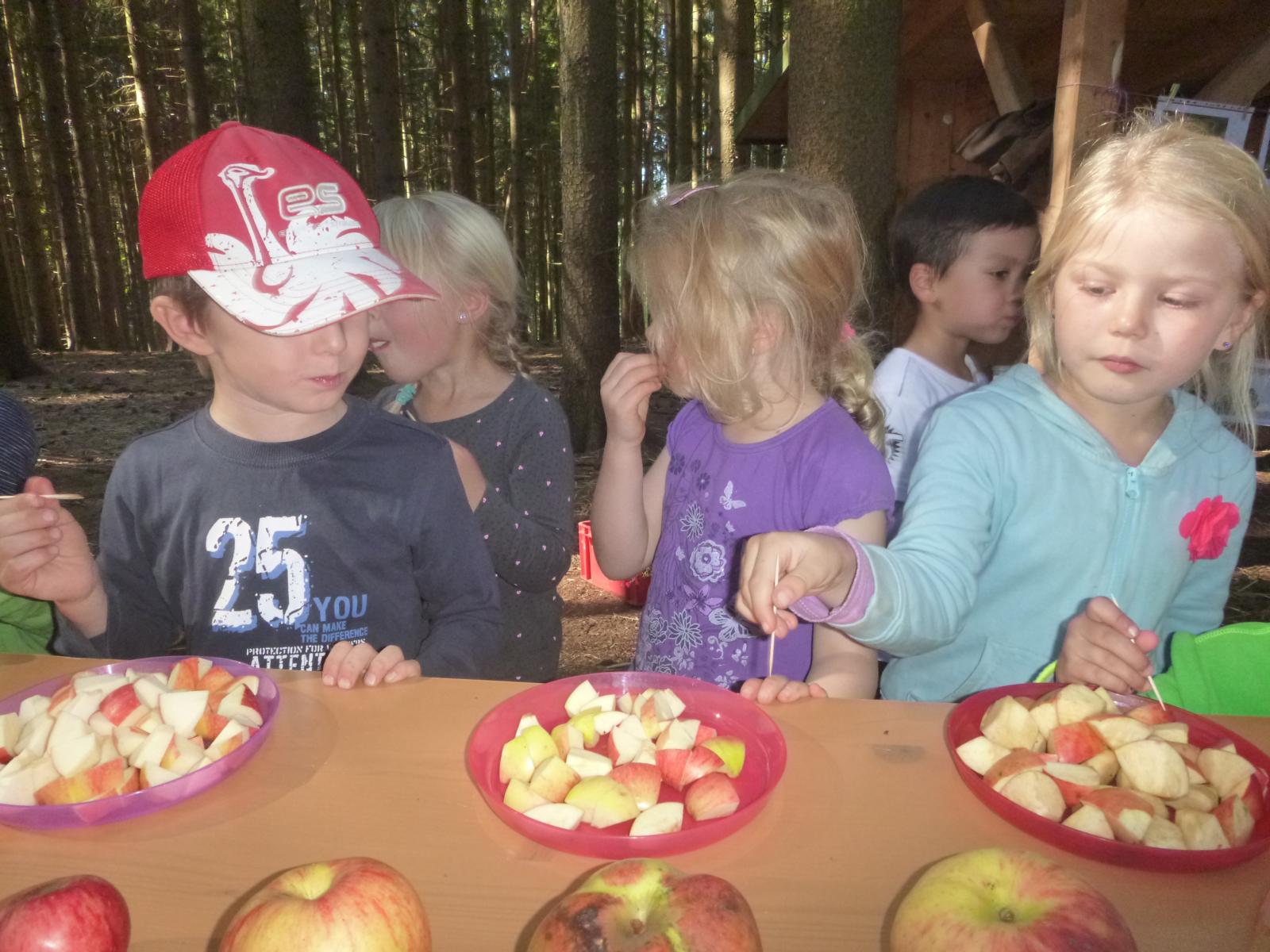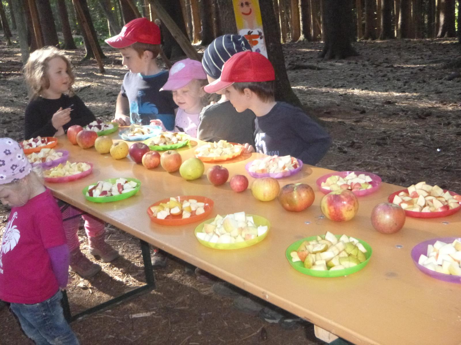 Die reiche Fülle an Äpfeln in diesem Jahr hatte sich auch auf unserem Erntedanktisch gezeigt: viele Äpfel der verschiedensten Sorten warteten dort auf ihre weitere Verwendung. Bei der Brotzeit sind sie schon fester, gern gegessener Bestandteil und einen großer Topf mit Apfelmus haben die Waldlauser auch schon gekocht und zusammen mit Griespudding verspeist. Nun wollten wir uns einmal die geschmackliche Vielfalt der Äpfel bewußt machen. Ca. fünfzehn verschiedene Apfelsorten konnten wir unser eigen nennen und die galt es nun zu probieren und zu vergleichen: süße, säuerliche, mehlige und saftige, knackige und weichere. Die Kinder verglichen die verschiedenen Farben und Apfelformen und stürzten sich schließlich mit Vergnügen auf die vorbereiteten Apfelstückchen. Da wurde probiert und bewertet, der Lieblingsapfel ausgewählt und am Ende stand das Staunen über die geschmackliche Vielfalt. Und die Erkenntnis, dass der schönste Apfel nicht immer am besten schmecken muss.....