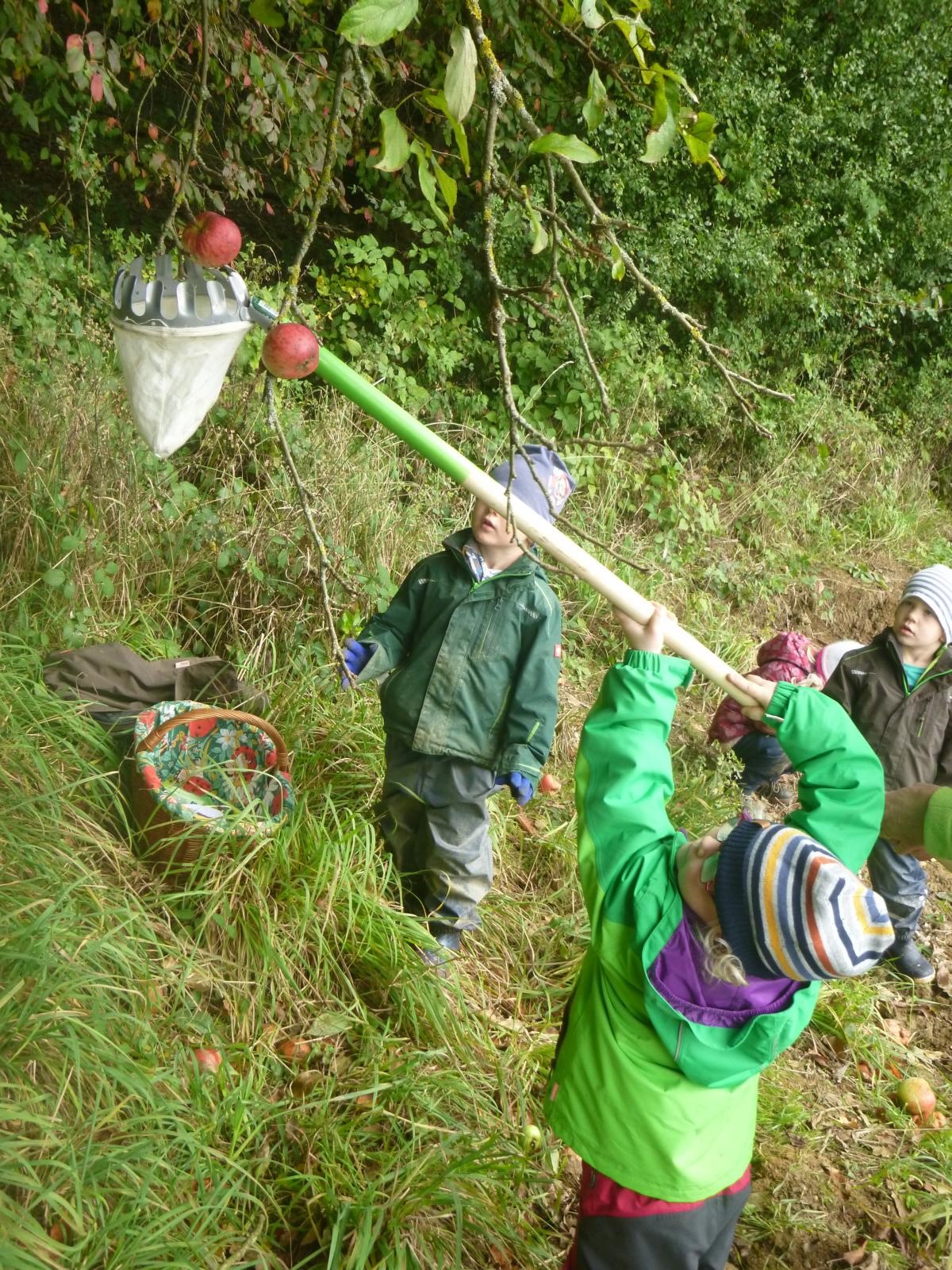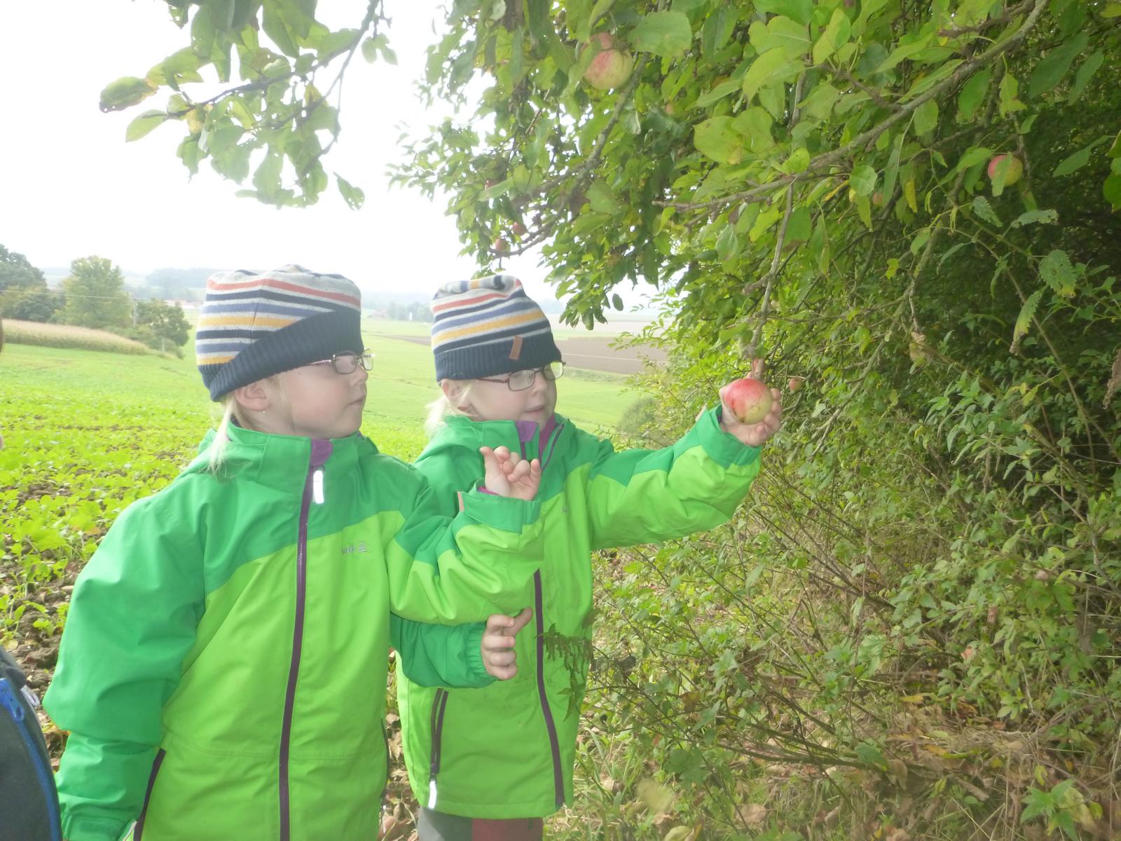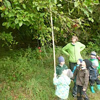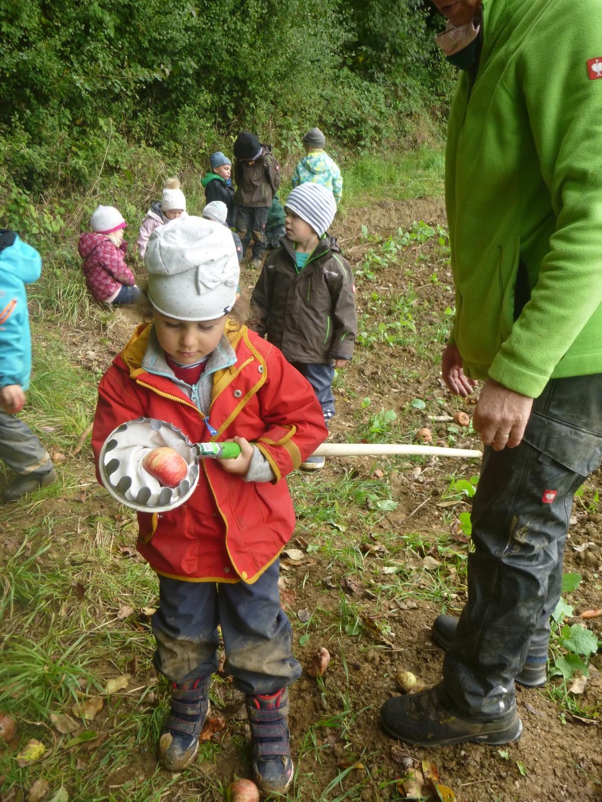 An einem sonnigen Herbsttag machten sich die Waldlauser - ausgestattet mit Korb und Apfelpflücker - auf zum geschützten Waldrand. Mehrere Apfelbäume wachsen dort versteckt und die roten Äpfel leuchten uns schon von weitem entgegen. Nach zwei mageren Jahren hängen heuer die Äste wieder übervoll mit den leckeren Früchten. Die ersten Äpfel wandern natürlich gleich in den Mund, süß und saftig sind sie. Mit vereinten Kräften wird weiter gepflückt und der Korb füllt sich schnell. Was da wohl alles daraus gekocht werden kann? Bratäpfel, Apfelkücherl, Apfelmus – den Kindern fallen viele Leibspeisen ein! Das wird ein leckerer Herbst!