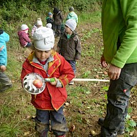 Die Äpfel schmeckten aber nicht nur den Waldlausern. Mit großem Interesse beobachteten die Kinder eine Vielzahl an Schmetterlingen und Insekten, die sich an den bereits abgefallenen Äpfeln labten. Mit Respekt wurden auch einigen Hornissen zugeschaut, die mit ihrem kräftigen Beißwerkzeug das Fallobst bearbeiteten.