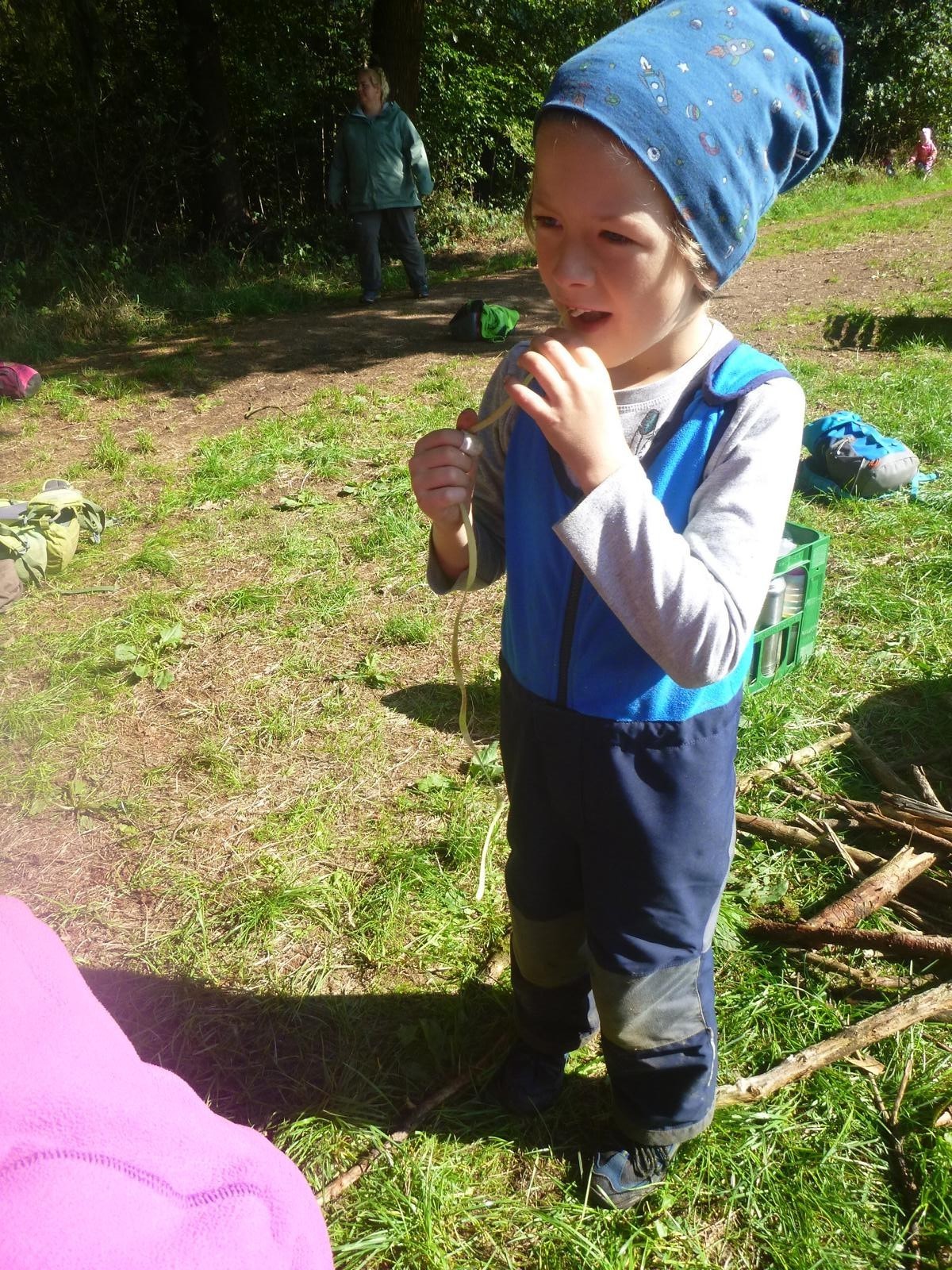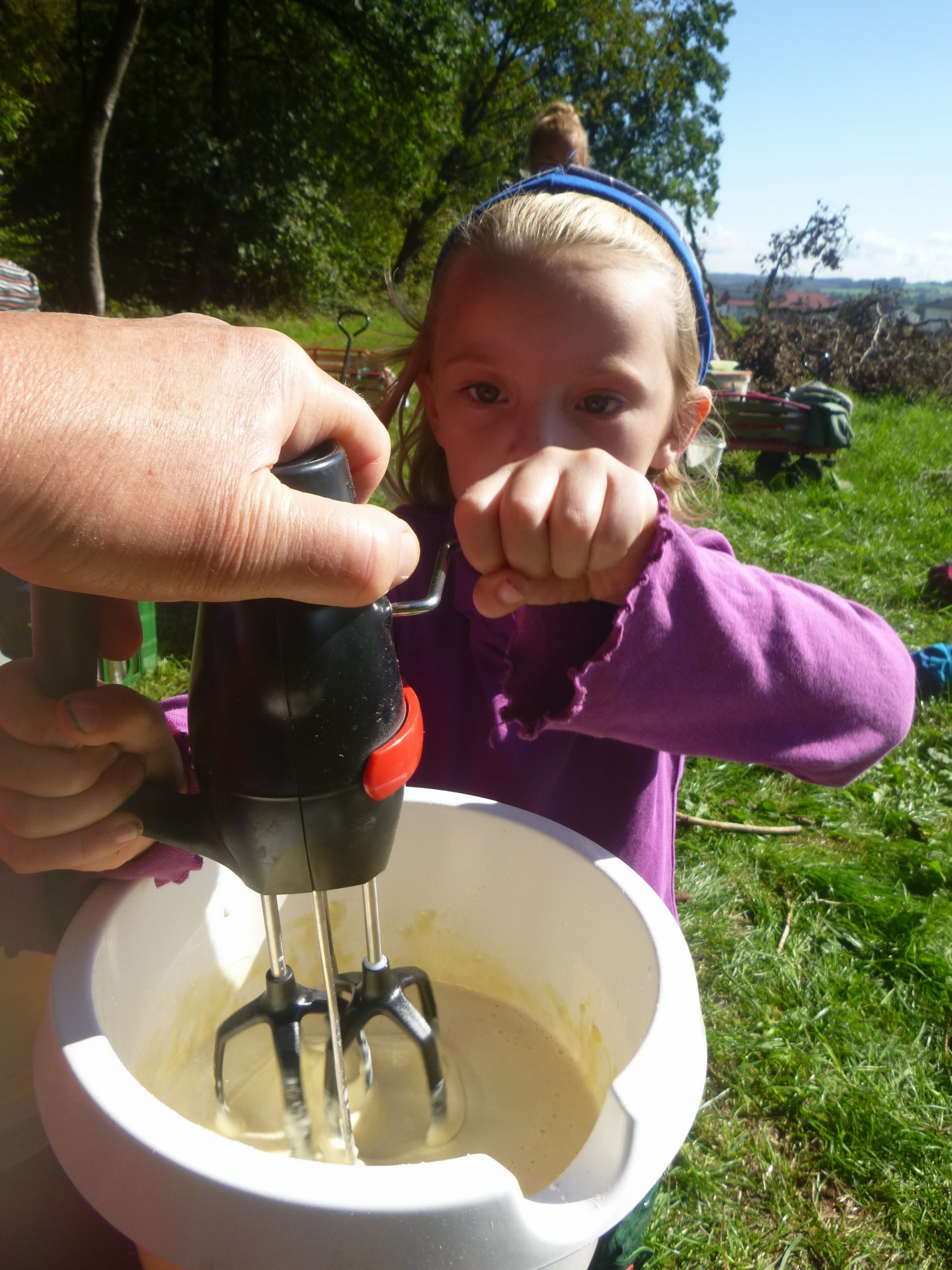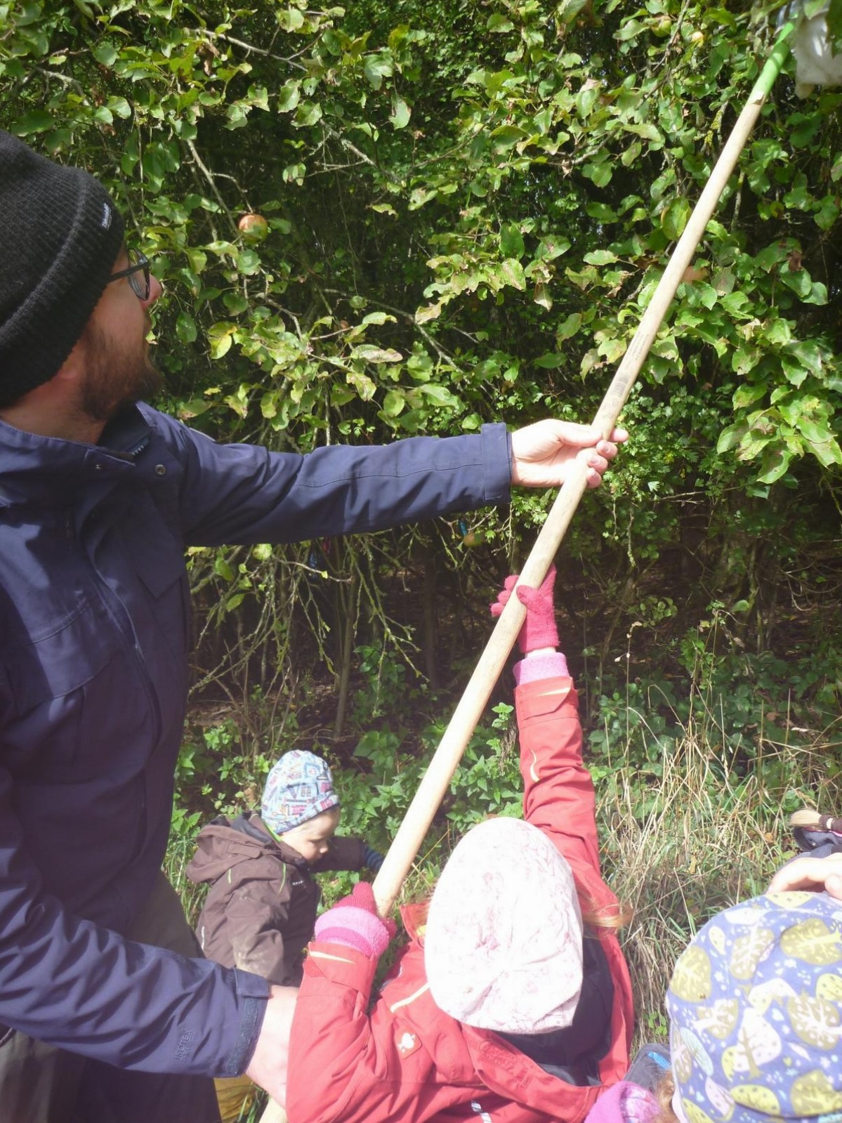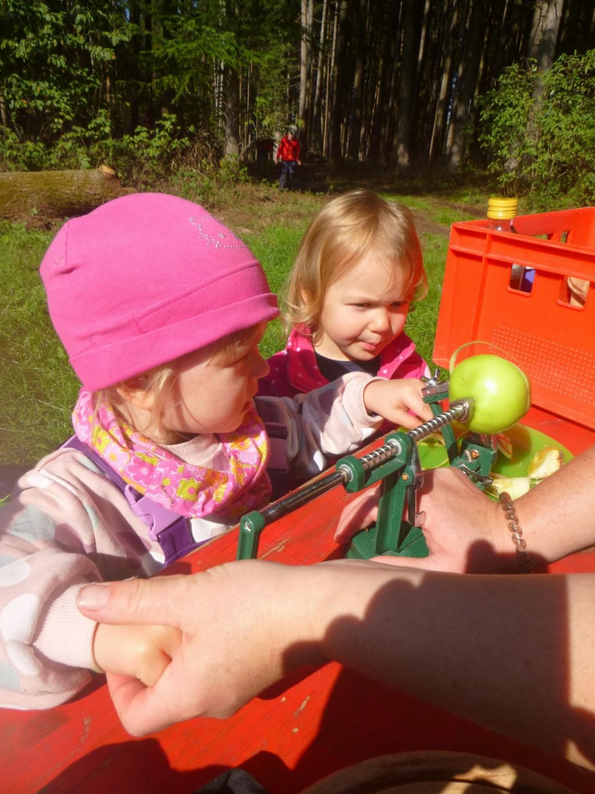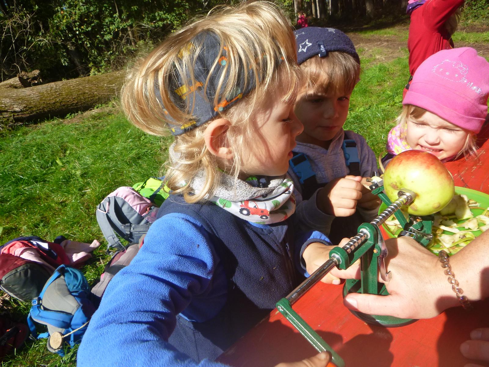 Geschützt am Waldrand warten jedes Jahr ein paar Apfelbäume mit ihren leckeren Früchten auf den Besuch der Waldlauser. Mit Korb und Apfelpflücker ausgestattet, machen sich die Kinder dann ans Werk, um wenigstens ein paar der guten Äpfel erwischen zu können, die hoch oben in den Zweigen schaukeln. Jeder darf einmal sein Glück probieren und am Ende ist der Korb ganz gut gefüllt. Die ersten Äpfel werden gleich noch an Ort und Stelle verspeist, die anderen am nächsten Tag zu leckeren Apfelkücherln verarbeitet.