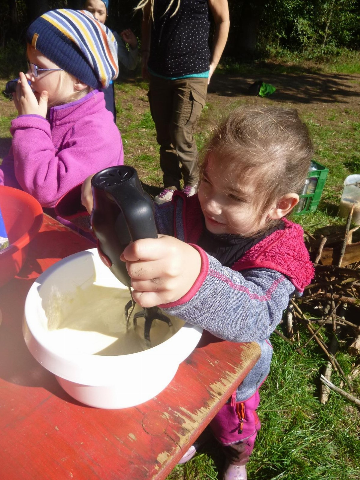Hier helfen alle mit: Teig rühren, Äpfel schälen und schneiden, die Apfelringe eintauchen und schließlich in der Pfanne ausbacken. Und dann ist die Leckerei endlich fertig.