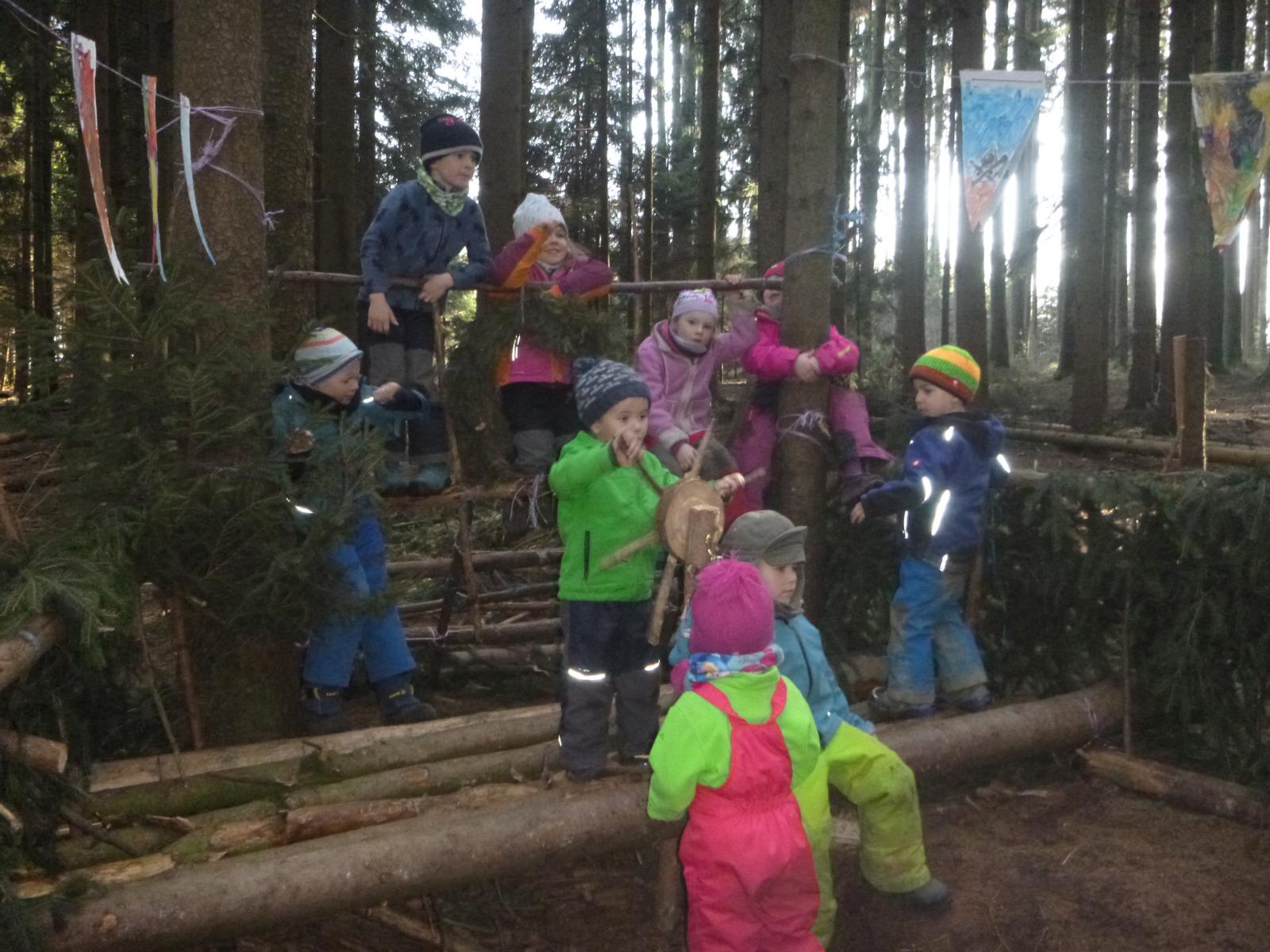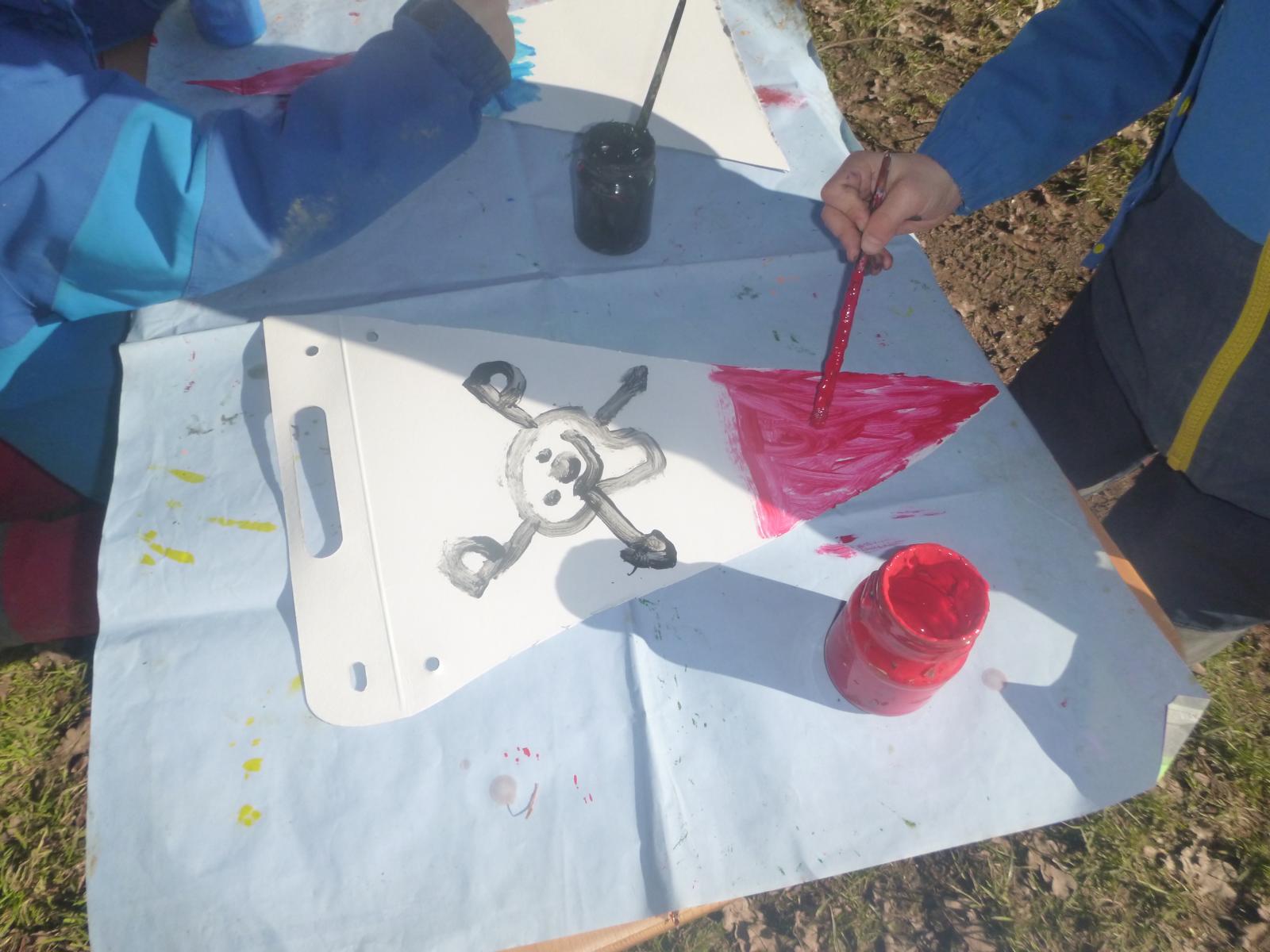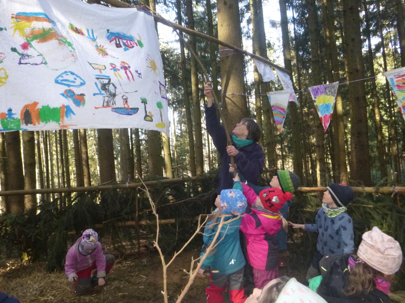 Mit großem Elan und viel Engagement hatten die Waldlauser am Piratenschiff gearbeitet: Die Schiffswände waren dicht, das Steuerrad funktionstüchtig, die Schiffsplanken verlegt, die Kojen mit frischem Stroh ausgestreut und vom Krähennest konnte alles überblickt werden. Gemeinsam wurden viele Wimpel bemalt und aufgehangen und am Ende konnte endlich gemeinsam das buntbemalte große Segel gehisst werden: Auf Matrosen, packt alle an! Jetzt stand einer Kaperfahrt wohl nichts mehr im Wege und der Piratenpapagei Josefine feuerte alle kräftig an.