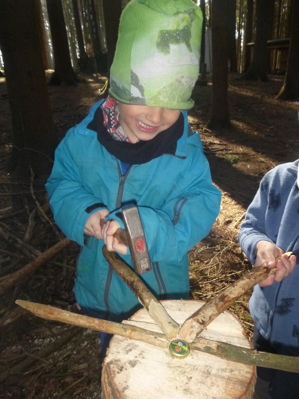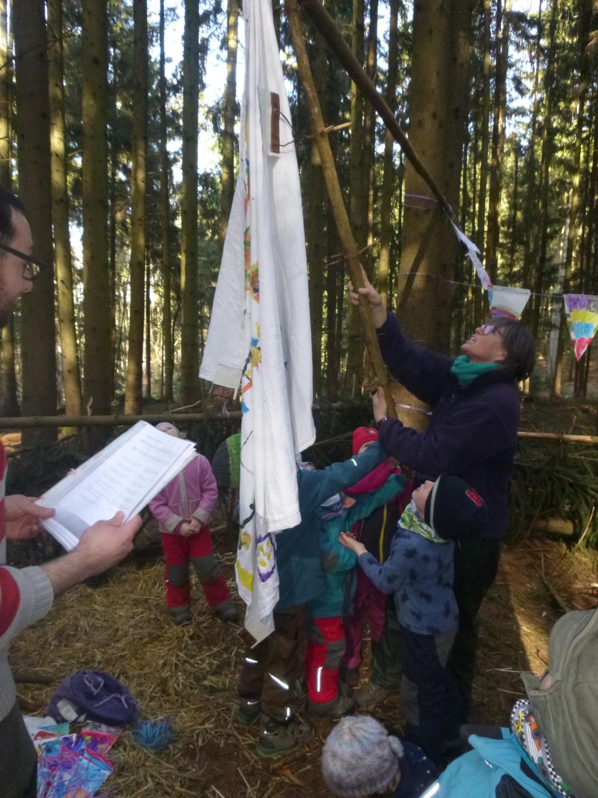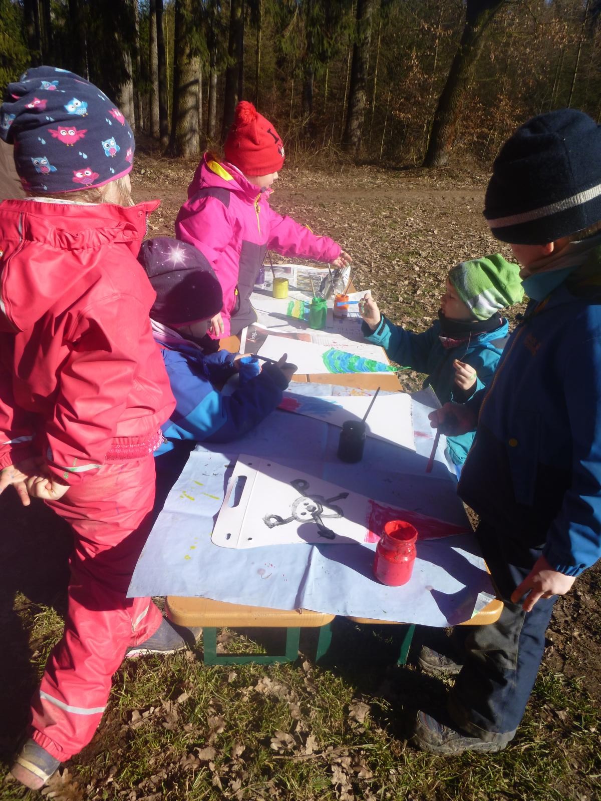 Mit großem Elan und viel Engagement hatten die Waldlauser am Piratenschiff gearbeitet: Die Schiffswände waren dicht, das Steuerrad funktionstüchtig, die Schiffsplanken verlegt, die Kojen mit frischem Stroh ausgestreut und vom Krähennest konnte alles überblickt werden. Gemeinsam wurden viele Wimpel bemalt und aufgehangen und am Ende konnte endlich gemeinsam das buntbemalte große Segel gehisst werden: Auf Matrosen, packt alle an! Jetzt stand einer Kaperfahrt wohl nichts mehr im Wege und der Piratenpapagei Josefine feuerte alle kräftig an.
