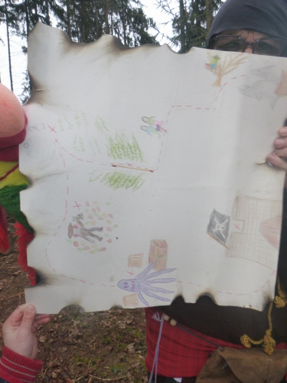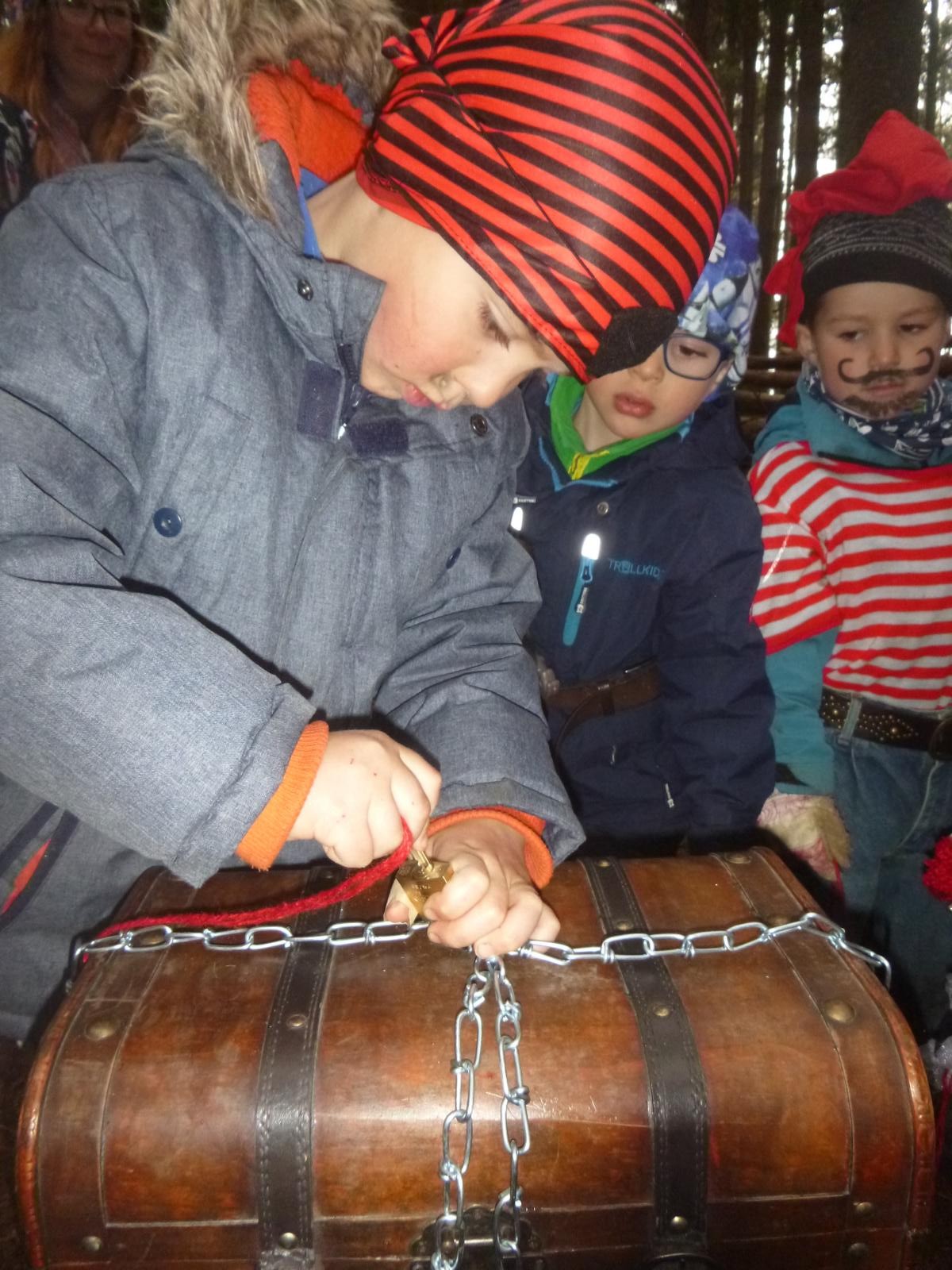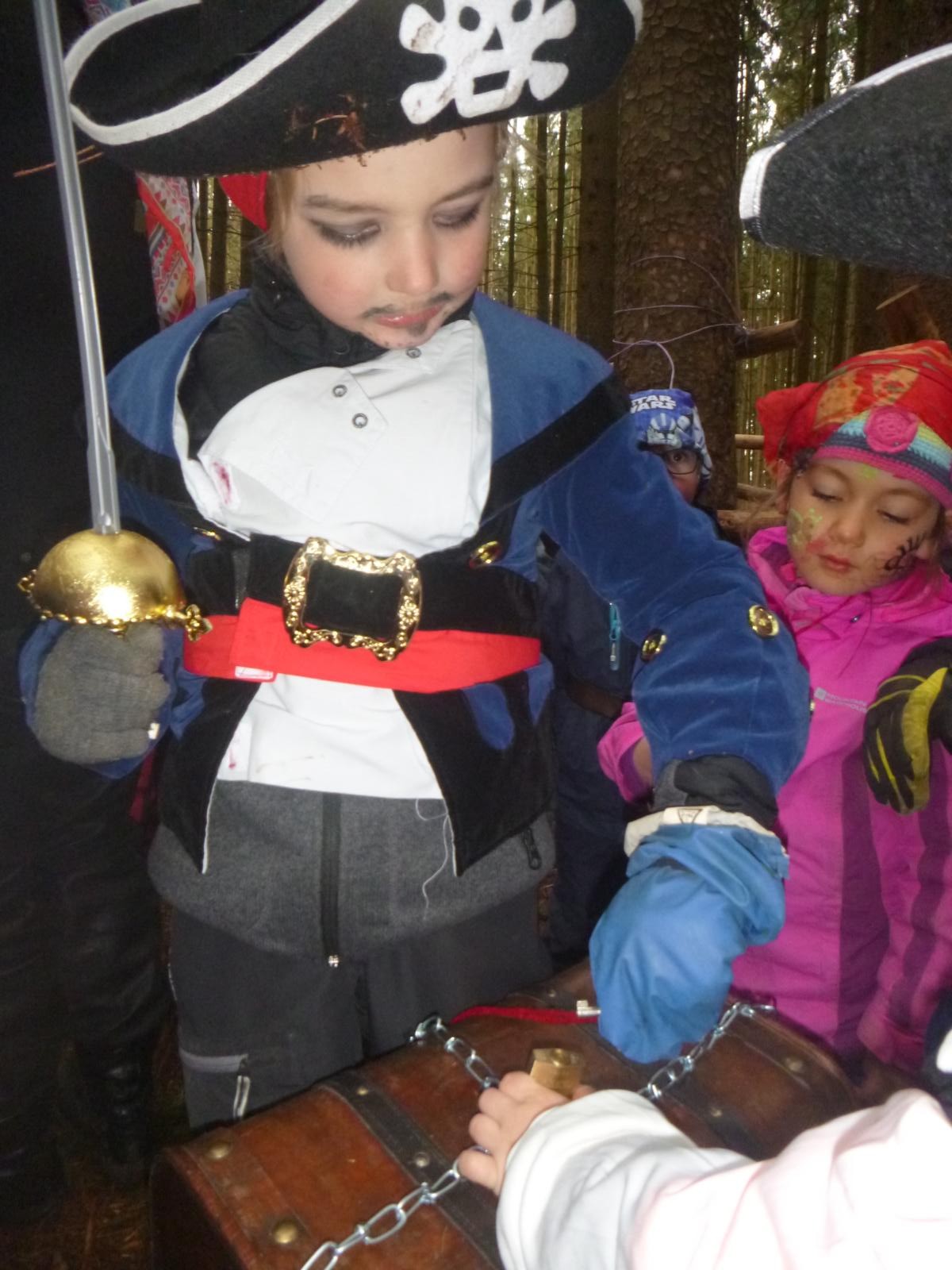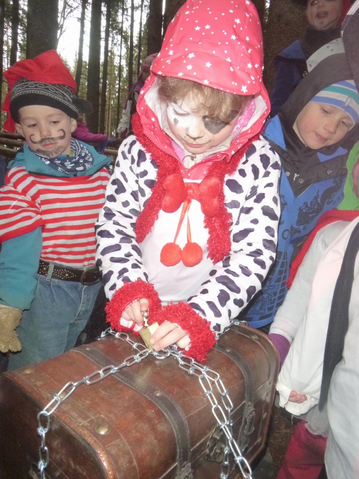 Umso größer war der Schreck, als am nächsten Tag das schöne neue Segel nicht mehr aufzufinden war. Doch Papagei Josefine fand schließlich einen Brief, in dem den Kindern ein Handel vorgeschlagen wurde. Käpt’n Holzauge und Steuermann Holzbein hatten das Segel gefunden und wollten es aber nur zurückgeben, wenn sich die Waldlauser im Gegenzug auf die Suche nach einer verschollenen Schatzkiste machten. Und so kam es, dass sich am nächsten Tag ein bunter Haufen aus Piraten, Hexen, Prinzessinnen, Rittern, Marienkäfern und Cowboys auf die Suche nach der Schatzkiste machten. Auf der Reise durch’s Piratenland warteten einige Aufgaben und Abenteuer, doch die Kinder waren recht motiviert und lösten die teils kniffligen Aufgaben an den einzelnen Stationen mit Mut, Witz und Ausdauer.
