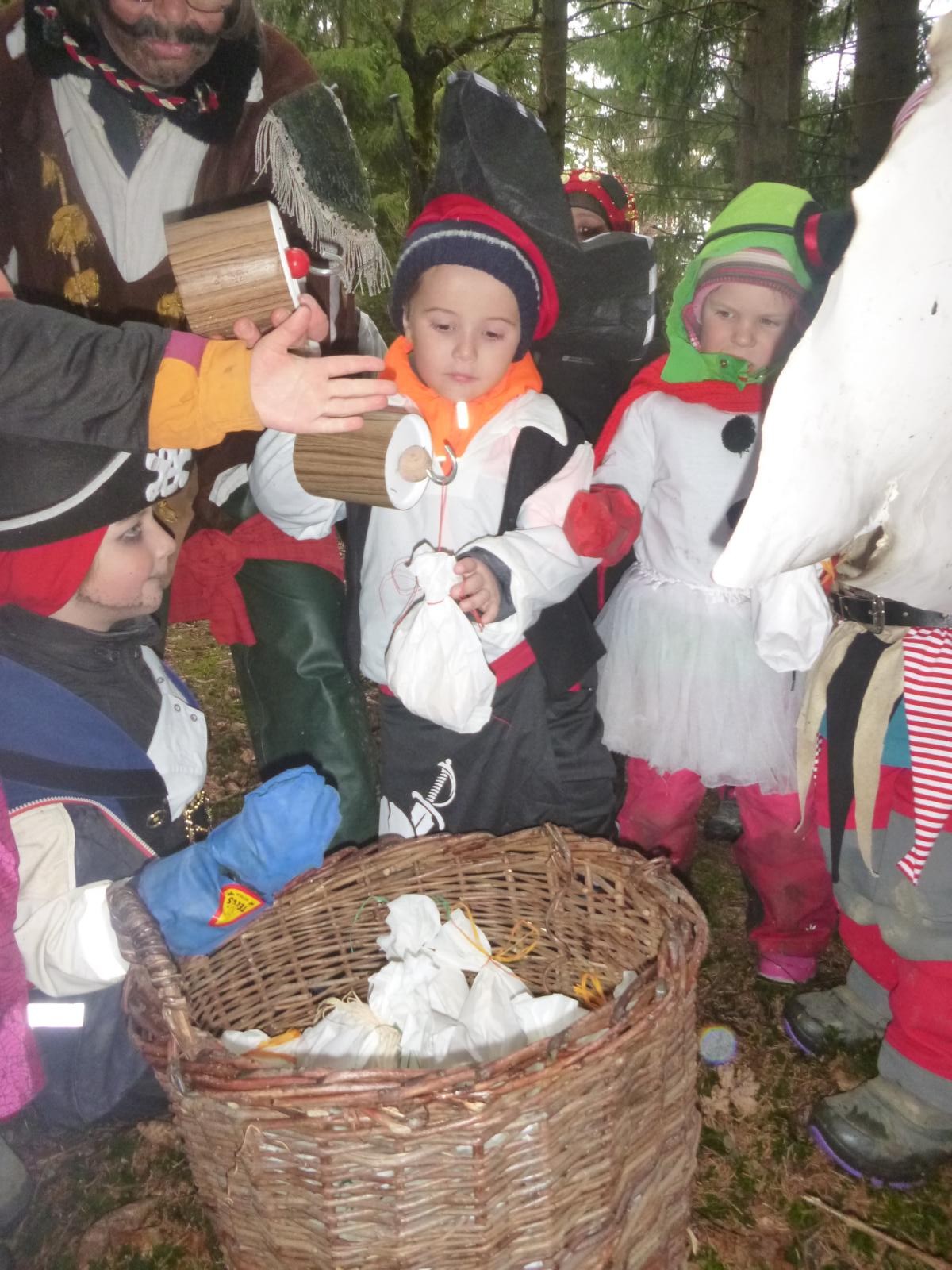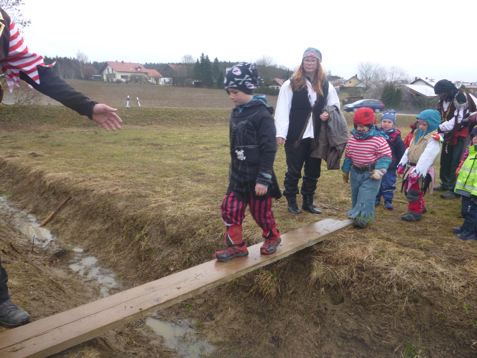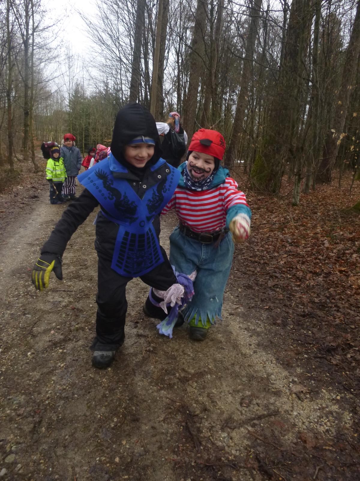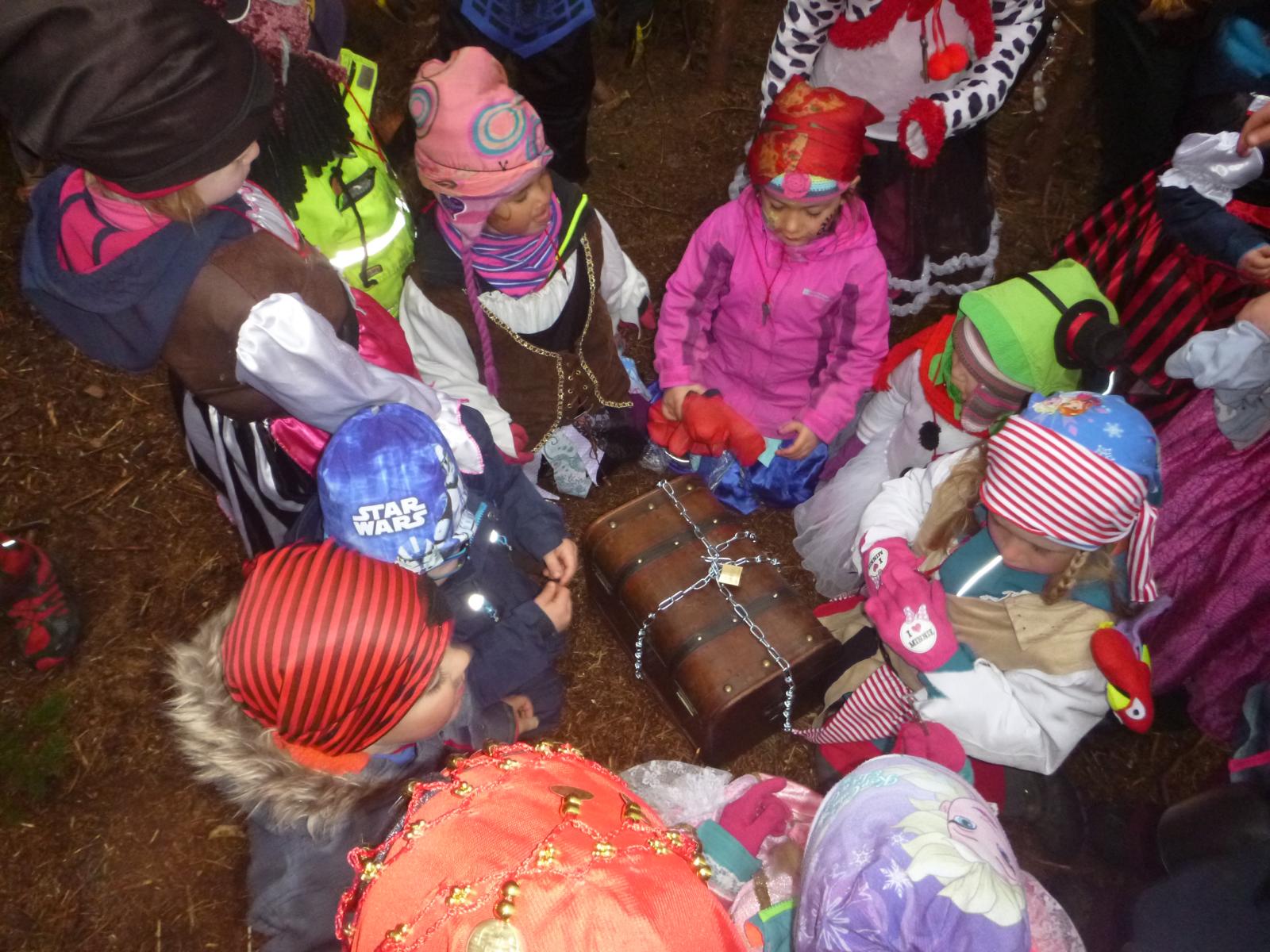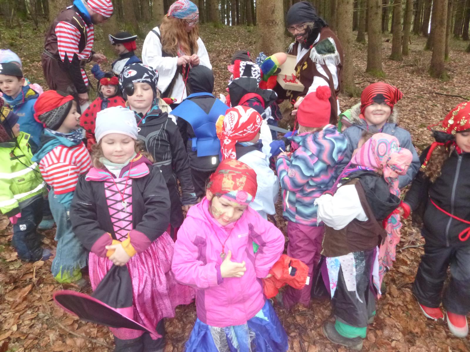 Umso größer war der Schreck, als am nächsten Tag das schöne neue Segel nicht mehr aufzufinden war. Doch Papagei Josefine fand schließlich einen Brief, in dem den Kindern ein Handel vorgeschlagen wurde. Käpt’n Holzauge und Steuermann Holzbein hatten das Segel gefunden und wollten es aber nur zurückgeben, wenn sich die Waldlauser im Gegenzug auf die Suche nach einer verschollenen Schatzkiste machten. Und so kam es, dass sich am nächsten Tag ein bunter Haufen aus Piraten, Hexen, Prinzessinnen, Rittern, Marienkäfern und Cowboys auf die Suche nach der Schatzkiste machten. Auf der Reise durch’s Piratenland warteten einige Aufgaben und Abenteuer, doch die Kinder waren recht motiviert und lösten die teils kniffligen Aufgaben an den einzelnen Stationen mit Mut, Witz und Ausdauer.