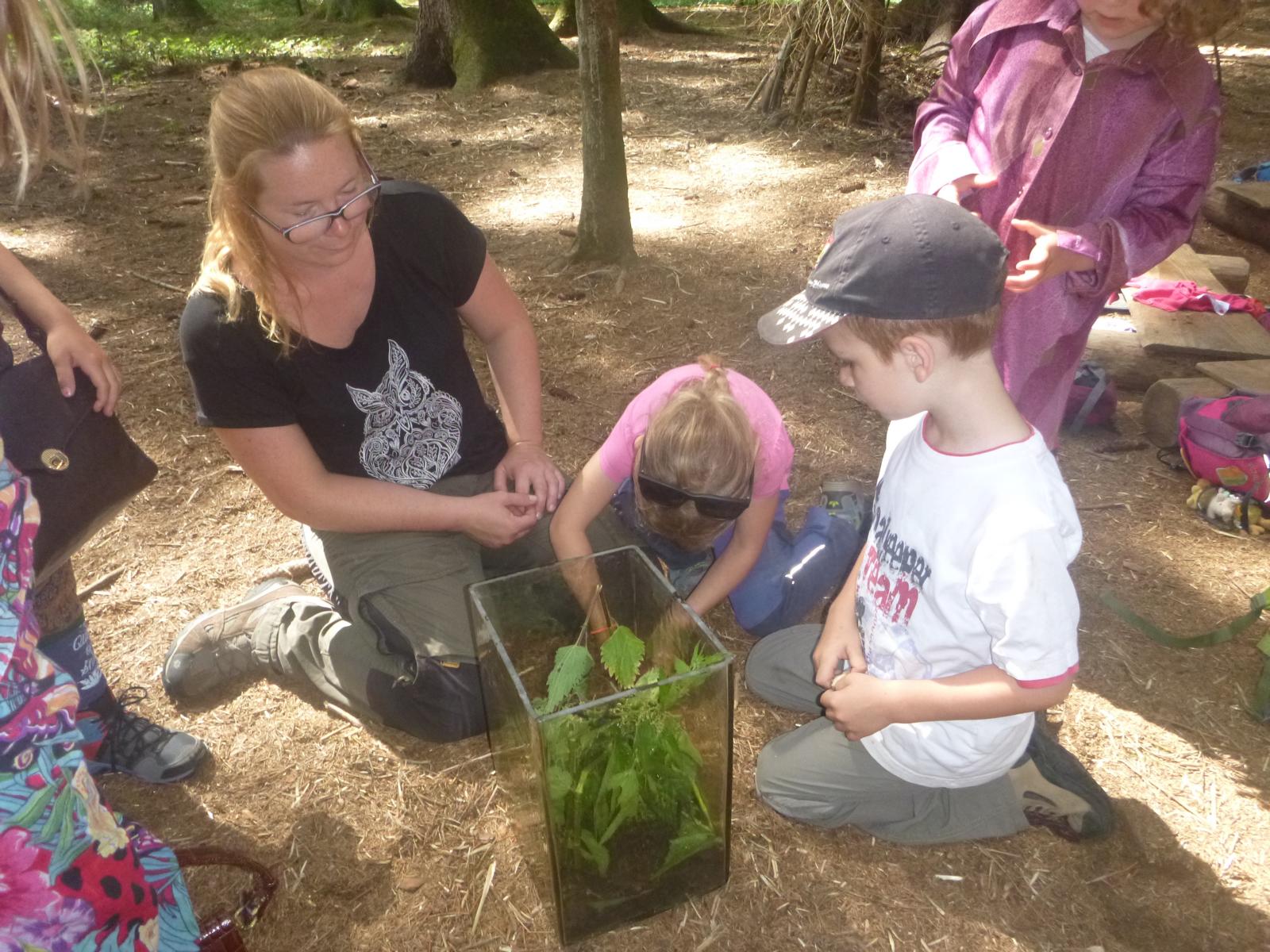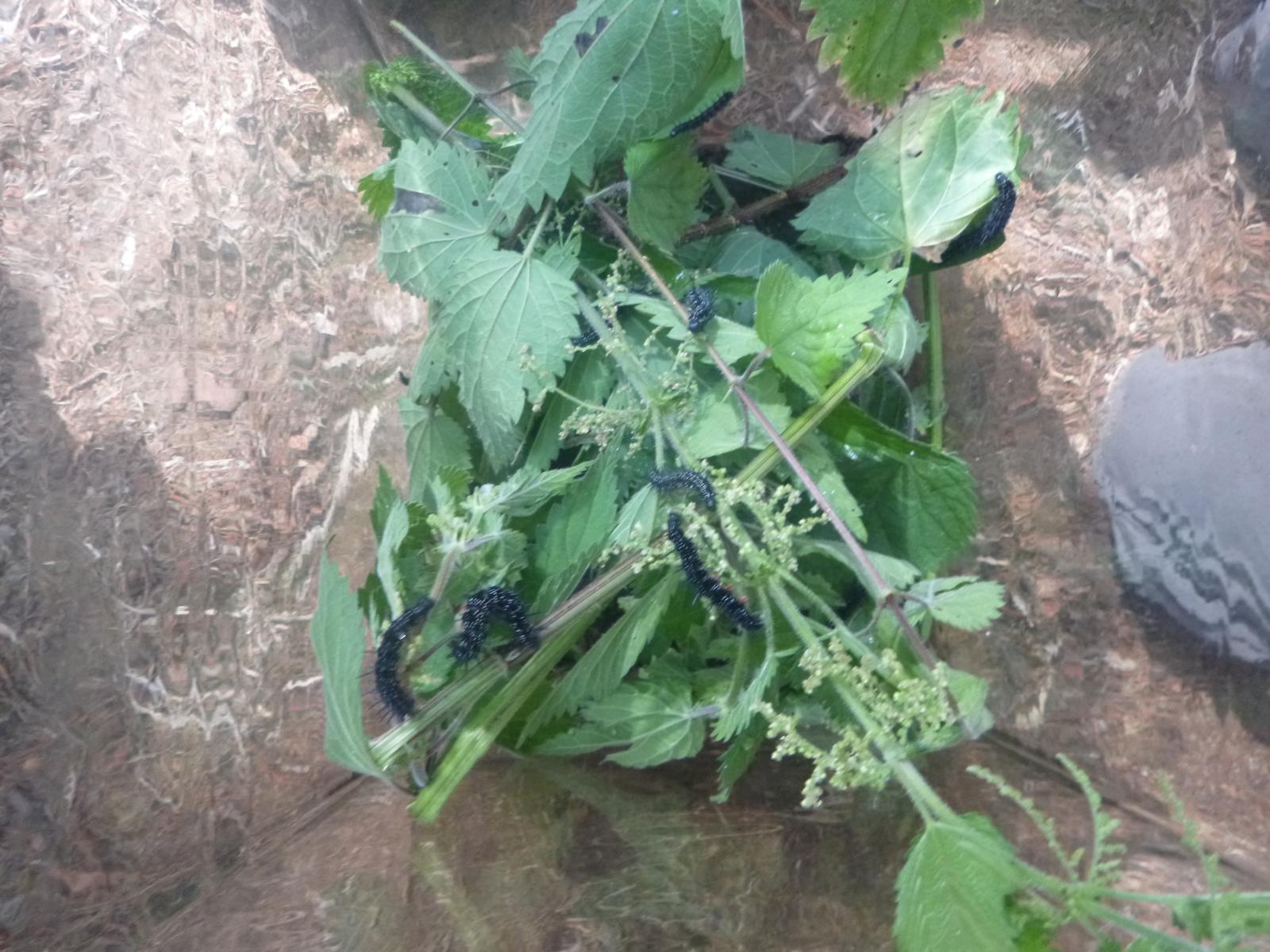Im zeitigen Frühjahr bereicherten die zarten ersten Triebe der Brennnessel unsere Waldküche und wanderten in die Frühlingskräutersuppe oder die Brennnesselpfannkuchen. Doch mittlerweile ist daraus ein richtiger Wald geworden, durch den sich die Waldlauser auf dem Weg zum Kletterbaum wagen und so mancher der kleinen Waldforscher würde die brennenden Pflanzen nur zu gerne mit seiner Astsense ummähen Doch bei genauerem Hinsehen entdeckten die Kinder vor kurzem ein paar neue Bewohner der Brennnesselpflanzen, glänzend schwarze Raupen, die ganz offensichtlich auch Geschmack an den Blättern hatten und sich daran gütlich taten. Nach einem Blick ins Bestimmungsbuch wussten die Kinder auch, mit wem sie es da zu tun hatten: den Raupen des Tagpfauenauges. Was wohl mit ihnen geschehen würde, wie lange sie noch Raupen wären? Schnell war die Idee geboren, die kleinen Tiere näher zu beobachten und das alte Aquarium, das im letzten Jahr noch die Kaulquappen beherbergt hatte, wurde zum Terrarium umfunktioniert. Erde und Brennnesselpflanzen kamen hinein und zum Schluss konnten die Raupen ihr vorrübergehendes Zuhause beziehen. Gespannt beobachten die Waldlauser jeden Tag, was nun geschieht. Die erste Raupe hat sich mittlerweile schon verpuppt und jetzt – jetzt warten wir auf die Schmetterlinge!