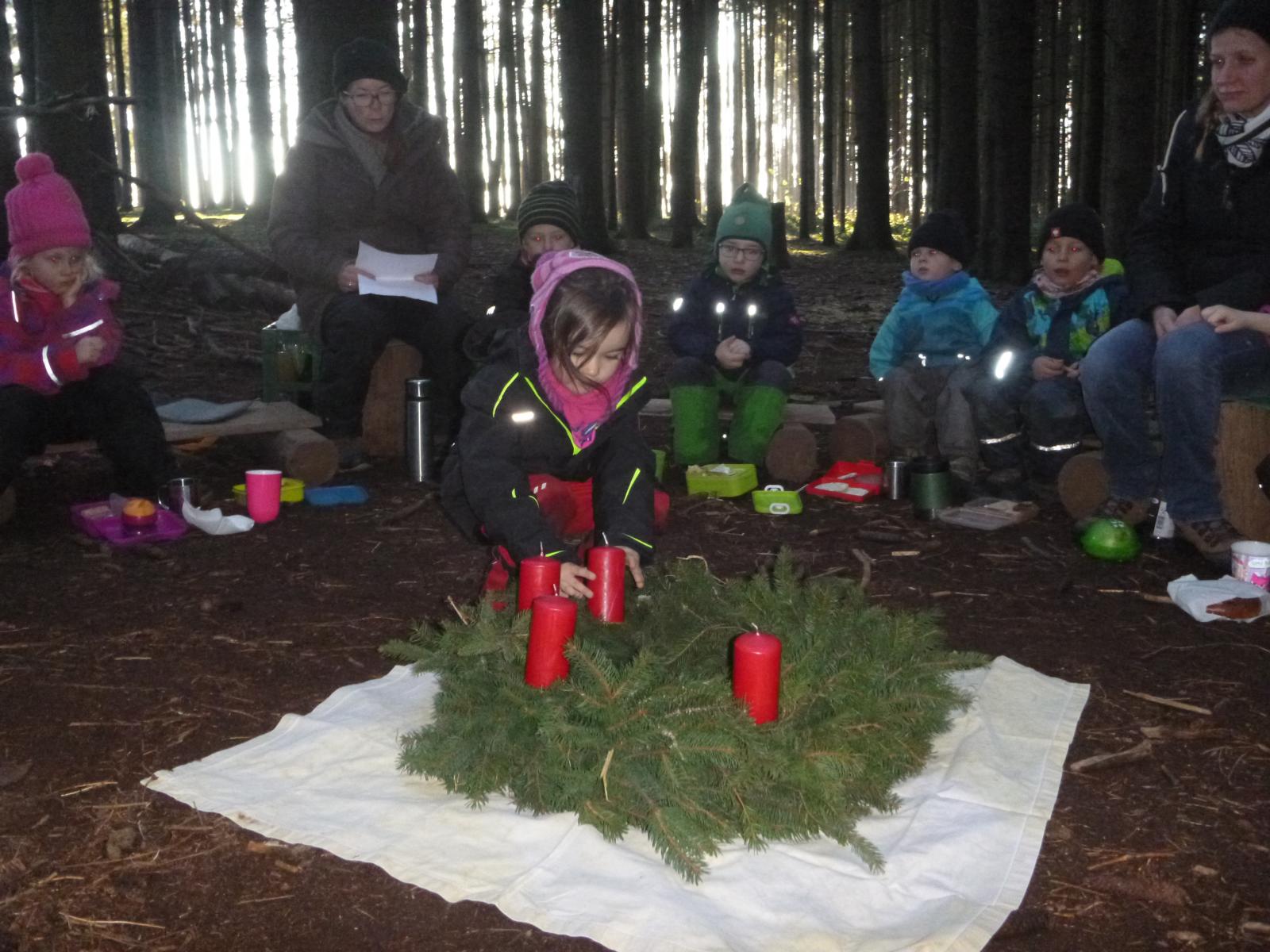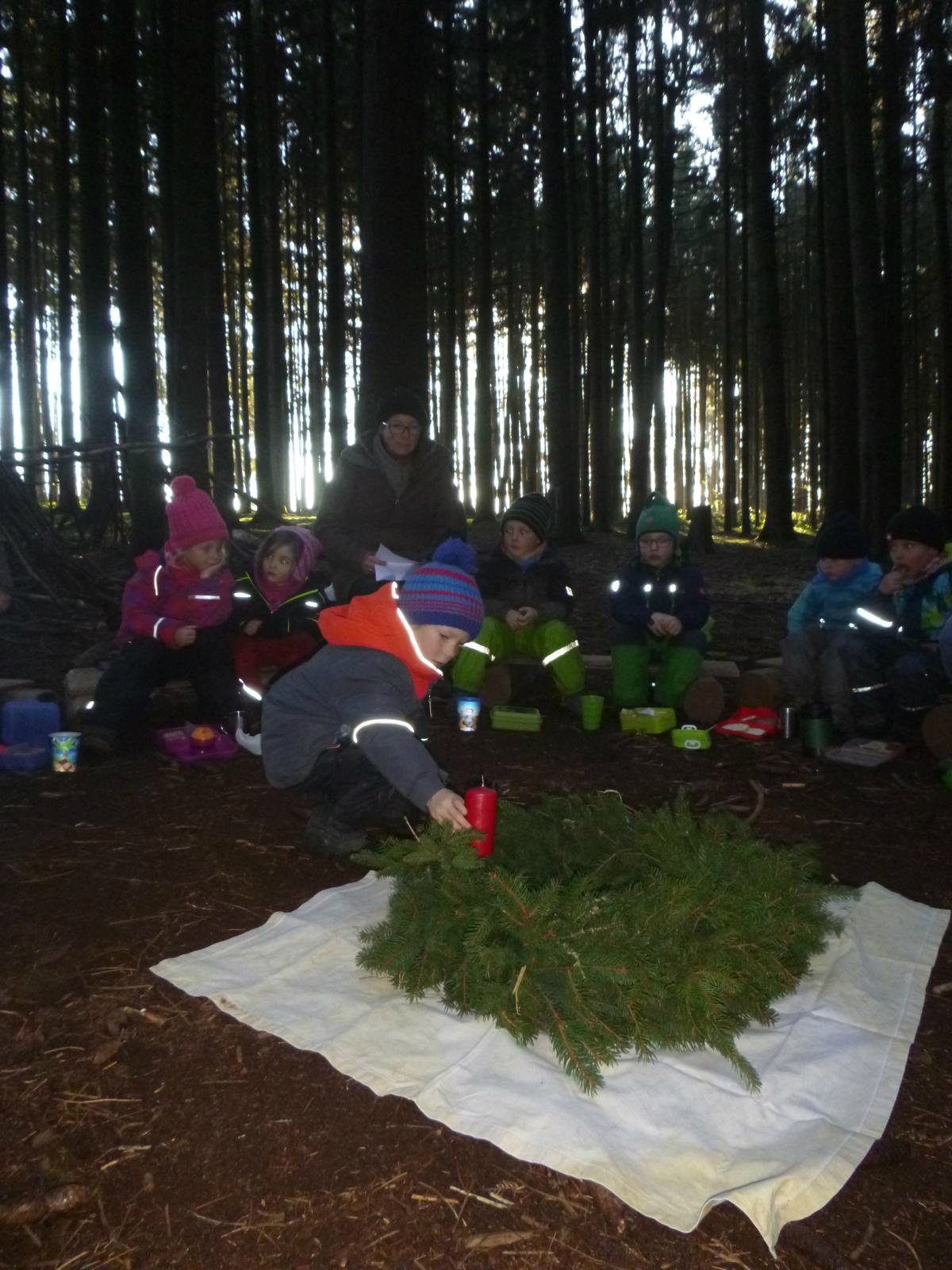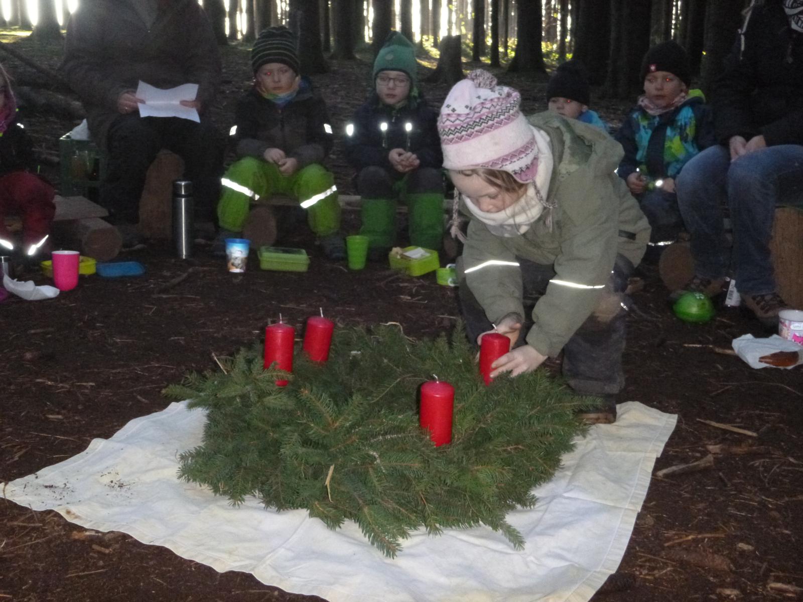 Gemeinsam hatten wir mit den Kindern in den letzten Tagen einen mächtigen Adventskranz gebunden. Beim Zweigerlsammeln, zurechtschneiden und zusammenbinden waren viele helfende Hände gefragt. Nun mussten nur noch die roten Kerzen und ein paar Zapfen an den richtigen Platz gebracht werden. Mit einem kleinen Lichterritual wurden dann jeden Tag zur Brotzeit  die Kerzen entzündet, Lieder gesungen und viele Geschichten erzählt. In dieser heimeligen Runde fällt das Warten auf's Christkind nicht gar so schwer.