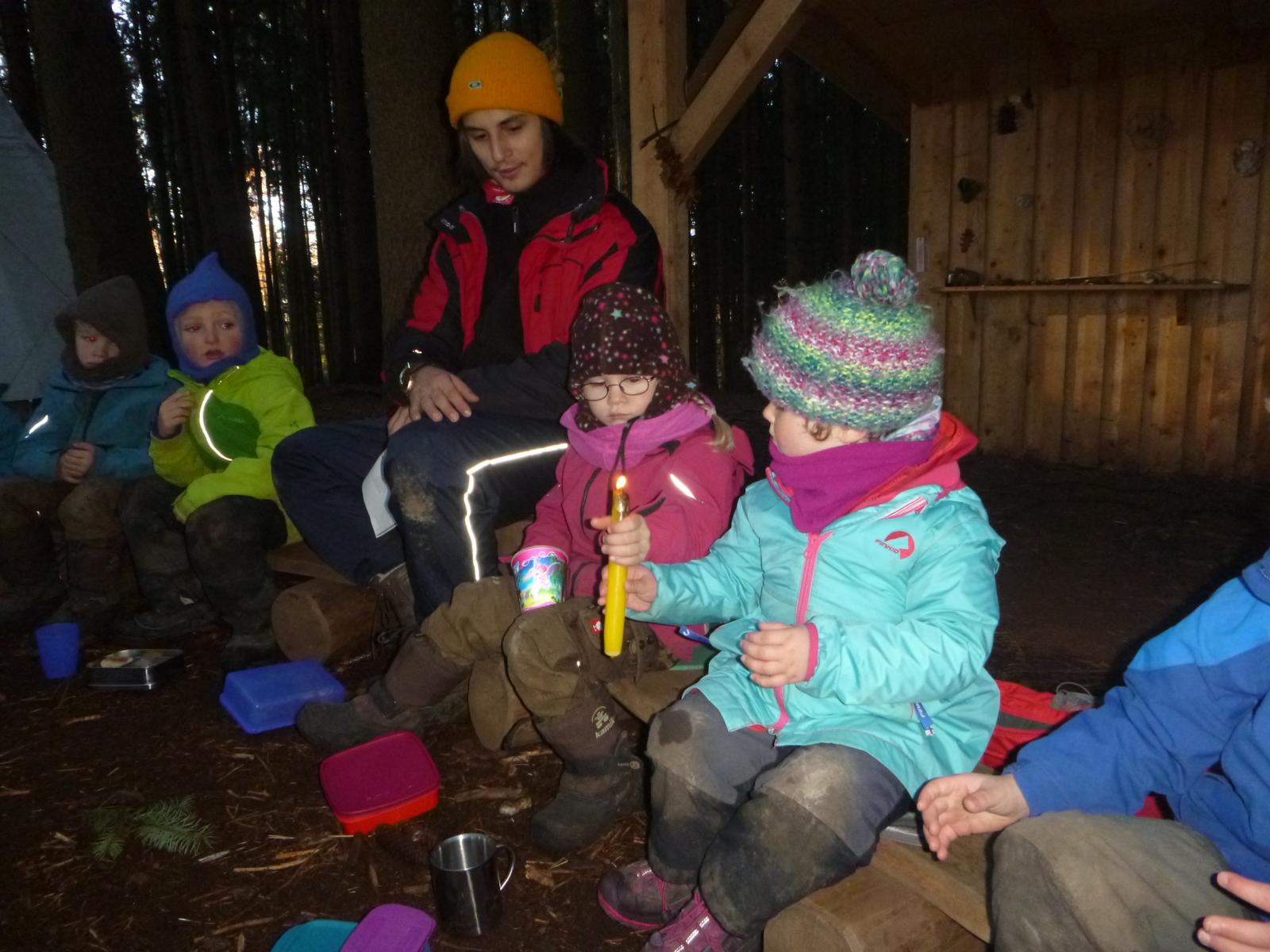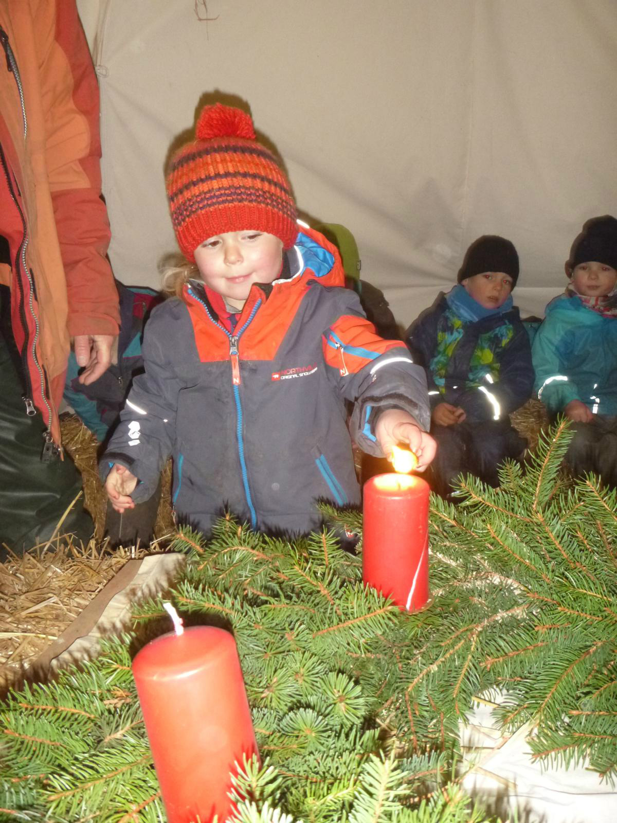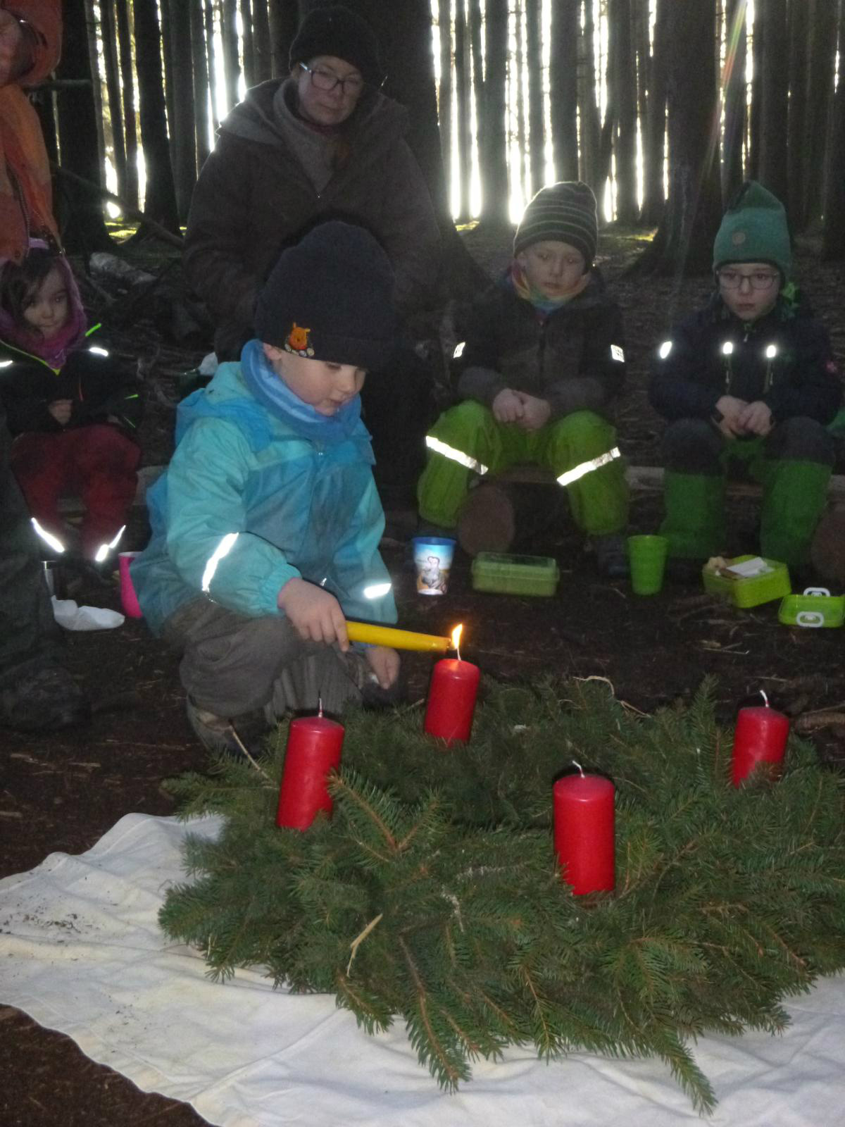 Gemeinsam hatten wir mit den Kindern in den letzten Tagen einen mächtigen Adventskranz gebunden. Beim Zweigerlsammeln, zurechtschneiden und zusammenbinden waren viele helfende Hände gefragt. Nun mussten nur noch die roten Kerzen und ein paar Zapfen an den richtigen Platz gebracht werden. Mit einem kleinen Lichterritual wurden dann jeden Tag zur Brotzeit  die Kerzen entzündet, Lieder gesungen und viele Geschichten erzählt. In dieser heimeligen Runde fällt das Warten auf's Christkind nicht gar so schwer.