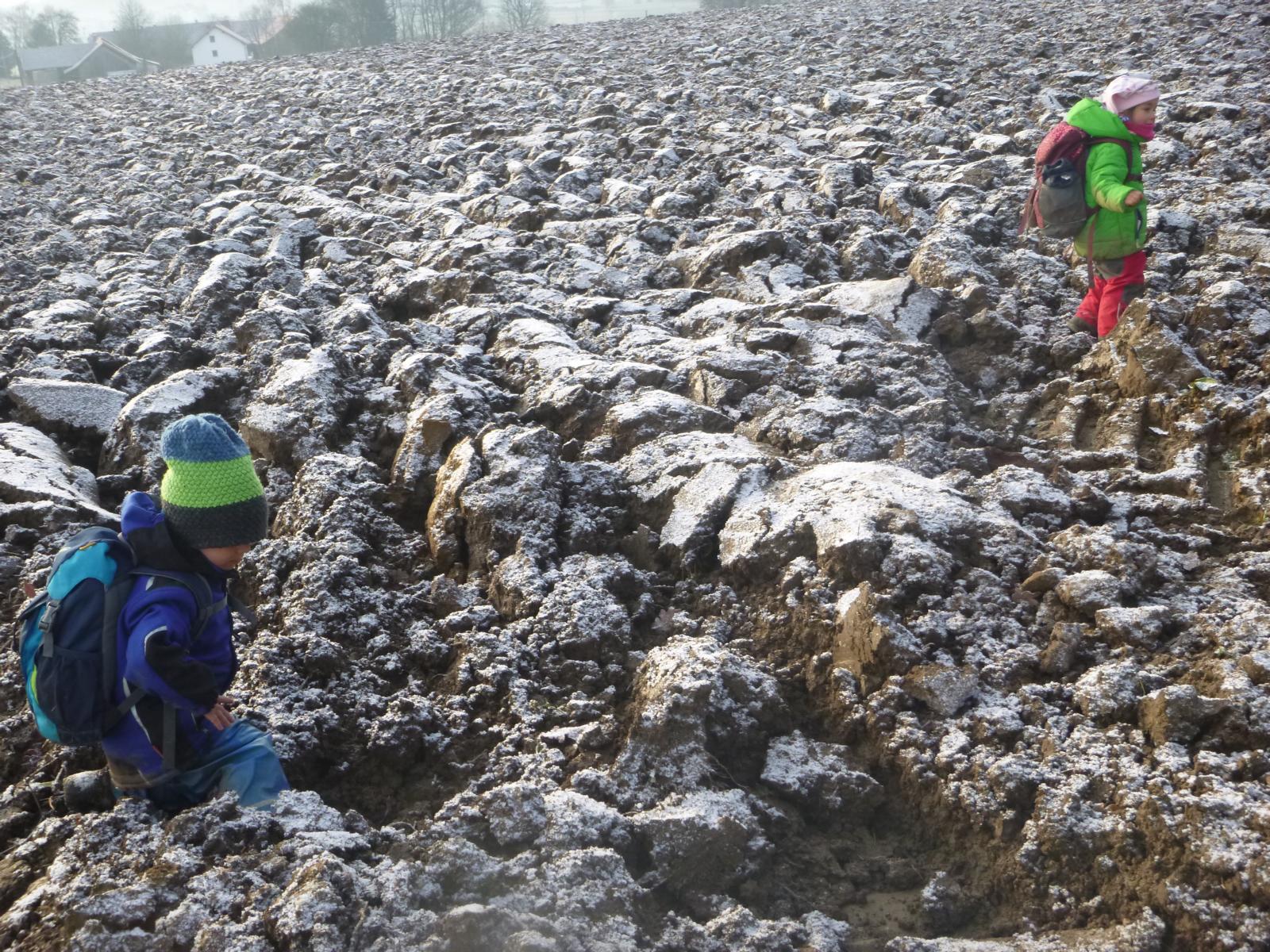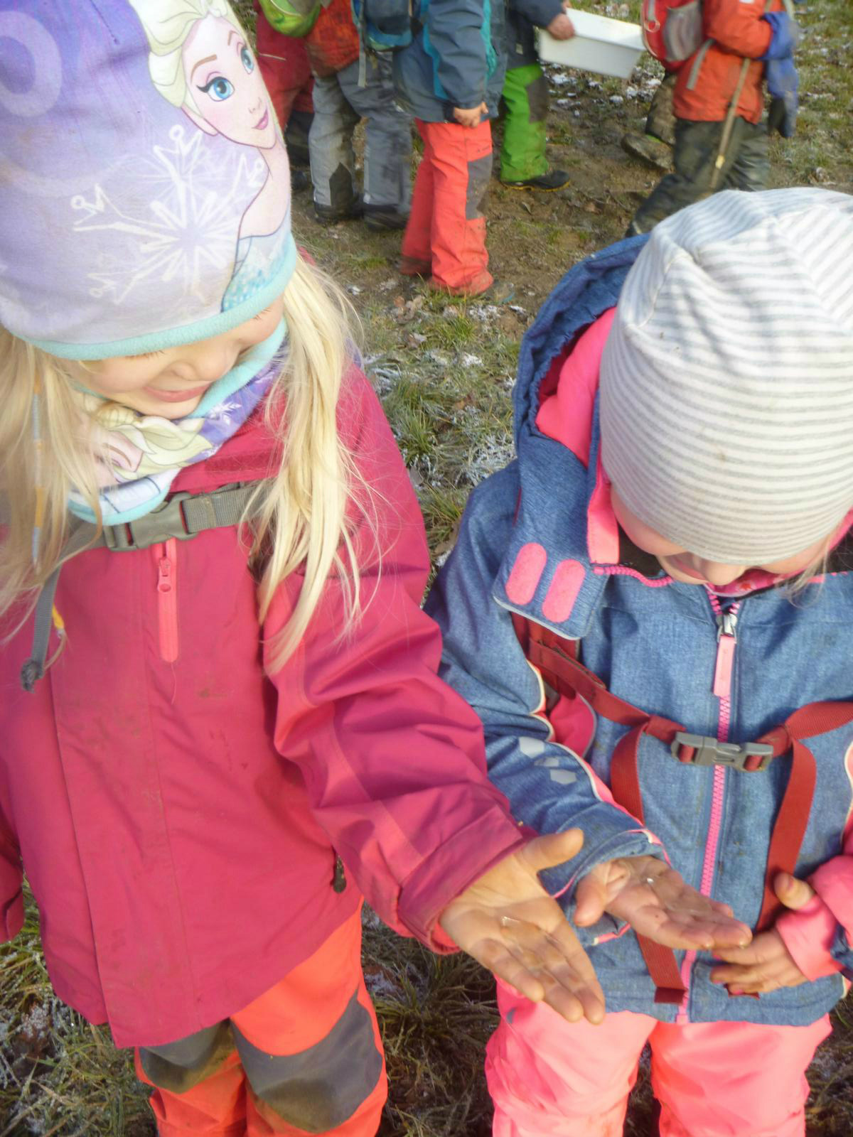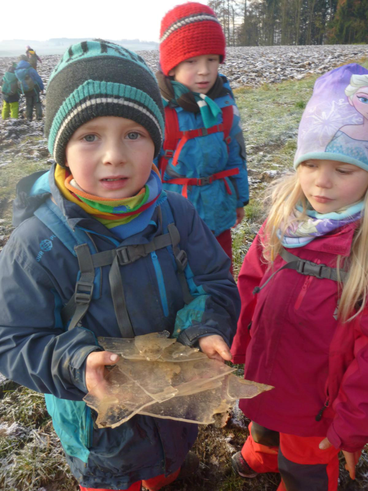 Hartnäckig hatten die Kinder in den letzten Tagen gesungen, und nun war der langersehnte Schnee pünktlich zum 1. Advent gekommen. In den Tagen davor hatten die Kinder schon die frostigen Vorboten gesammelt: Pfützeneis, Blätter mit prachtvollem Raureif und gefrorene Wassertropfen von den Zweigen.