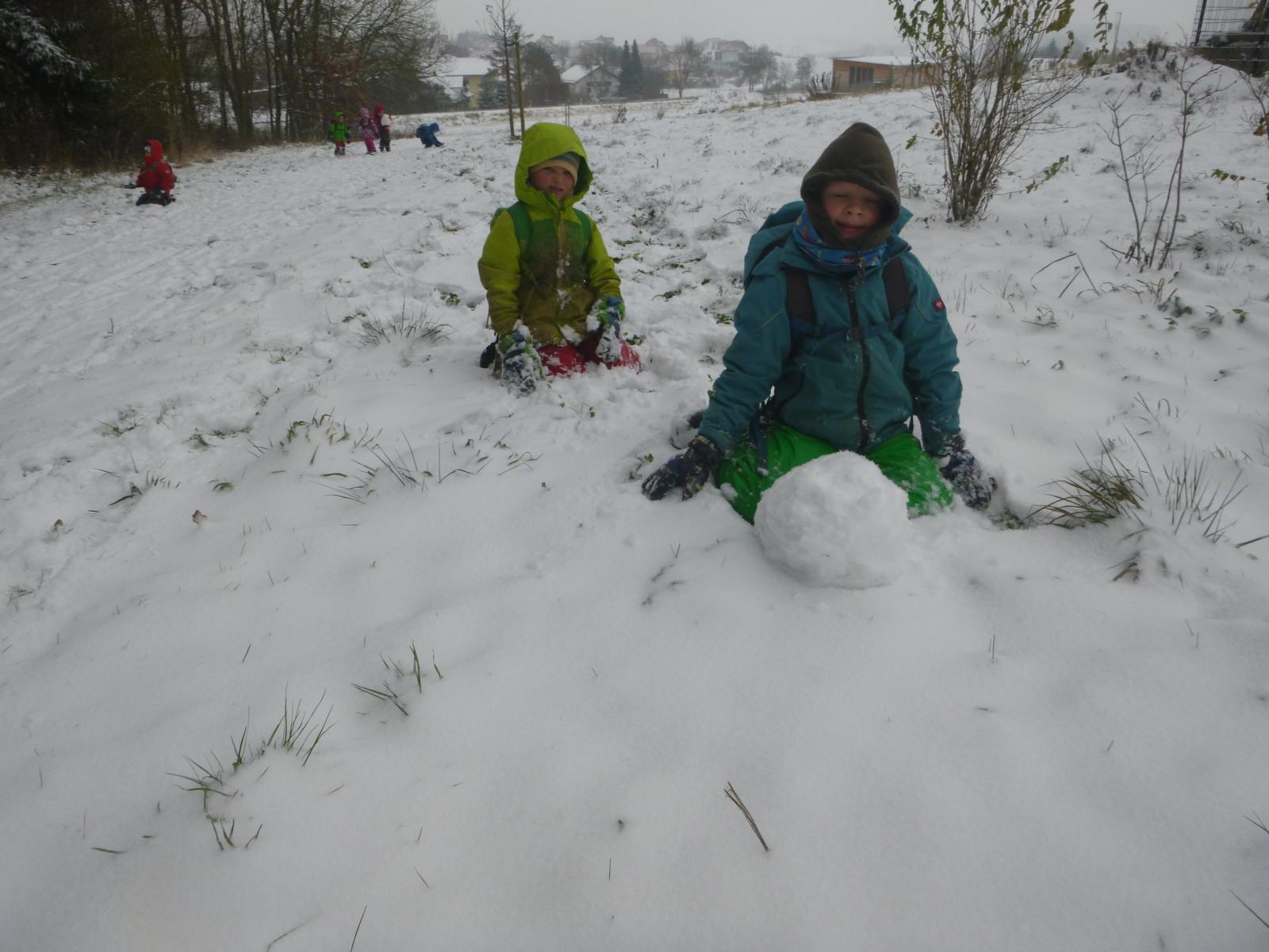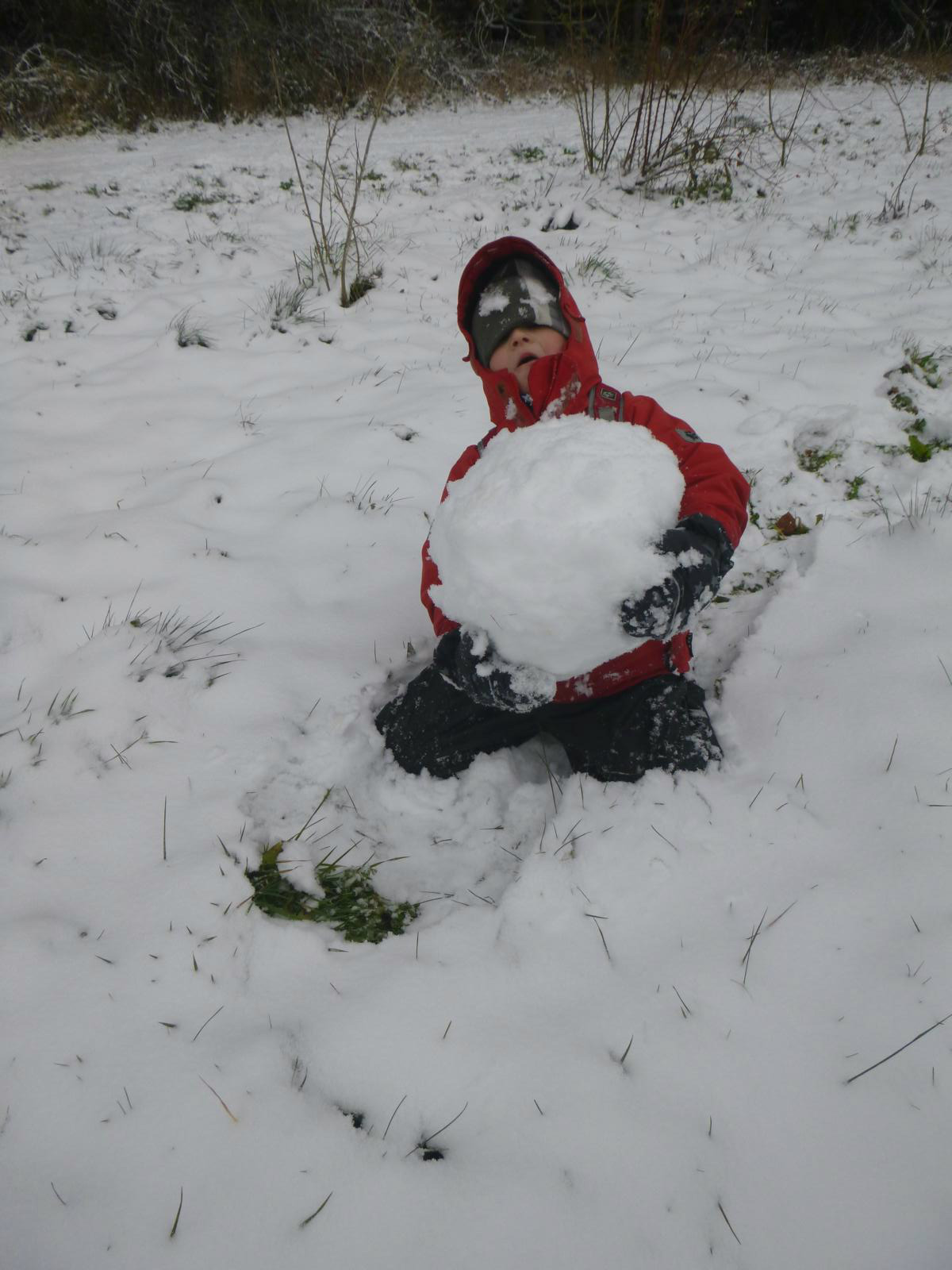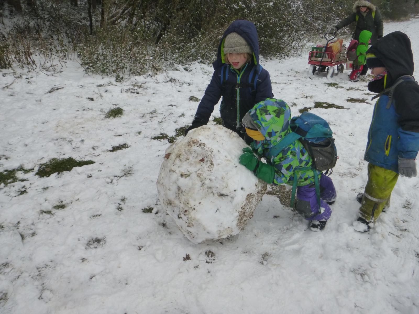 Doch echter Schnee ist natürlich viel besser. Und so zieht sich der Weg in den Wald am ersten richtigen Wintertag gewaltig in die Länge – aus den ersten Schneebällen entstanden nach und nach riesige Schneekugeln. Die wurden – auf den Knien rutschend – zum Waldrand gerollt und warten nun dort auf ihre weitere Verwendung als Schneemänner, Schneethron oder Iglowand. Und die Kinder singen weiter „Schneeflöckchen, Weißröckchen“, damit ihnen in diesem Winter nicht so schnell das Baumaterial ausgeht….
