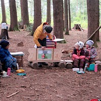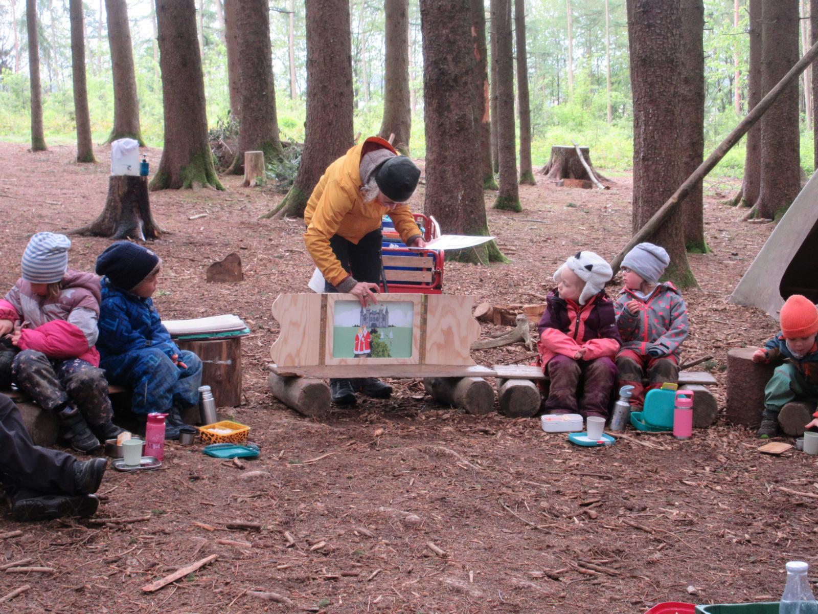 Am selben Tag kam auch Christl unsere "Büchereifrau" mit einem ganzen Bollerwagen voll Büchern zu uns an den Moosplatz. Während wir gemütlich Brotzeit machten, las sie uns "die Geschichte von Prinz Seltsam" vor. Sie hatte dafür sogar Ihr "Kamishibai" ein kleines "Buchtheater" dabei.