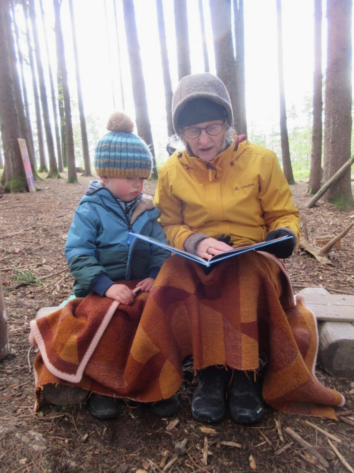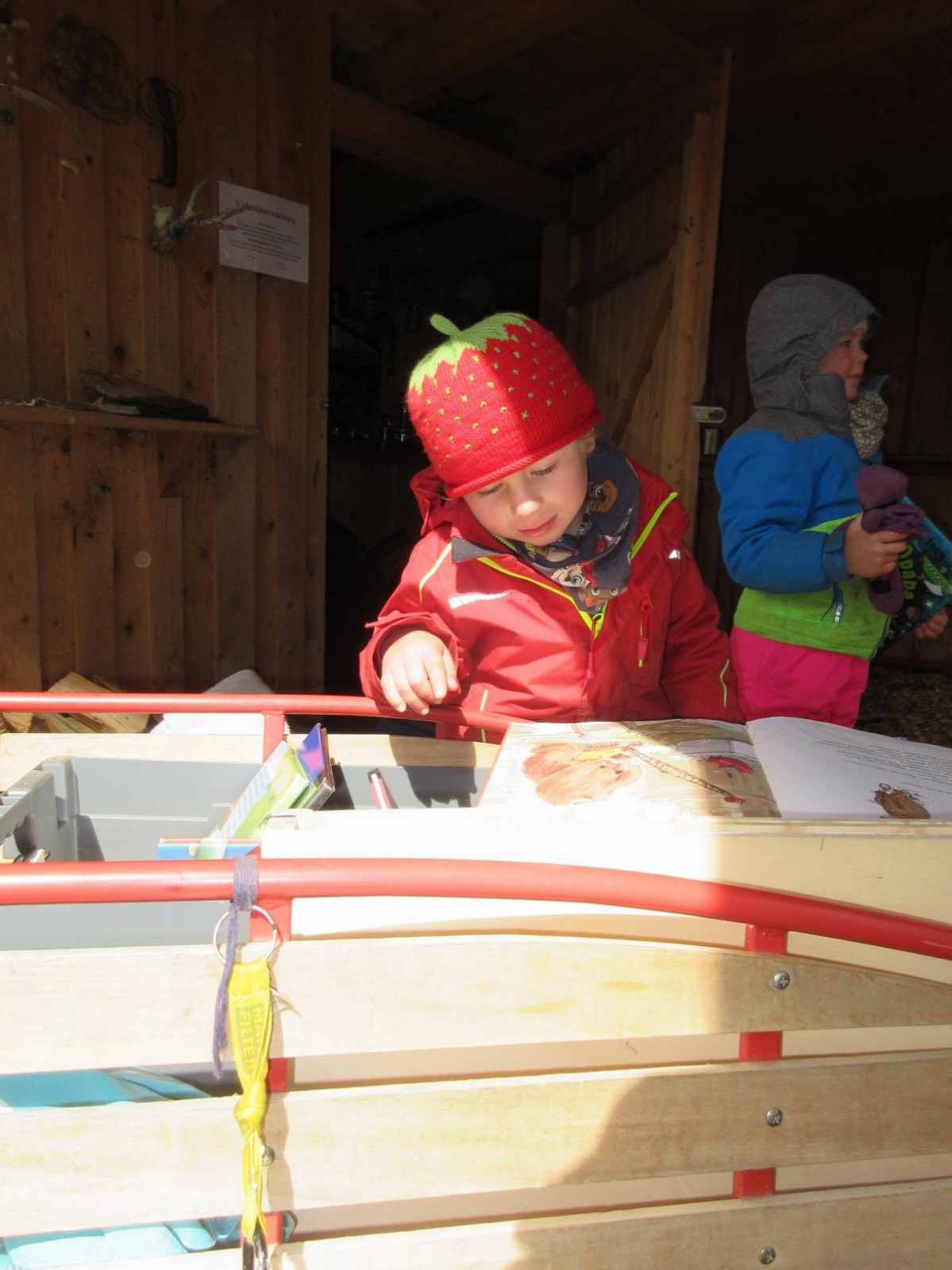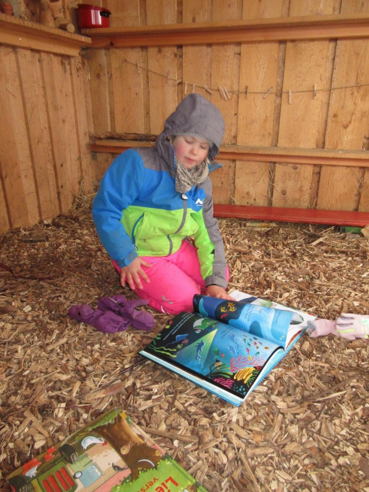Nach der Brotzeit, wurde in Decken gekuschelt, viele Bücher gelesen und angeschaut. Denn der April zeigte an diesem Tage, was er alles so will und so schien mal die Sonne, es graupelte und der Wind pfiff uns um die Ohren. Aber alle waren sich am Schluss einig und fragten gleich: " Christl, wann kommst du uns wieder besuchen?"