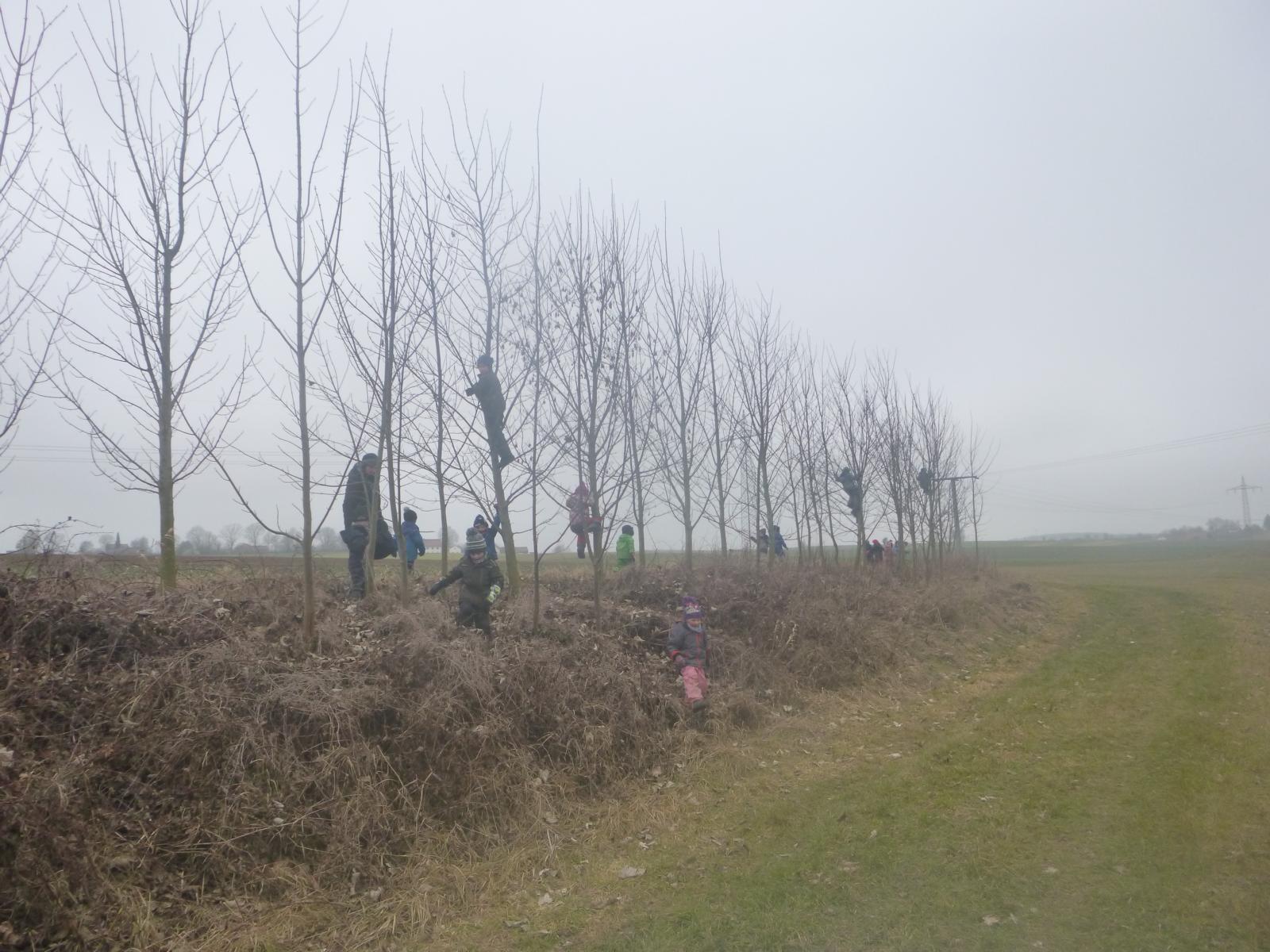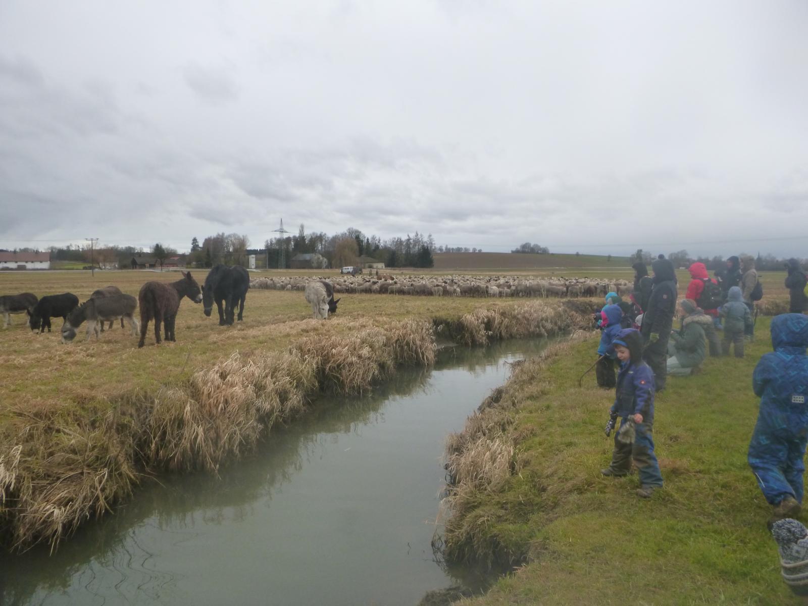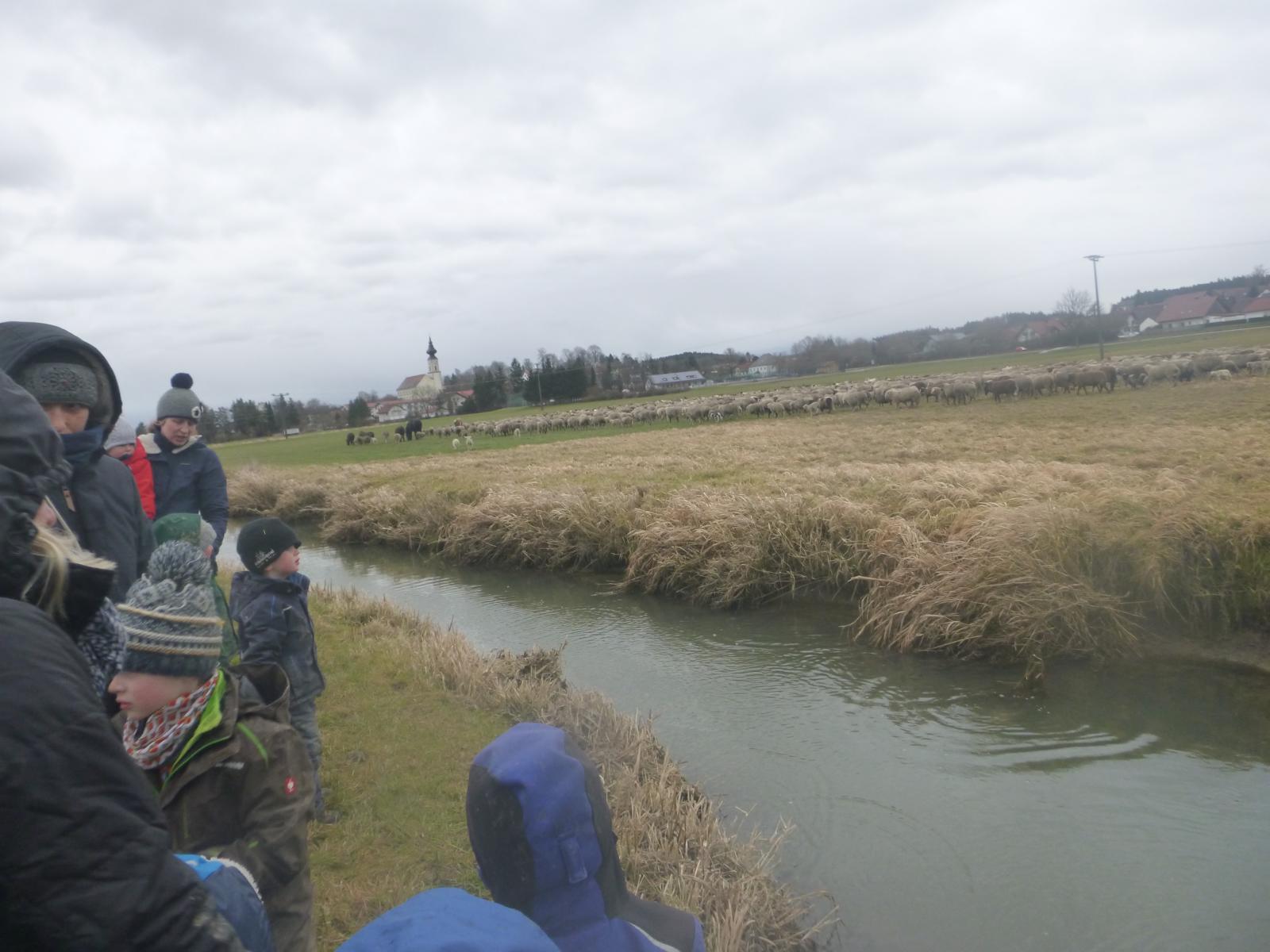 Jedes Jahr auf‘s Neue freuen sich die Waldlauser auf die durch’s Vilstal ziehende Schafherde. Nach der ersten vagen Meldung, die Schafe seien schon bei Münchsdorf gesehen worden, machten sich die Kinder auf den Weg vom Lausbacher Holz hinunter auf die Vilswiesen – doch weit und breit war kein Schaf zu entdecken. Statt dessen wurden Maulwurfshügel erkundet, Mäusegänge verfolgt und tatsächlich schon der erste blühende Löwenzahn im Januar entdeckt.