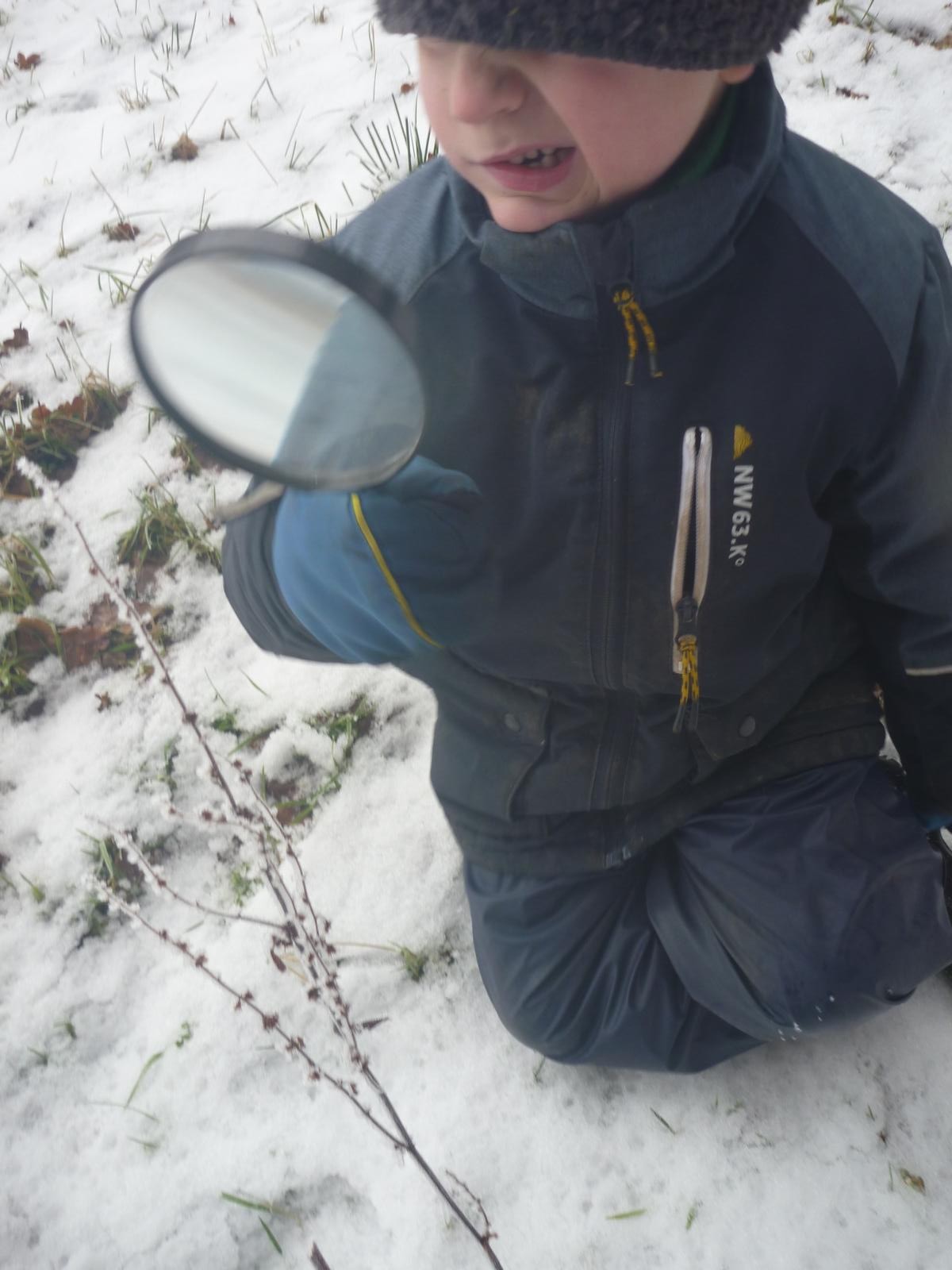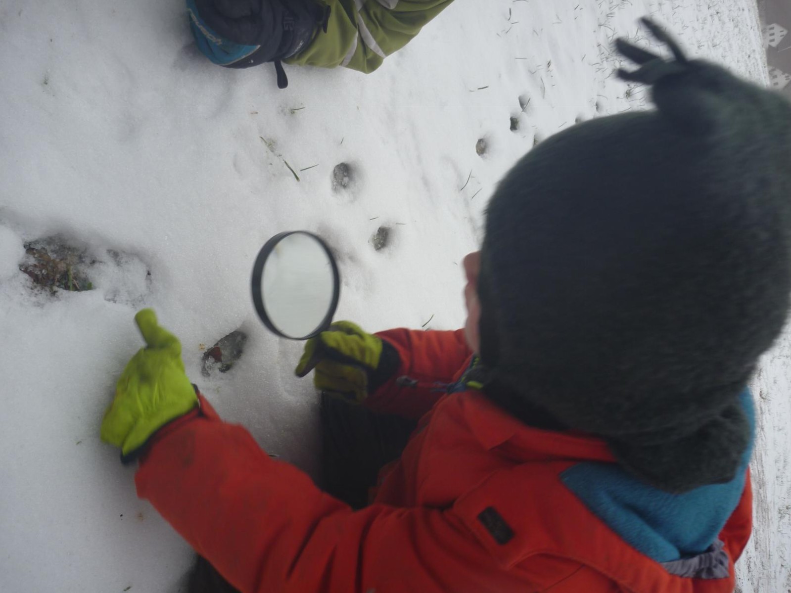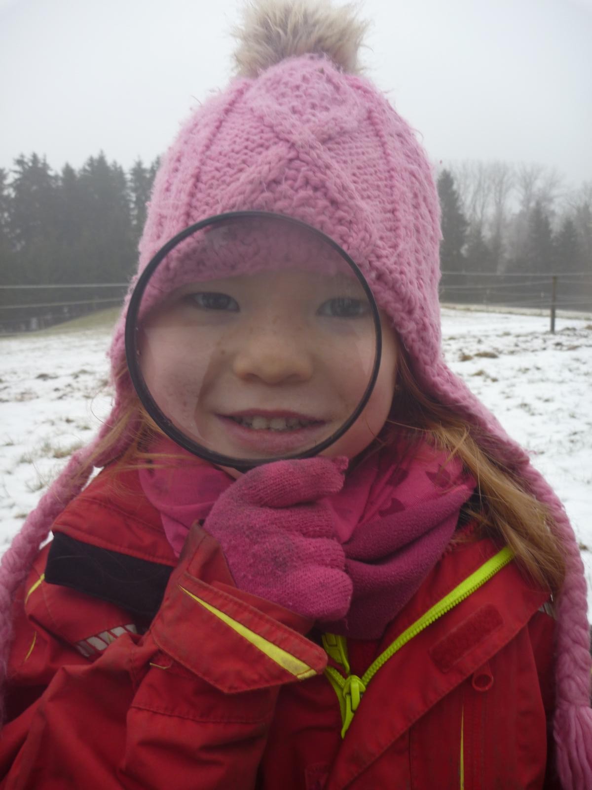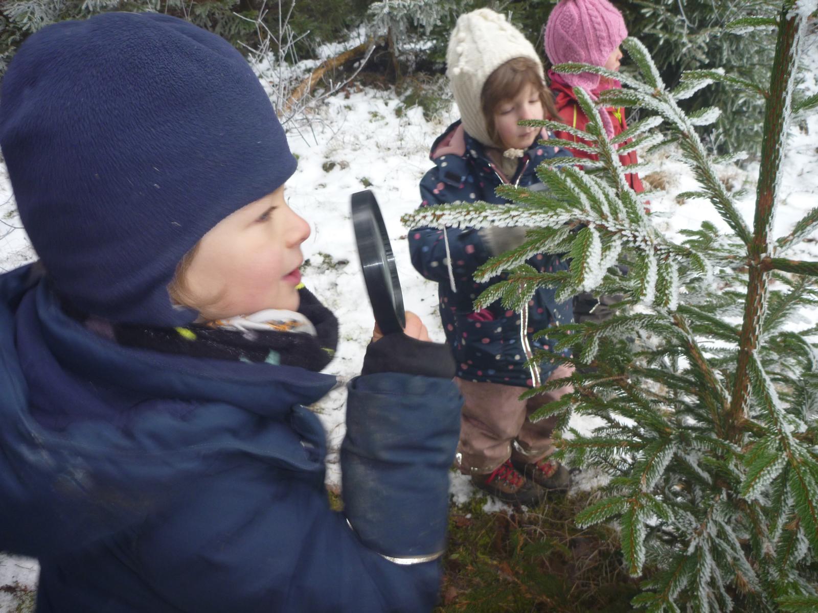 Dass der Frost nicht nur in die Nase kneift, sondern auch den Wald verzaubern kann, erleben die Kinder an manchem kalten Morgen mit Staunen: Bäume, Gräser und Moos sind mit filigranen Eisnadeln überzogen. Unter der Lupe entfaltet sich diese Eispracht in ihrer ganzen Vielfältigkeit. Die Sonne lässt die Eiskristalle wie Edelsteine funkeln und hat sie aber auch bis zum Mittag schon wieder zum Schmelzen gebracht. Vergängliche Schönheit!
