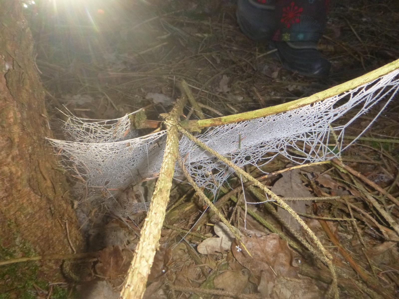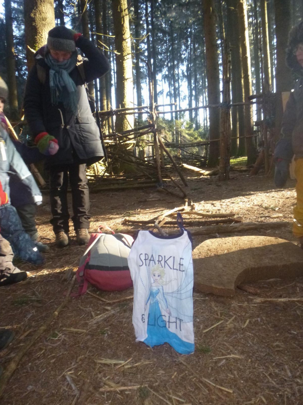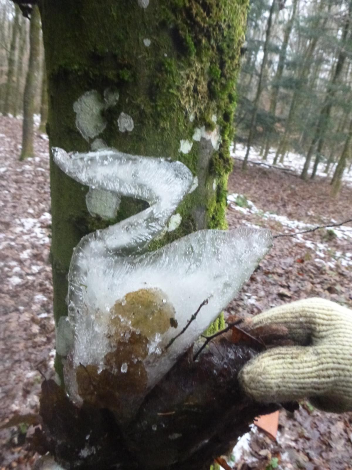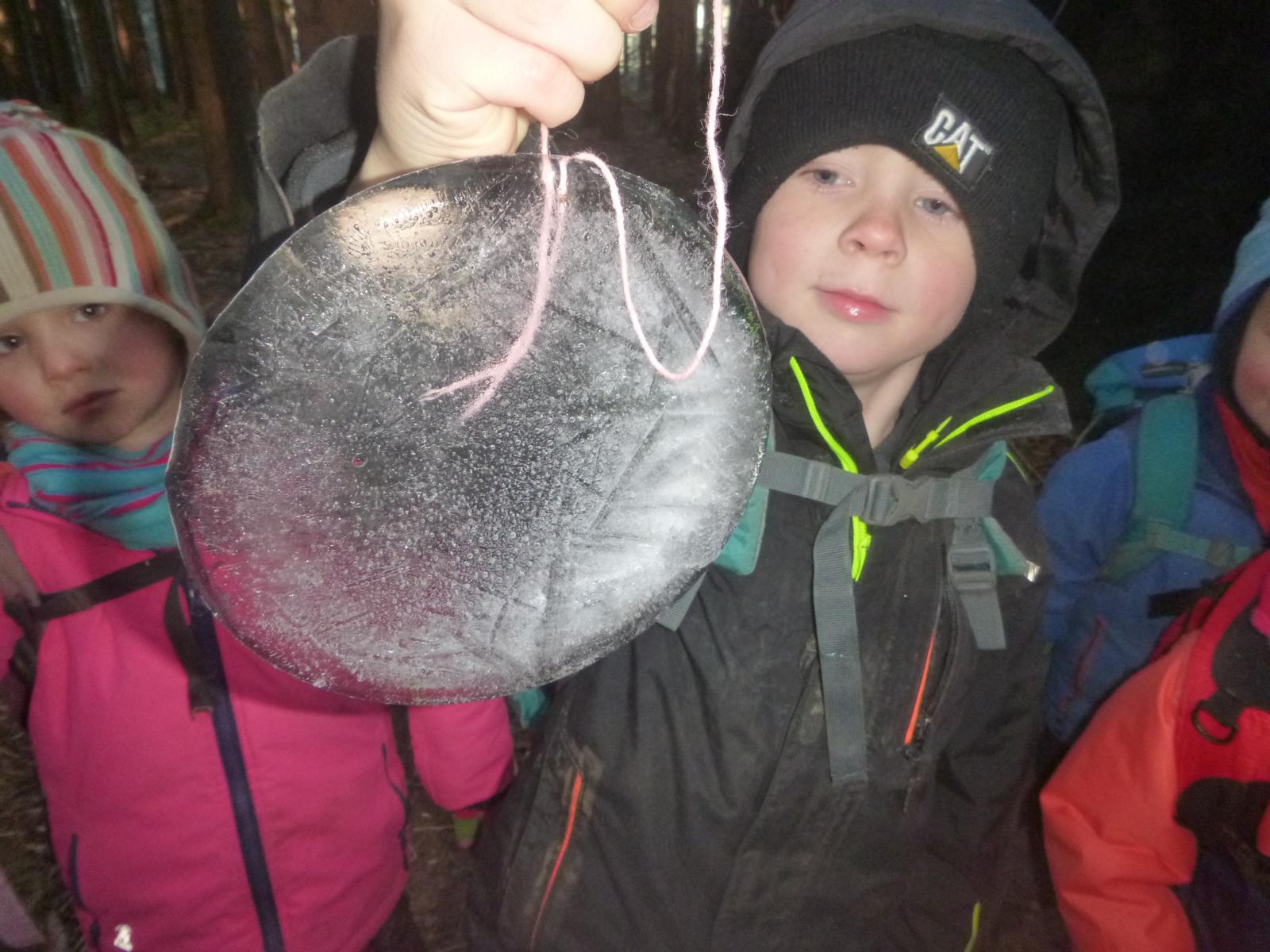 Die Kälte ließ nasse Handtücher und Unterhemden brettelsteif frieren und die Kinder waren erstaunt und höchst amüsiert, das so ein Hemd auf einmal stehen kann…Und auch die zugefrorenen Pfützen präsentierten so manches interessante Eisstück. Mit Einlagen, mit eingefrorenen Luftblasen, besonderen Rillen und Vertiefungen und vielem mehr. Und eine besonders kalte Nacht lies dann endlich die mit Wasser gefüllte Flasche bersten und die Waldlauser staunen, welche Kraft das gefrorene Wasser entwickelt.