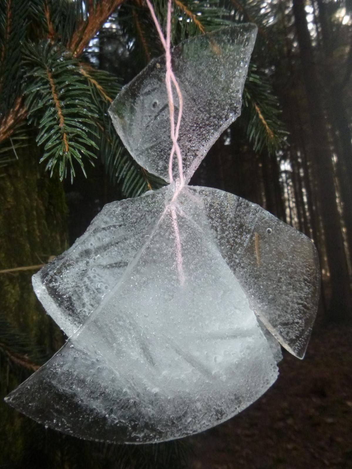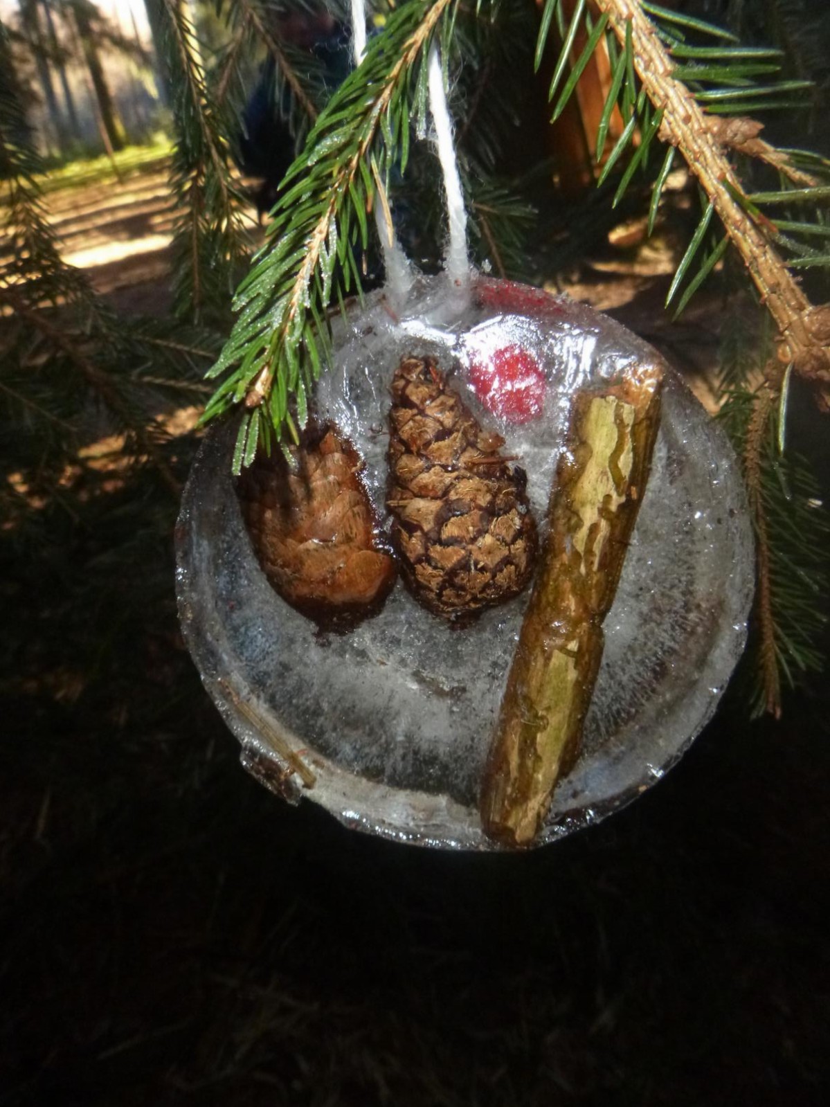 Nur einige eiskalte Tage mit Minustemperaturen waren nötig, um die Waldlauser zu Eisforschern werden zu lassen. In aufgestellten Schüsserln und Tellern gefror das Wasser über Nacht und konnte am nächsten Tag als glitzernder Eisschmuck an die Bäume gehangen werden. Eingefrorenes Naturmaterial wirkte dann wie kleine Kunstwerke.