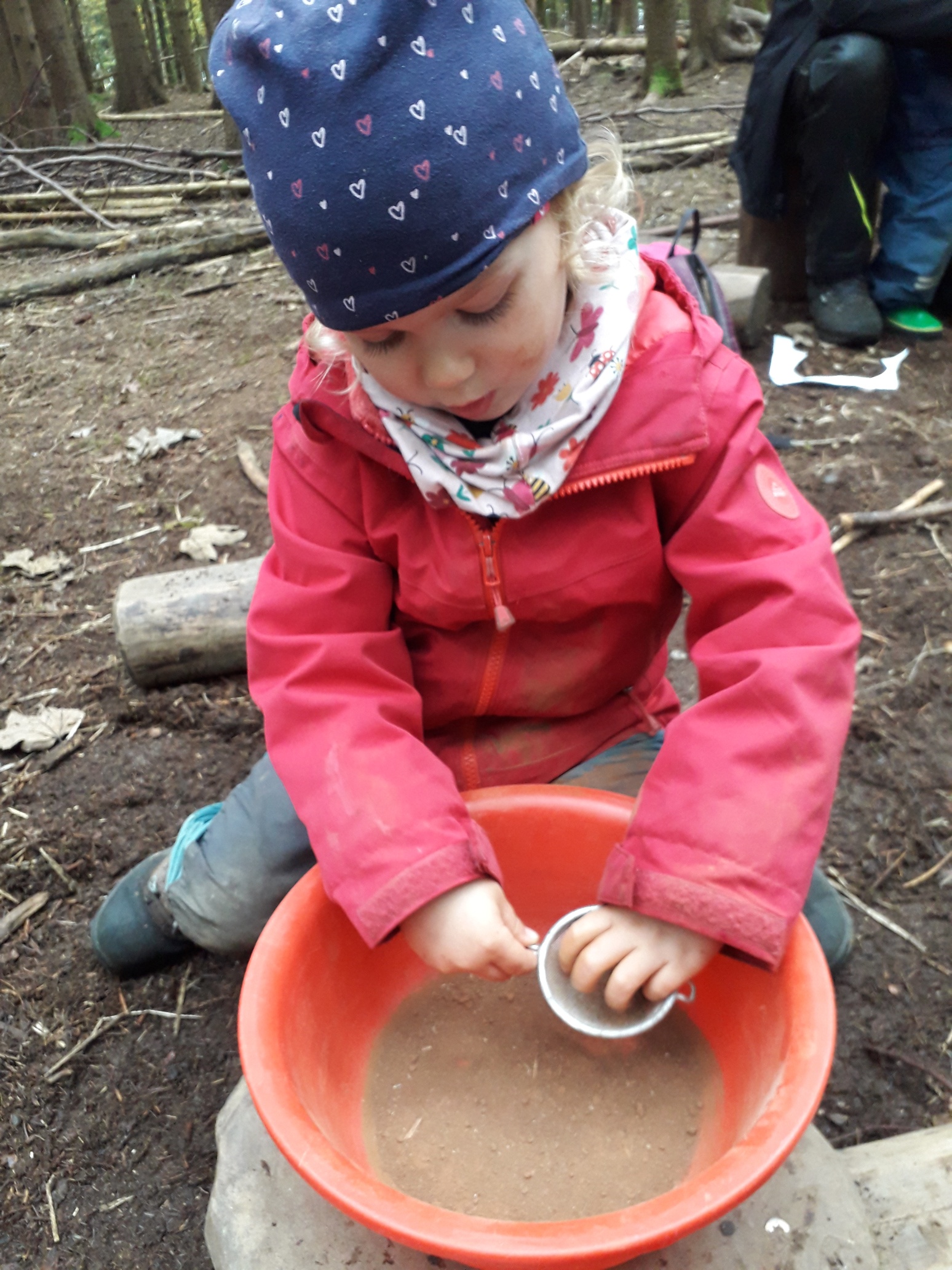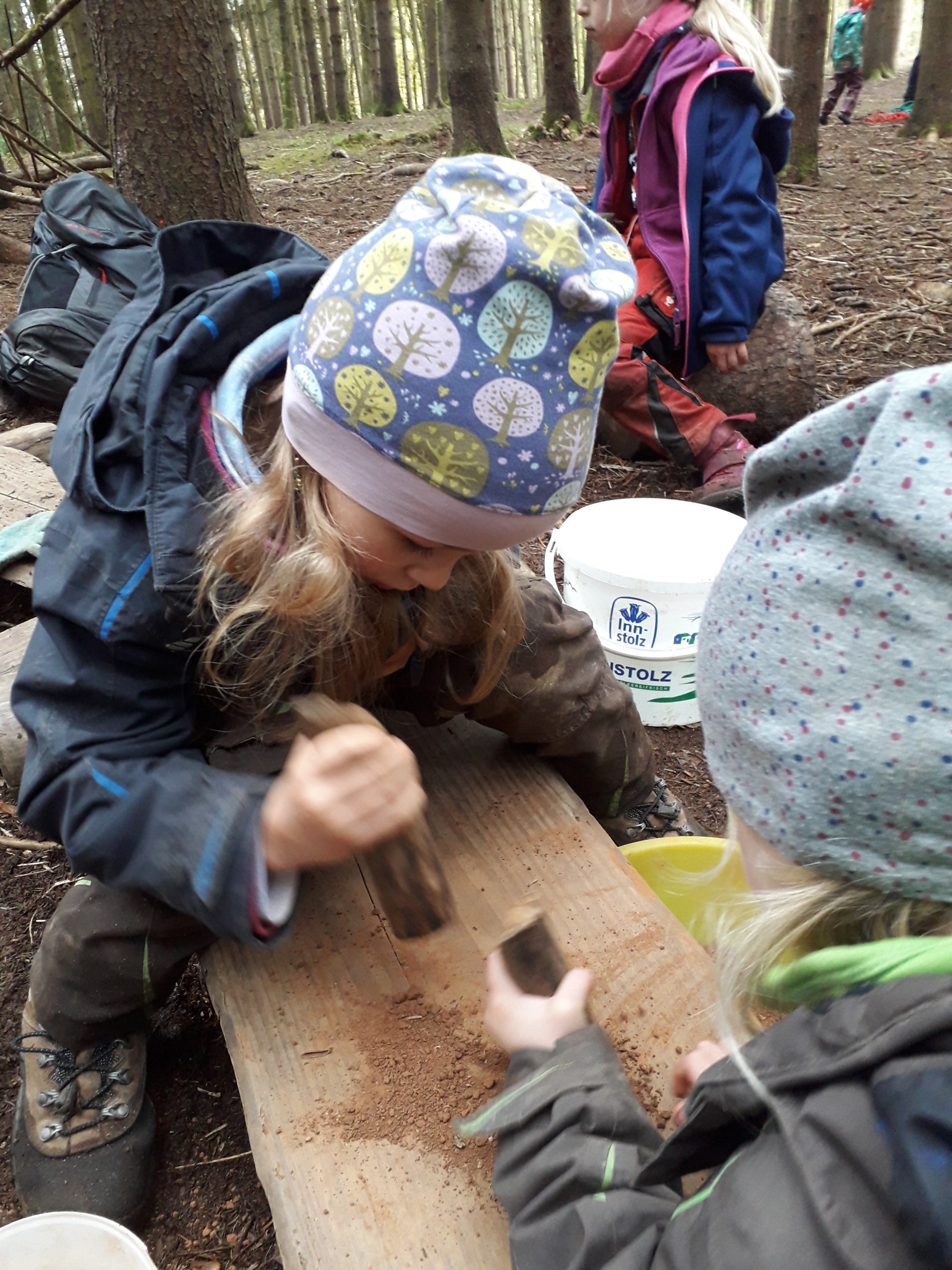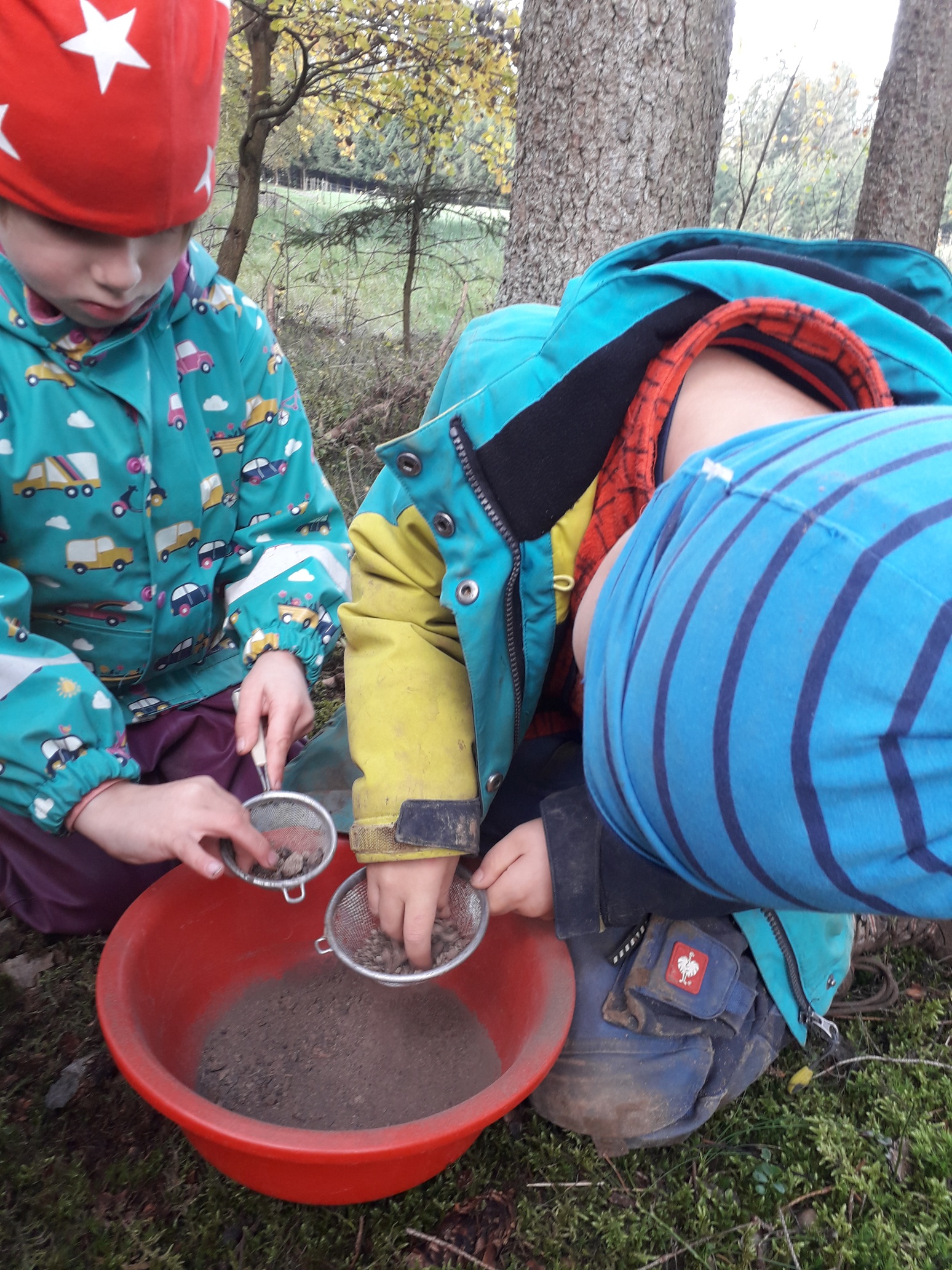 Eulen mit leuchtenden Augen zierten am Martinsfest die Laternen der Waldlauser und zeigten ihnen den Weg durch die Dunkelheit. Dem Einsatz der schönen Laternen ging ein besonderes Projekt voraus. Zum Bemalen der Eulenkörper stellten die Kinder die unterschiedlichen Brauntöne aus Erde selbst her. Schon einige Wochen zuvor machten sich die Waldlauser auf die Suche nach verschiedenen Erdsorten im Lausbacher Holz und konnten schließlich fünf unterschiedliche Erden einsammeln. Die wurden ausgebreitet und getrocknet, bis sie nur noch harte Brocken waren. Nun ging es ans Zermahlen und Zerstampfen, bis nur noch ganz feiner Erdenstaub übrig blieb. Der wurde noch gesiebt und am Ende hatten die Waldlauser einiges an Naturfarbe gewonnen.