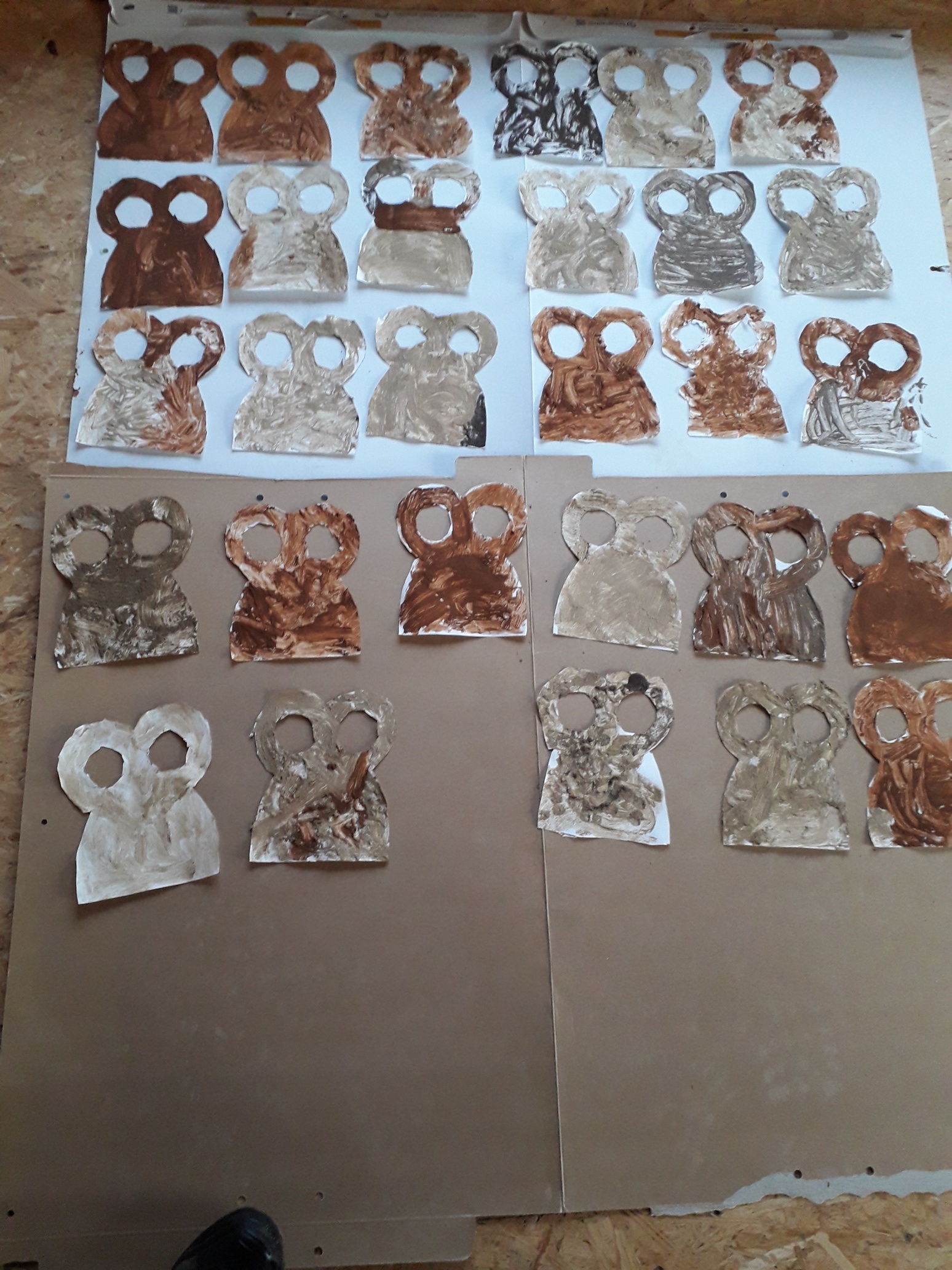 Um damit eine haltbare Farbe herzustellen, konnten die Kinder das Farbpulver entweder mit Kleister oder Eitempera vermischen. Jetzt war die Eulenfarbe fertig und die ausgeschnittenen Eulen konnten ein passendes Gefieder aufgemalt bekommen.
