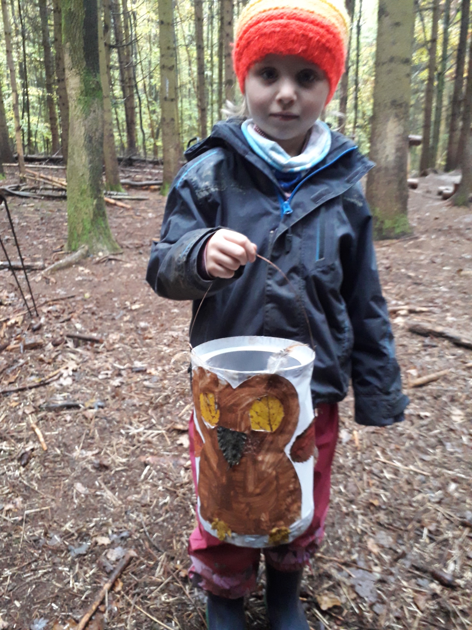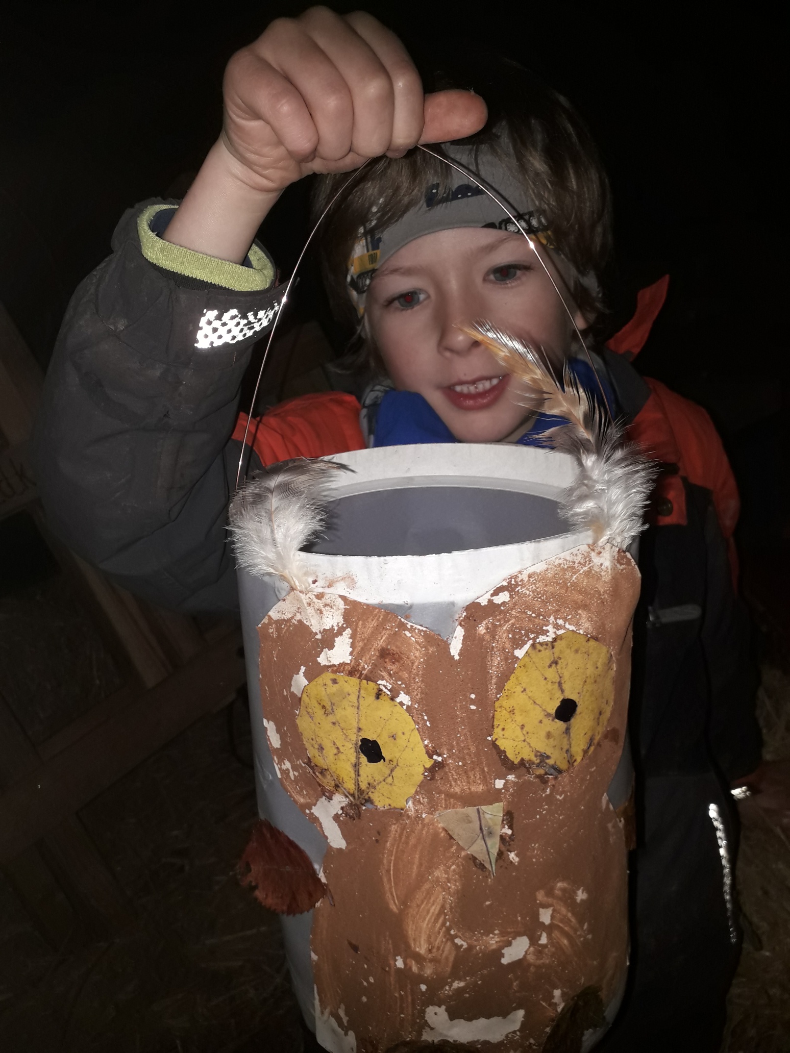 Zusammen mit Blättern und Federn fanden die Eulen schließlich ihren Platz auf den Laternen und konnten die Kinder durch die Nacht begleiten.
