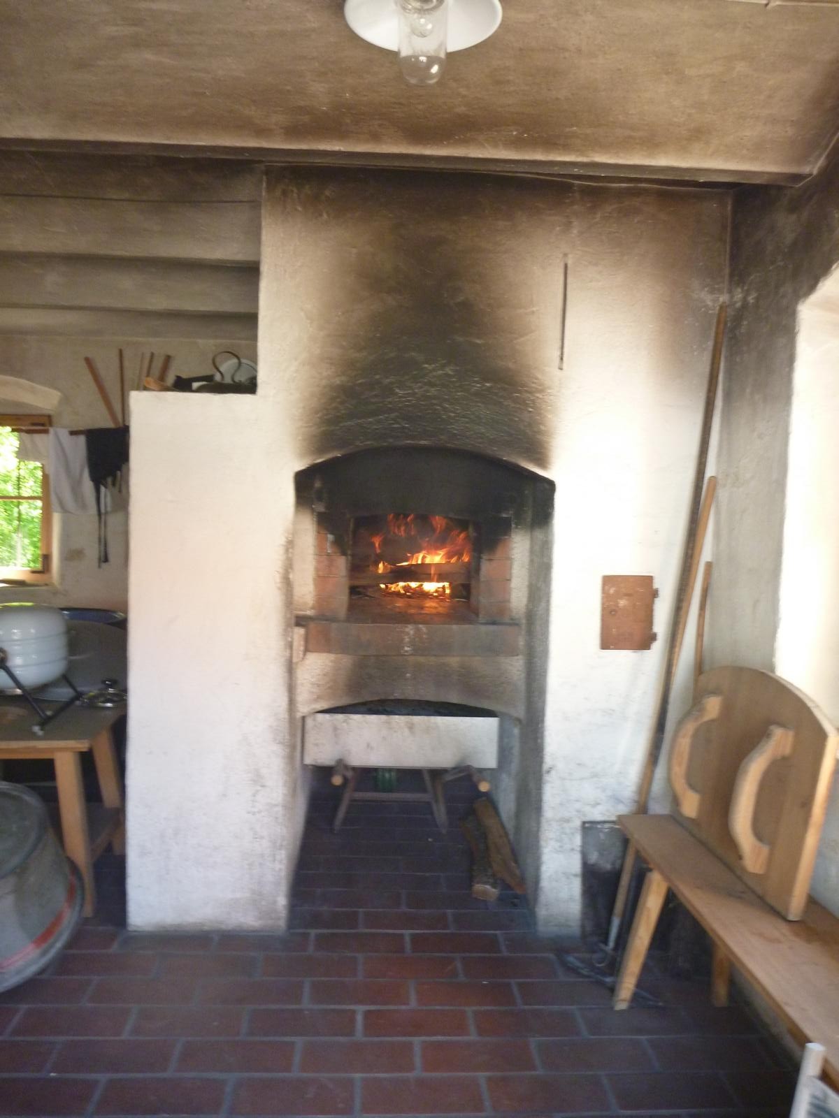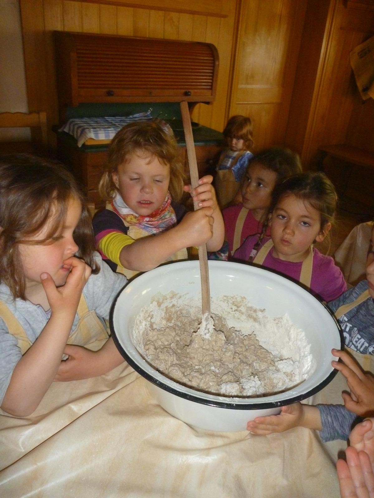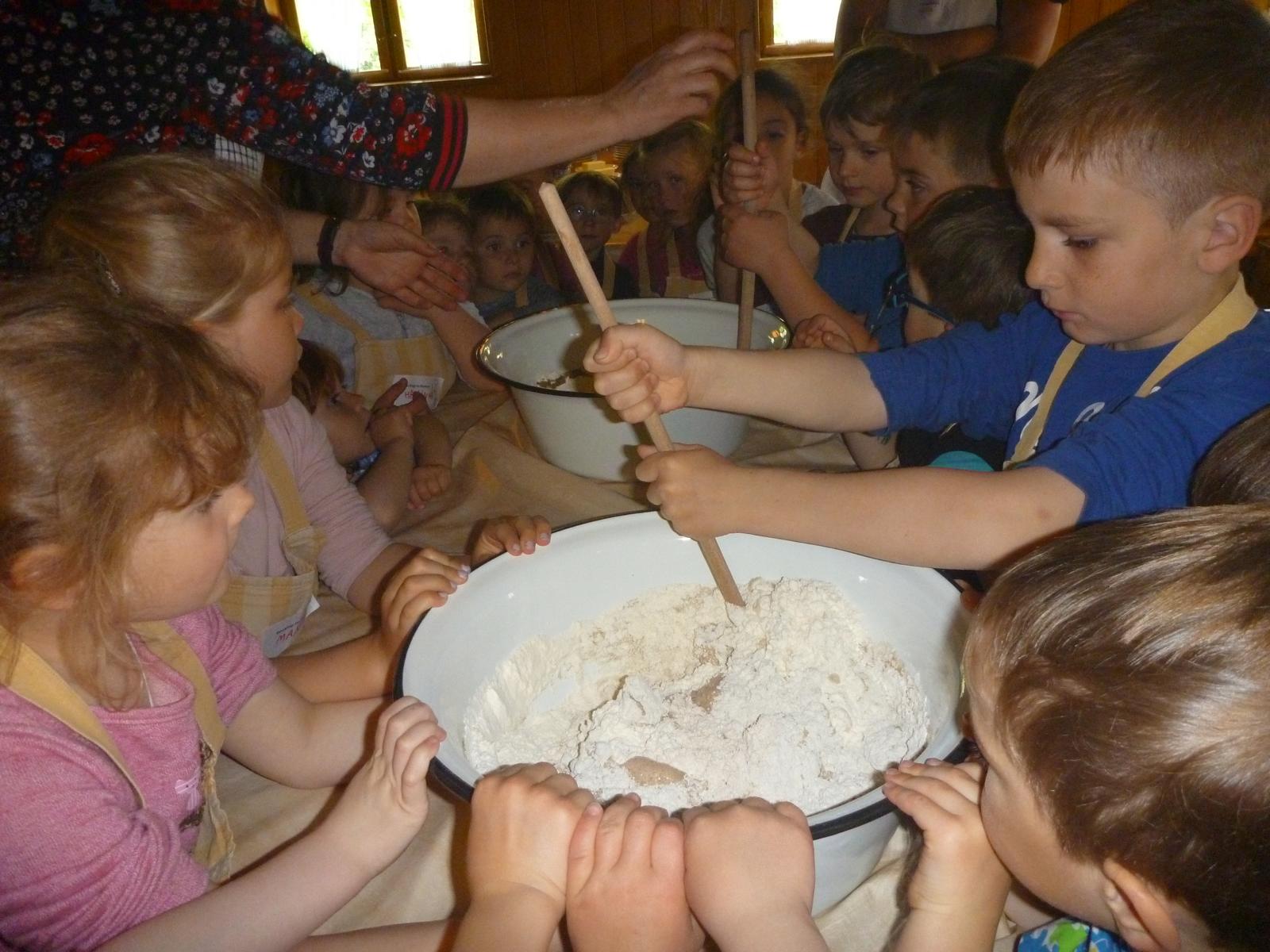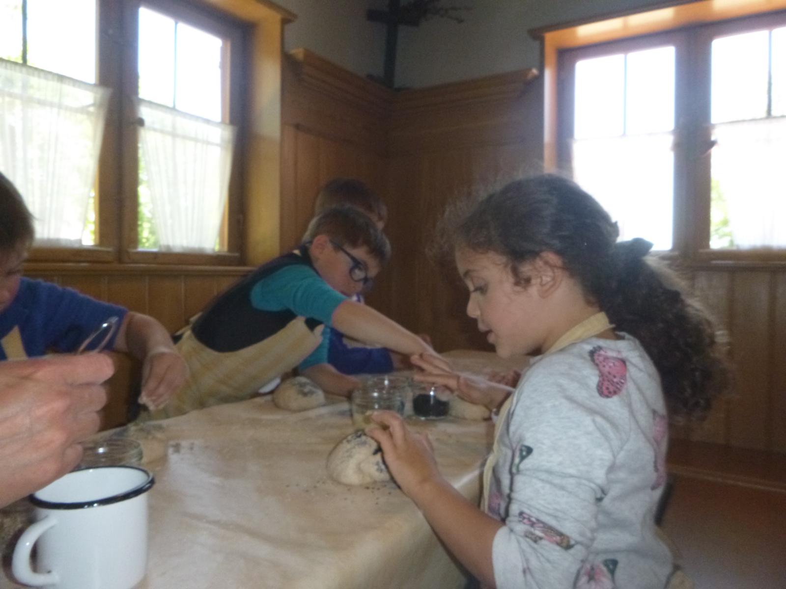 In Neumarkt-St.-Veit war genügend Zeit und Platz für die erste Brotzeit und nach kurzer Weiterfahrt marschierten wir in Massing zum Bauernhofmuseum. Dort erwartete uns auch schon Roswitha Klingshirn und führte uns zügig ins Brotbacken ein. Die Kinder durften in zwei großen Emailschüsseln die verschiedenen Mehlsorten, Hefe, Wasser, Salz und Gewürze verrühren und den Teig schließlich bis zur gewünschten Konsistenz schlagen – eine schweißtreibende Angelegenheit. Zuvor war im Backhaus schon das Feuer im Backofen entzündet worden, damit dann alles bereit ist.
