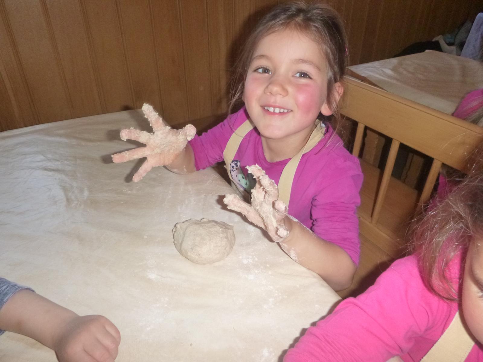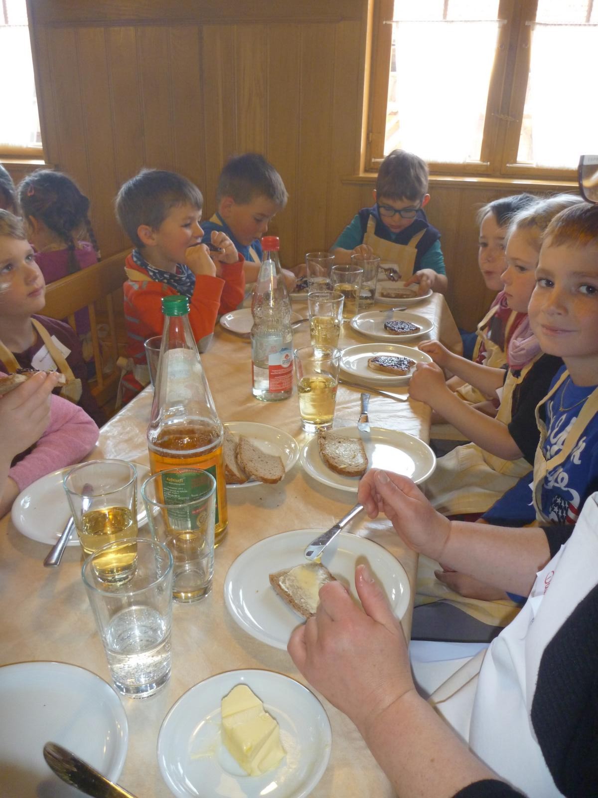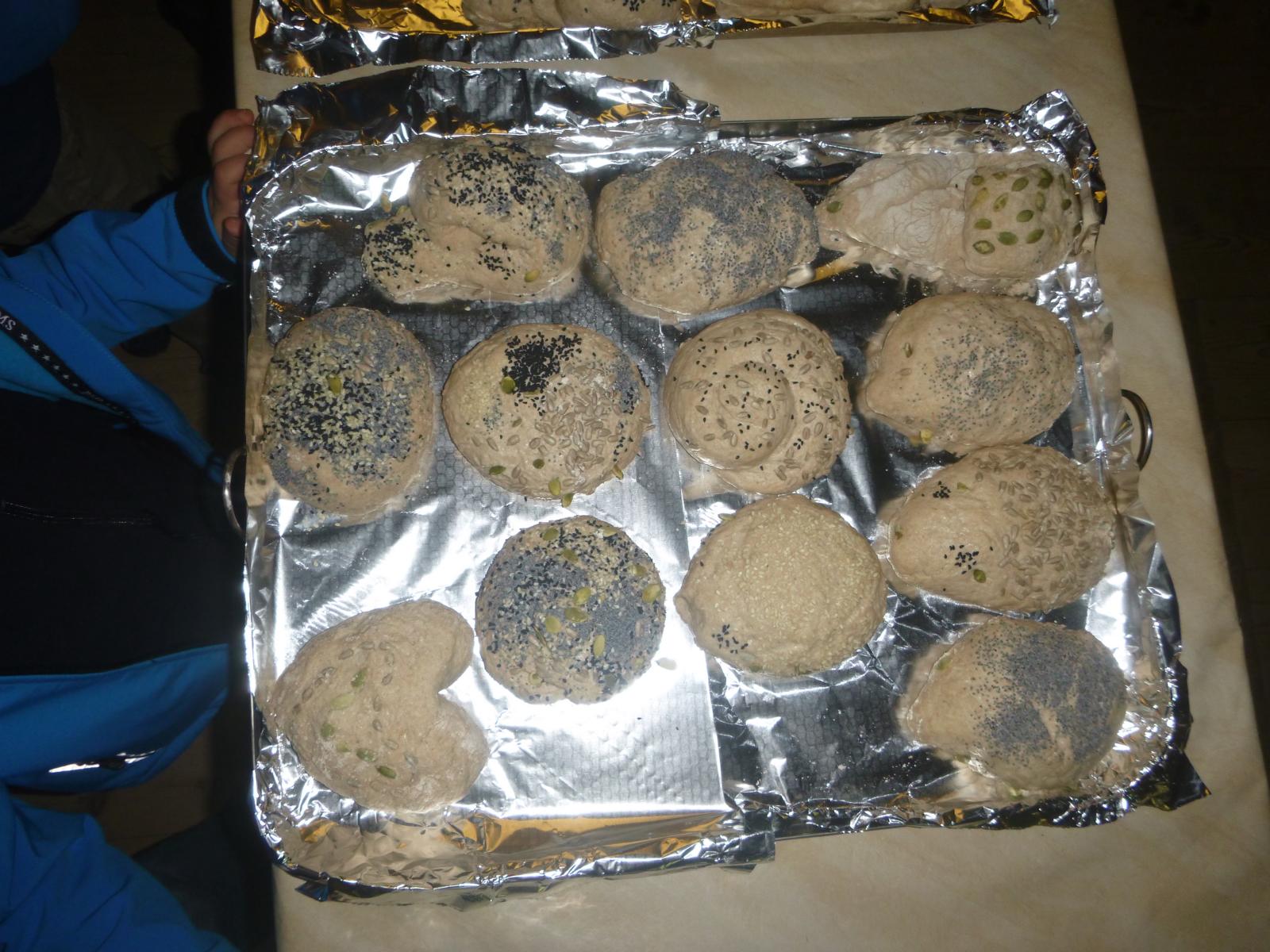 Während der Ruhezeit des Teiges, gab’s für alle Brotzeit und bei Butterbrot mit Marmelade und Apfelschorle haben alle tüchtig zugelangt. Ihr eigenes kleines Brot durften die Kinder dann im Anschluss formen und mit verschiedenen Körnern verzieren. Schließlich landeten alle Schnecken, Fußbälle und Igel auf dem Backblech und im – inzwischen ausgeräumten und ausgewischten - Backofen.