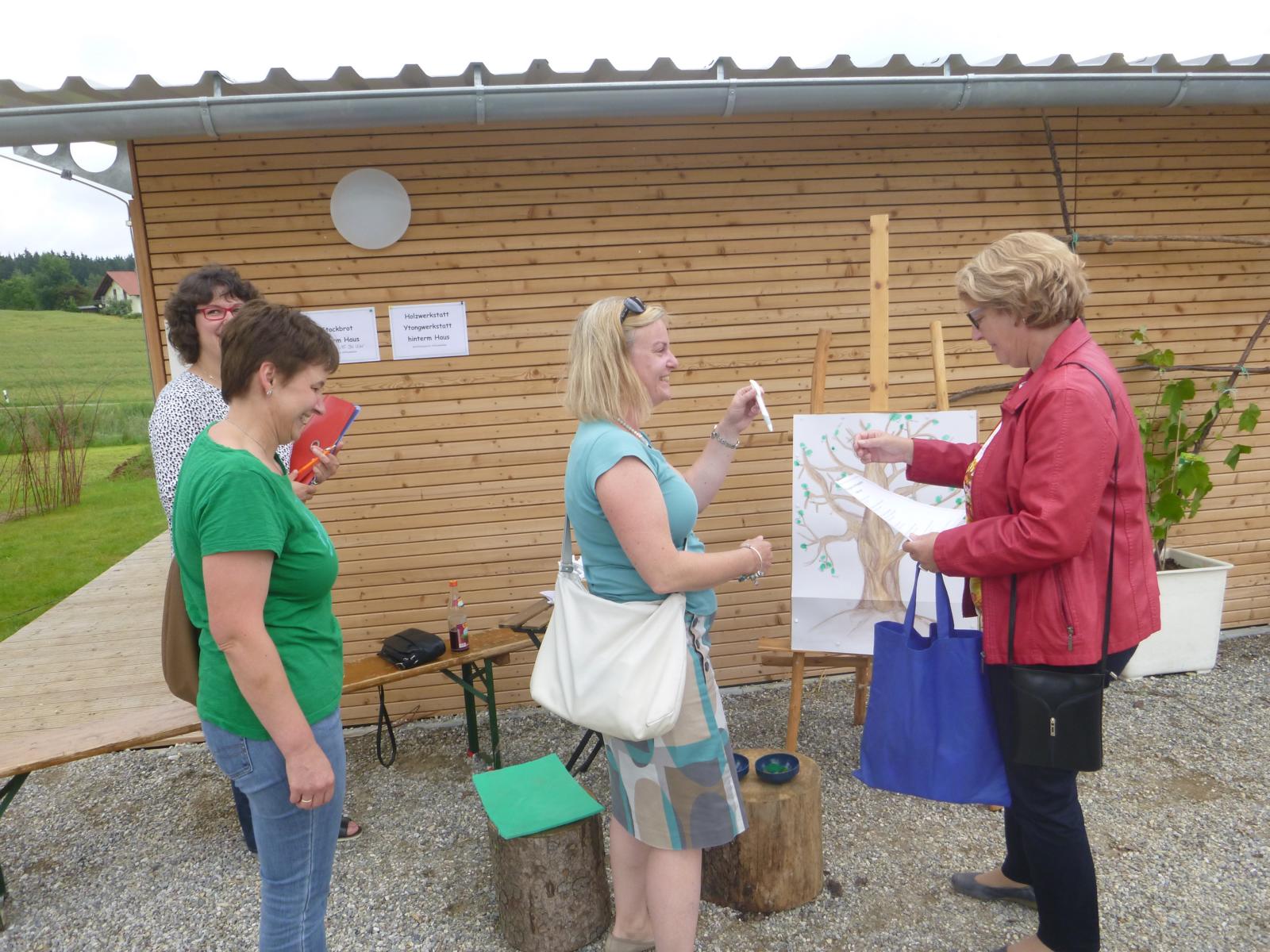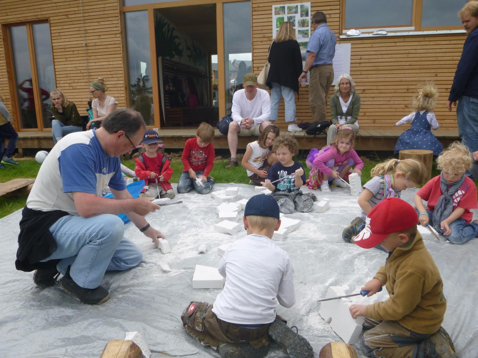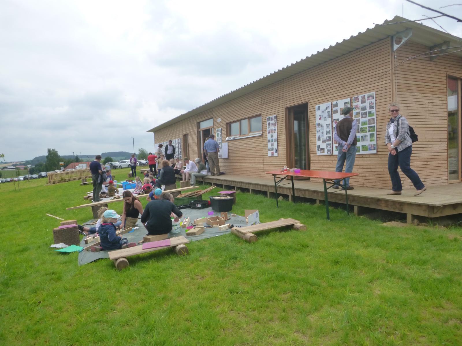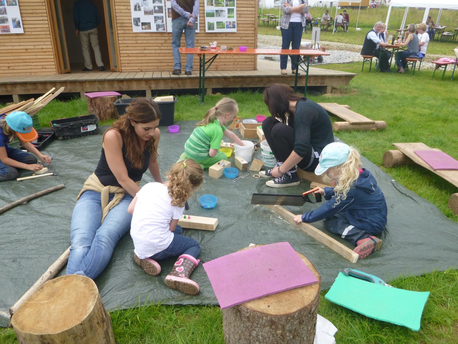 Den Besuchern standen alle Räume offen, viele Bilderwände gaben einen Einblick in die täglichen Erlebnisse im Lausbacher Holz und beim „Häusl-Quiz“ konnte man sein Wissen rund um’s Häusl ergänzen. Für die großen und kleinen Kinder fand hinterm Haus ein breites Angebot an Beschäftigungen statt: Hämmern, Raspeln und Sägen mit Holzklötzen und Ytongsteinen fanden ebenso großen Anklang, wie die Künstlerecke am Gartenzaun und das Stockbrotbraten am Lagerfeuer. Wer noch Appetit auf anderes hatte, konnte sich am üppigen Kuchenbuffet des Elternbeirats und an den gegrillten Leckereien vom Metzger Birkmeier bedienen.
