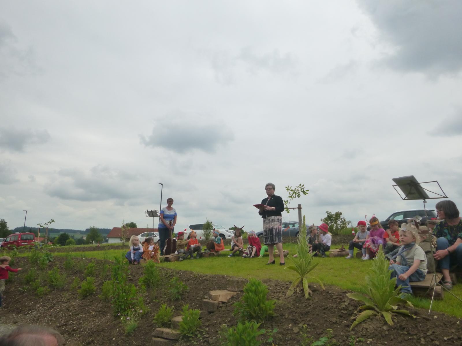 Viele Gäste konnte Bürgermeisterin Katharina Rottenwallner am neuen Häusl des Waldkindergartens begrüßen. Bei mildem Sommerwetter fand dort am 26. Juni im Rahmen einer fröhlichen Feier die Einweihung und Segnung des Waldkindergartens statt. Die Kindergartenkinder umrahmten die Ansprachen der Ehrengäste mit ihren fröhlichen Liedern und rundeten den Festakt mit kleinen Theaterstücken ab. Die letzten Wochen hatten sie dafür fleißig geübt, Theater geprobt, Bilder gemalt und so manches Lied wurde zum hartnäckigen Ohrwurm und Dauerbrenner der Kinder und Erzieherinnen.