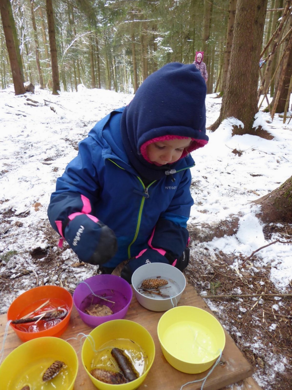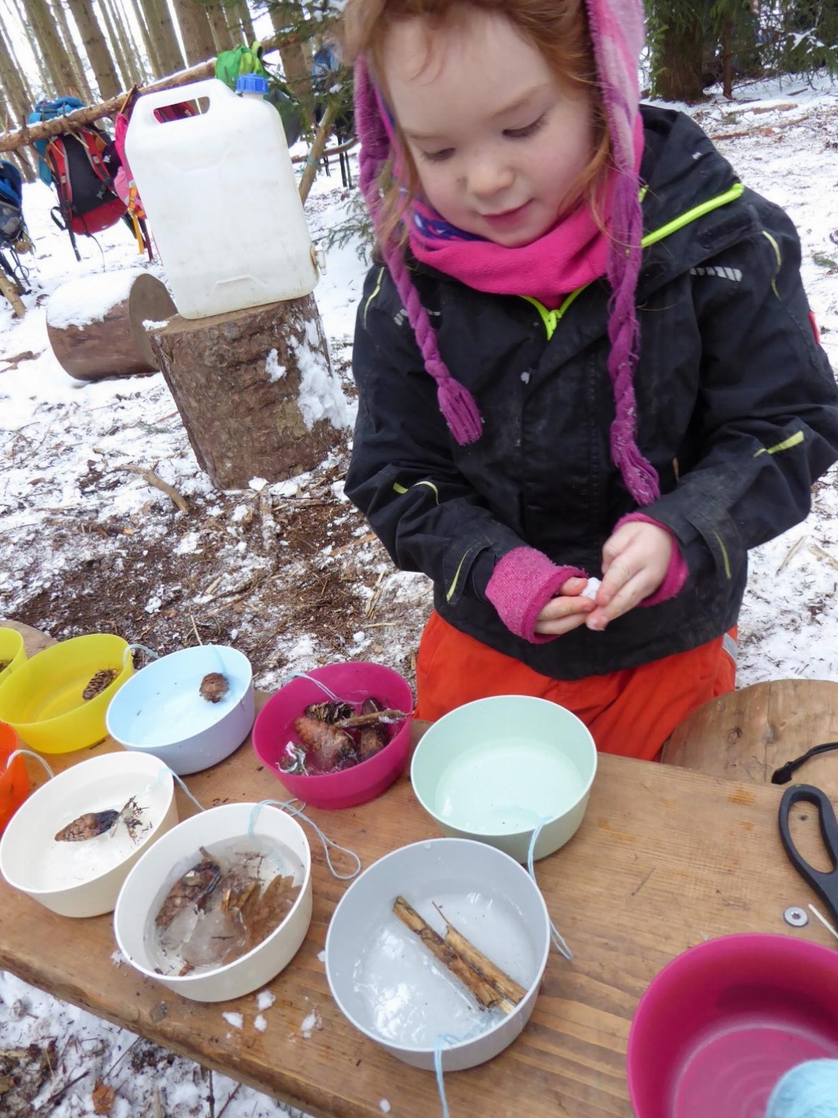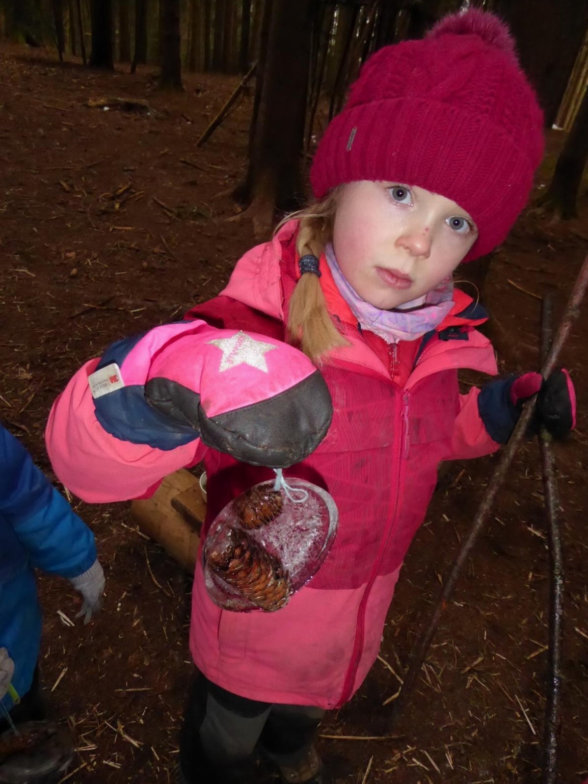 Schüsserl wurden mit Wasser gefüllt, Zapfen, Rindenstückchen und andere Waldschätze hineingelegt und noch ein Wollfaden angebracht. Schließlich wollten man die Eiskunst ja auch aufhängen. Und dann hieß es geduldig warten. Gleich nach der Ankunft im Wald schauten die Kinder täglich nach – „Wieder nicht gefroren“! – hieß es ein um’s andere Mal. Doch schließlich hat es doch noch geklappt und die nächtlichen Minusgrade hatten kleine Eiskunstwerke gezaubert.