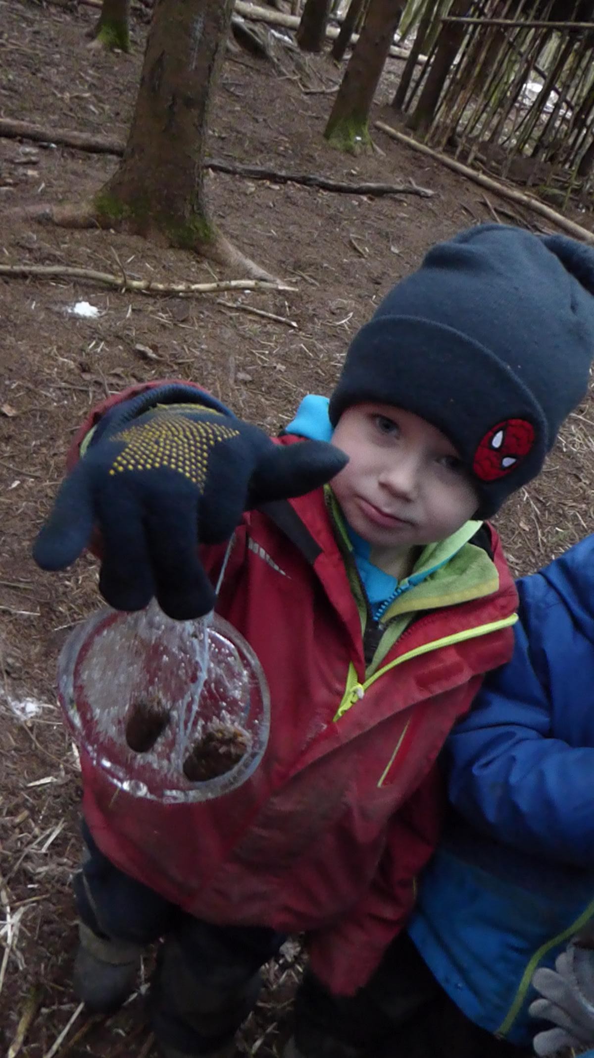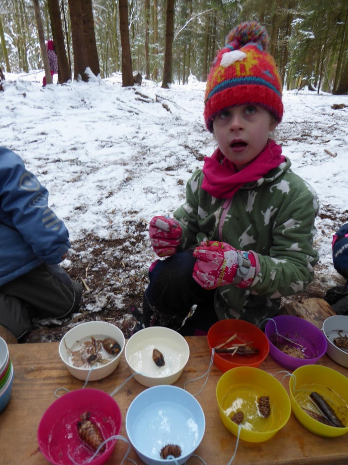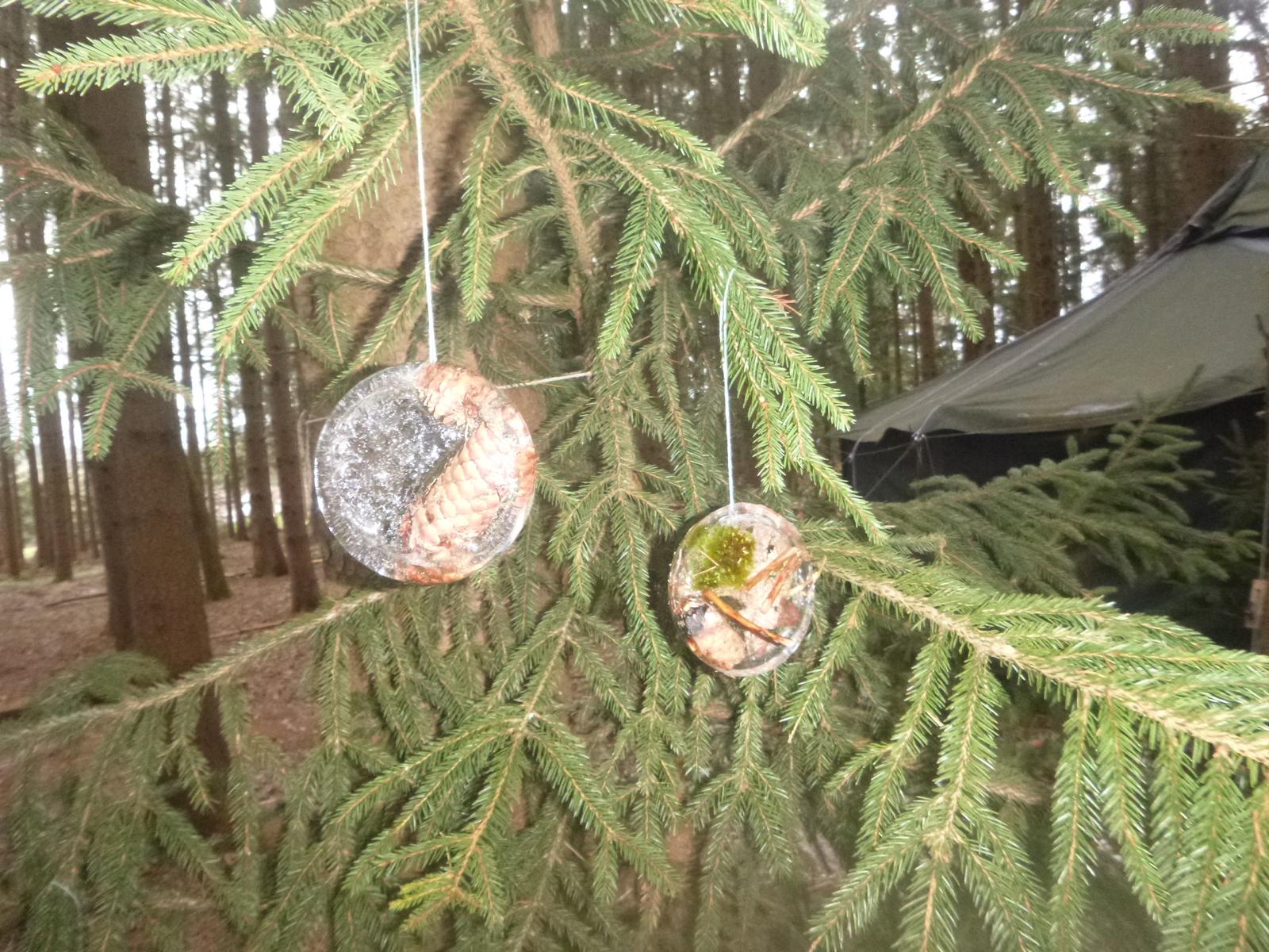 Schüsserl wurden mit Wasser gefüllt, Zapfen, Rindenstückchen und andere Waldschätze hineingelegt und noch ein Wollfaden angebracht. Schließlich wollten man die Eiskunst ja auch aufhängen. Und dann hieß es geduldig warten. Gleich nach der Ankunft im Wald schauten die Kinder täglich nach – „Wieder nicht gefroren“! – hieß es ein um’s andere Mal. Doch schließlich hat es doch noch geklappt und die nächtlichen Minusgrade hatten kleine Eiskunstwerke gezaubert.