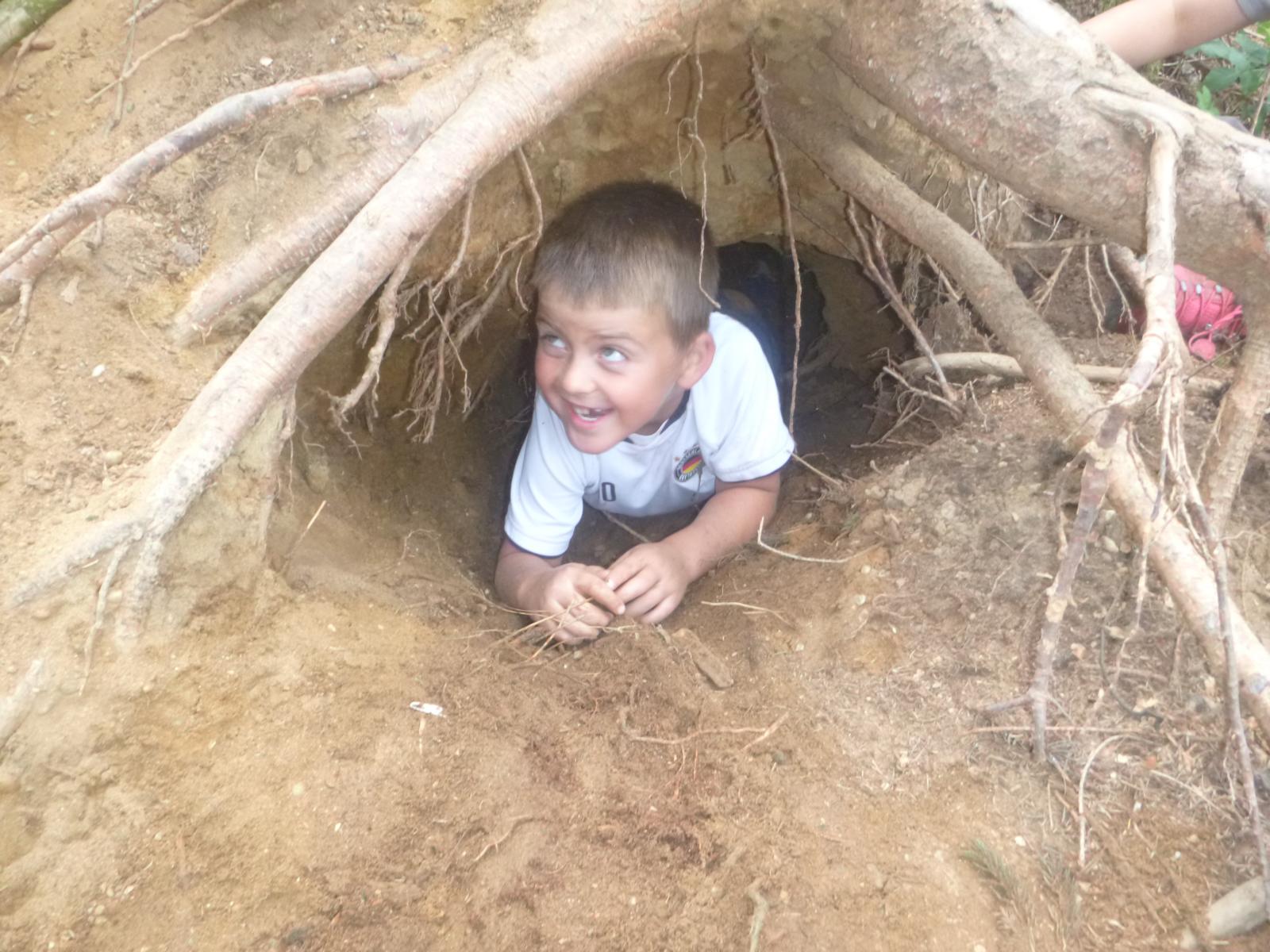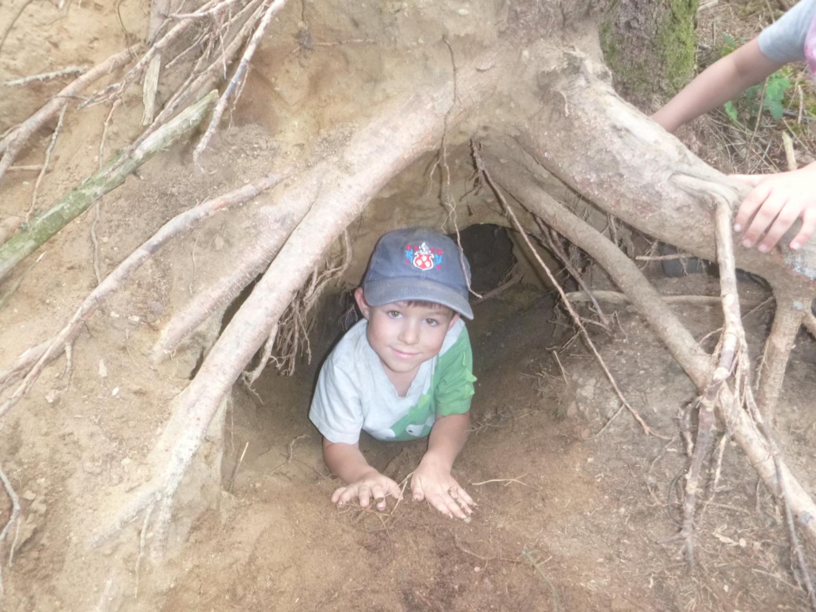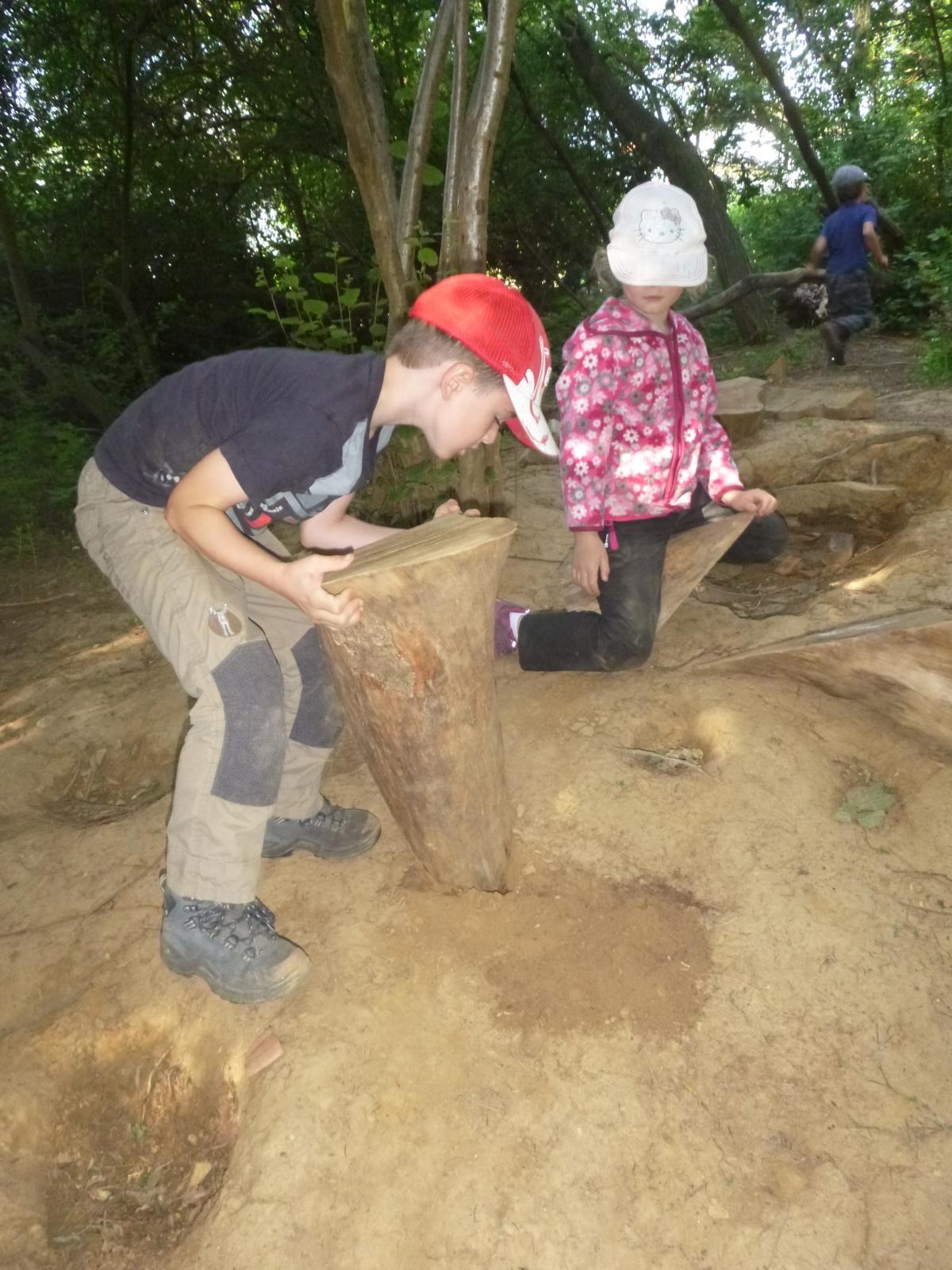Der Erde ganz nah sind die Waldlauser bei ihrem Spiel. Durch die Trockenheit verwandelt sich der Waldboden an manchen Stellen zu einem großen Sandkasten und die Kinder nutzen den Sand in unterschiedlichen Farbtönen für ihre Spiele. Kuchenbäcker gibt es da, große Erdbohrer kommen zum Einsatz und manche Sandladung wird auf großen Rindenstücken abtransportiert, um anderswo wieder zum Einsatz zu kommen. In gemeinschaftlicher Arbeit graben die Kinder eine tiefe Höhle unter den alten Baumstumpf eines umgestürzten Baumes und fühlen sich dort ein wenig wie Fuchs und Dachs.