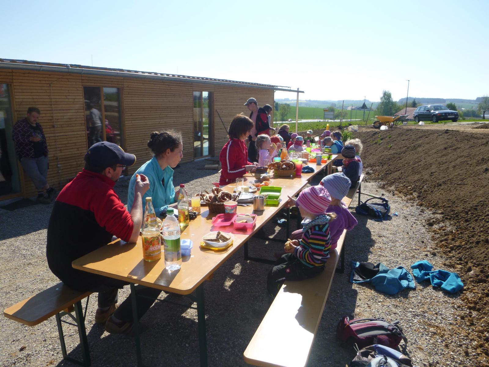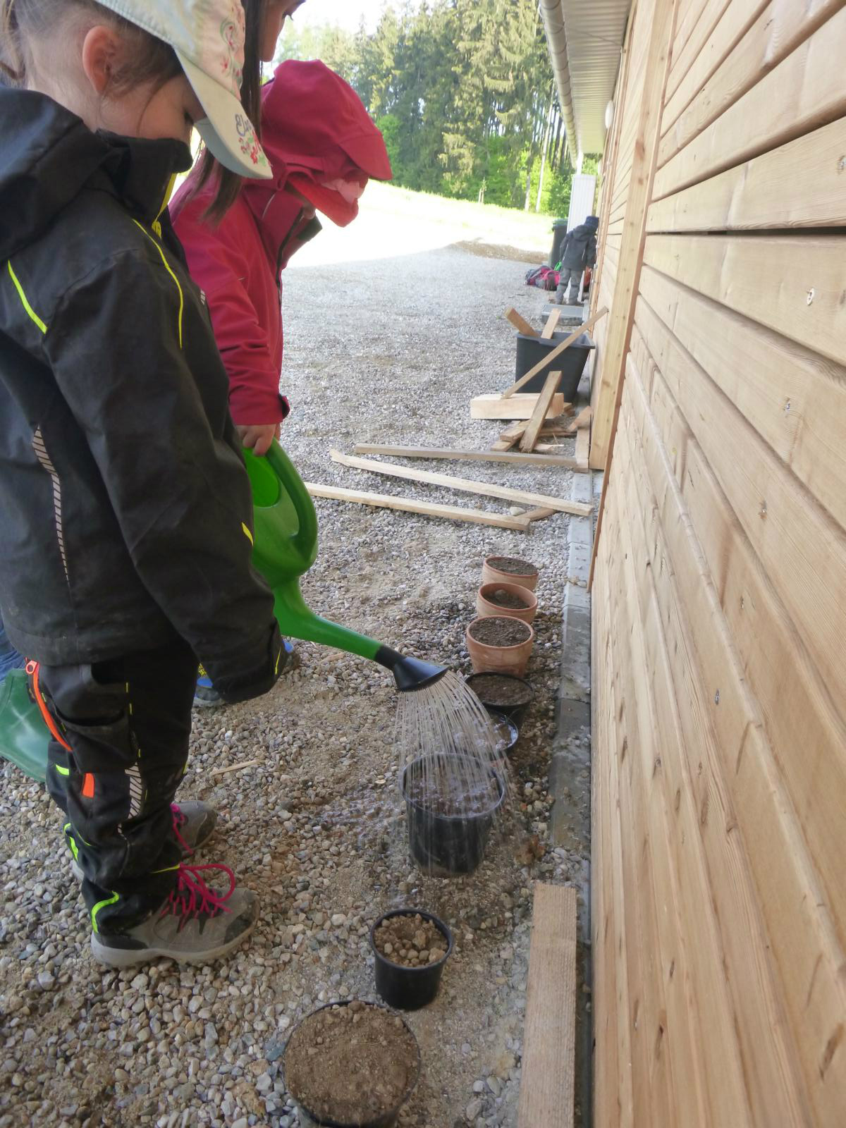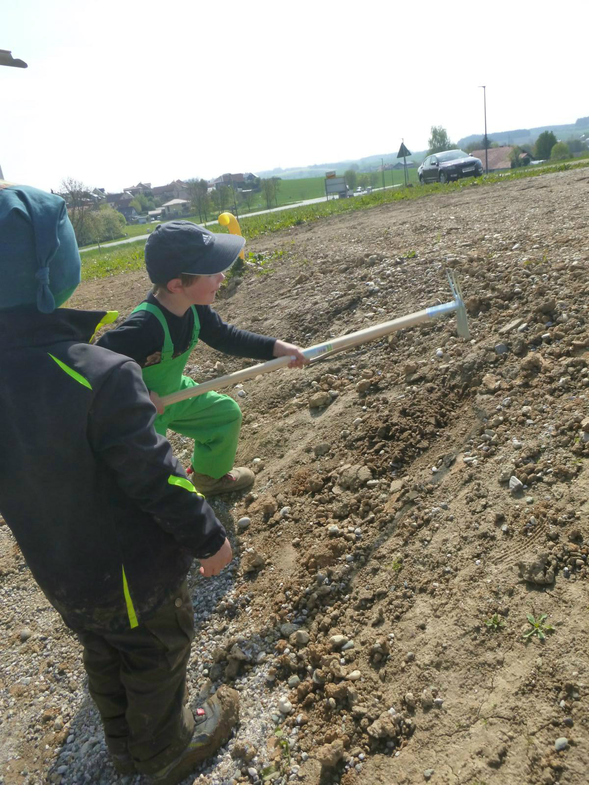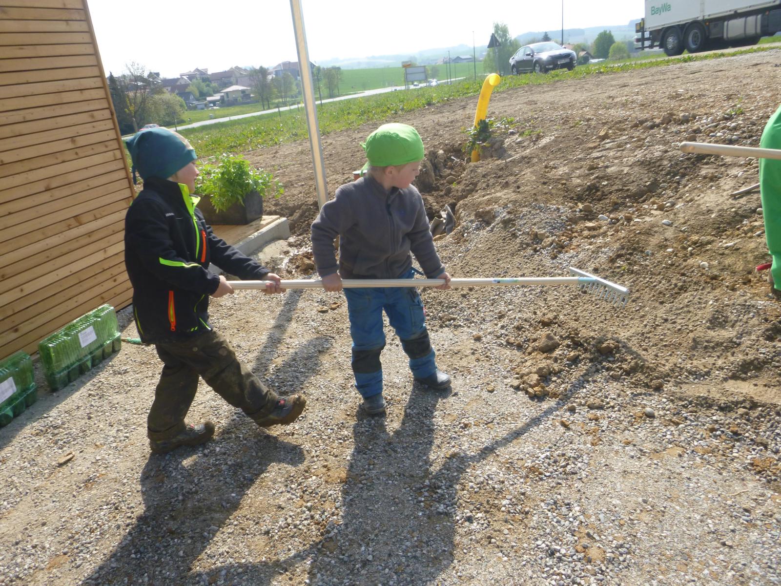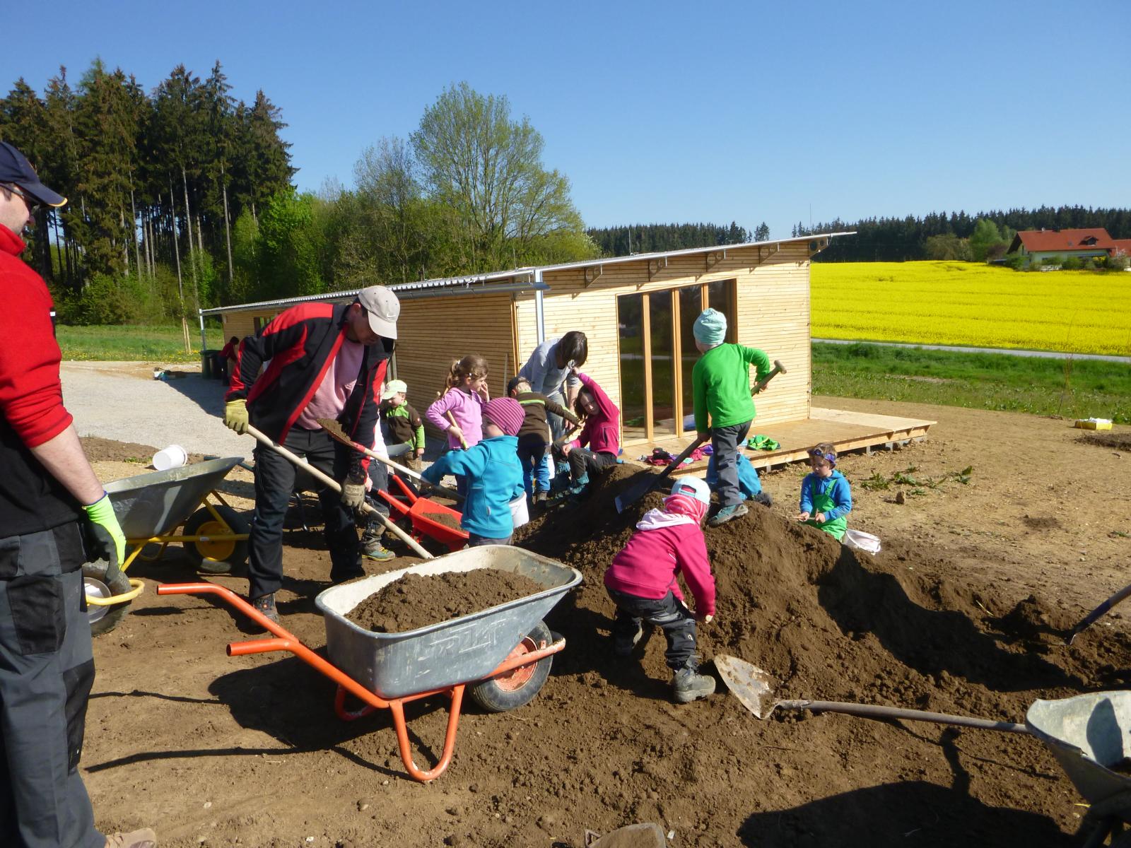 Die fleißigen Eltern packten einen Vormittag mit an und verteilten zusammen mit den Kindern die gute Erde im künftigen Gemüsegartl und dem Blumenbeet vor dem Haus. Da wurden etliche Schubkarrenladungen verteilt, doch Groß und Klein hatten sichtlich Spaß dabei.