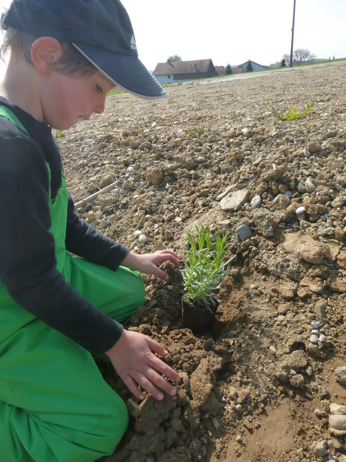 Die letzten Rohre sind verlegt, die Veranda rund um's schöne Häusl fertiggestellt und alle Erdhaufen eingeebnet. Nur einen Resthaufen müssen wir uns natürlich unbedingt zum KLettern, Graben, Baatzeln und für die gute Aussicht behalten. Das erste Grün des neuangesäten Grases spitzt auch schon aus der Erde. Nun kann es ans Pflanzen und Gestalten gehen. Doch unser erster Elan bekommt durch den harten, lehmigen Boden einen kräftigen Dämpfer. Ein großer Haufen guter Muttererde, den uns die Bauhofmitarbeiter besorgen, bringt uns unseren Träumen vom kleinen Gemüsegarten aber wieder ein ganzes Stück näher.