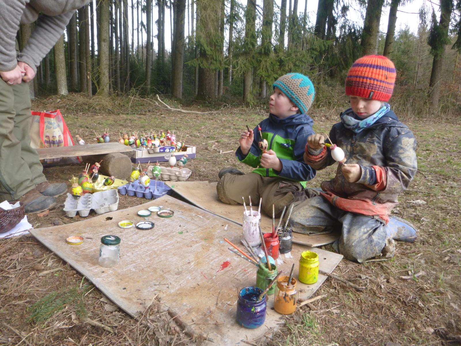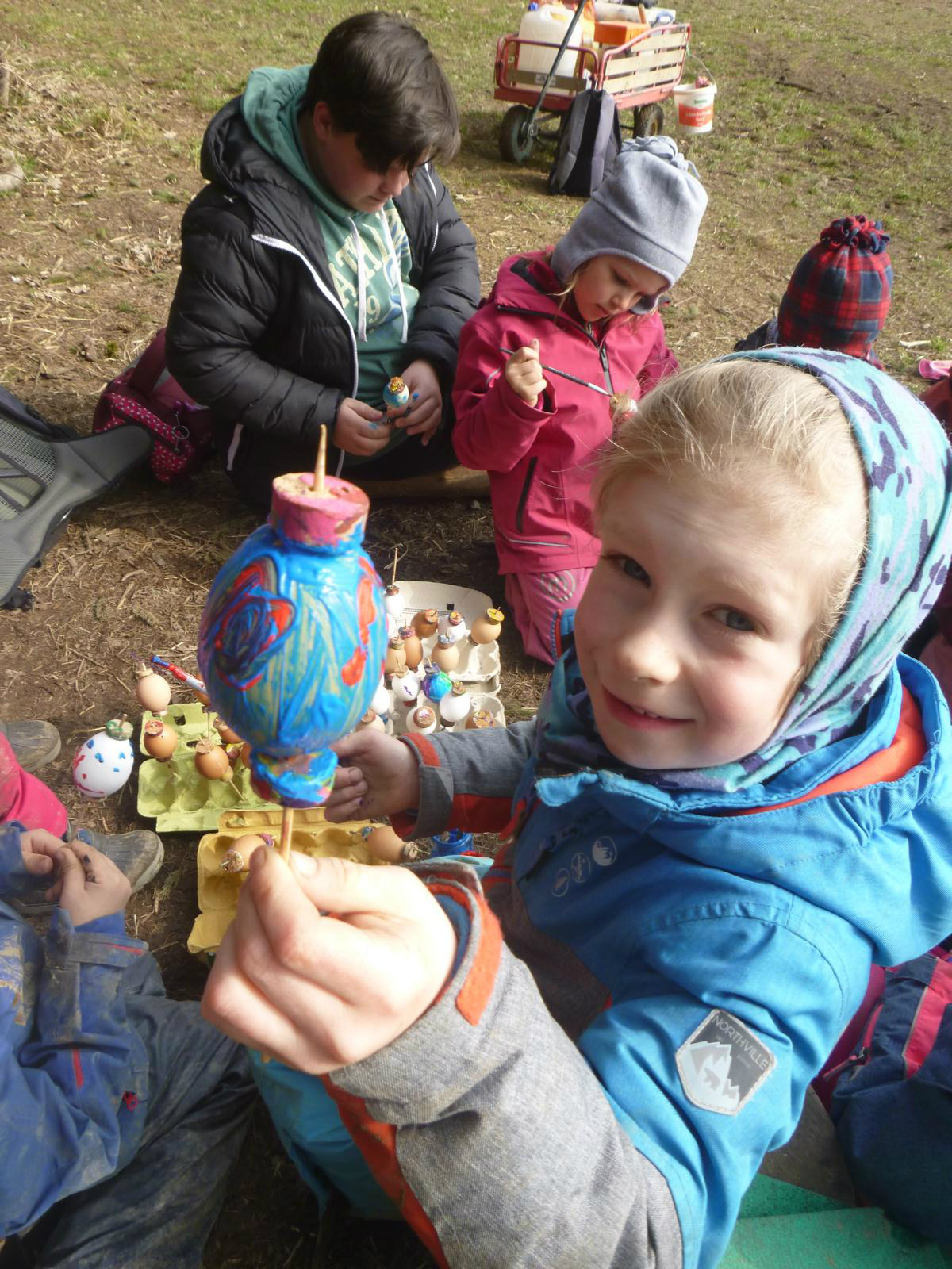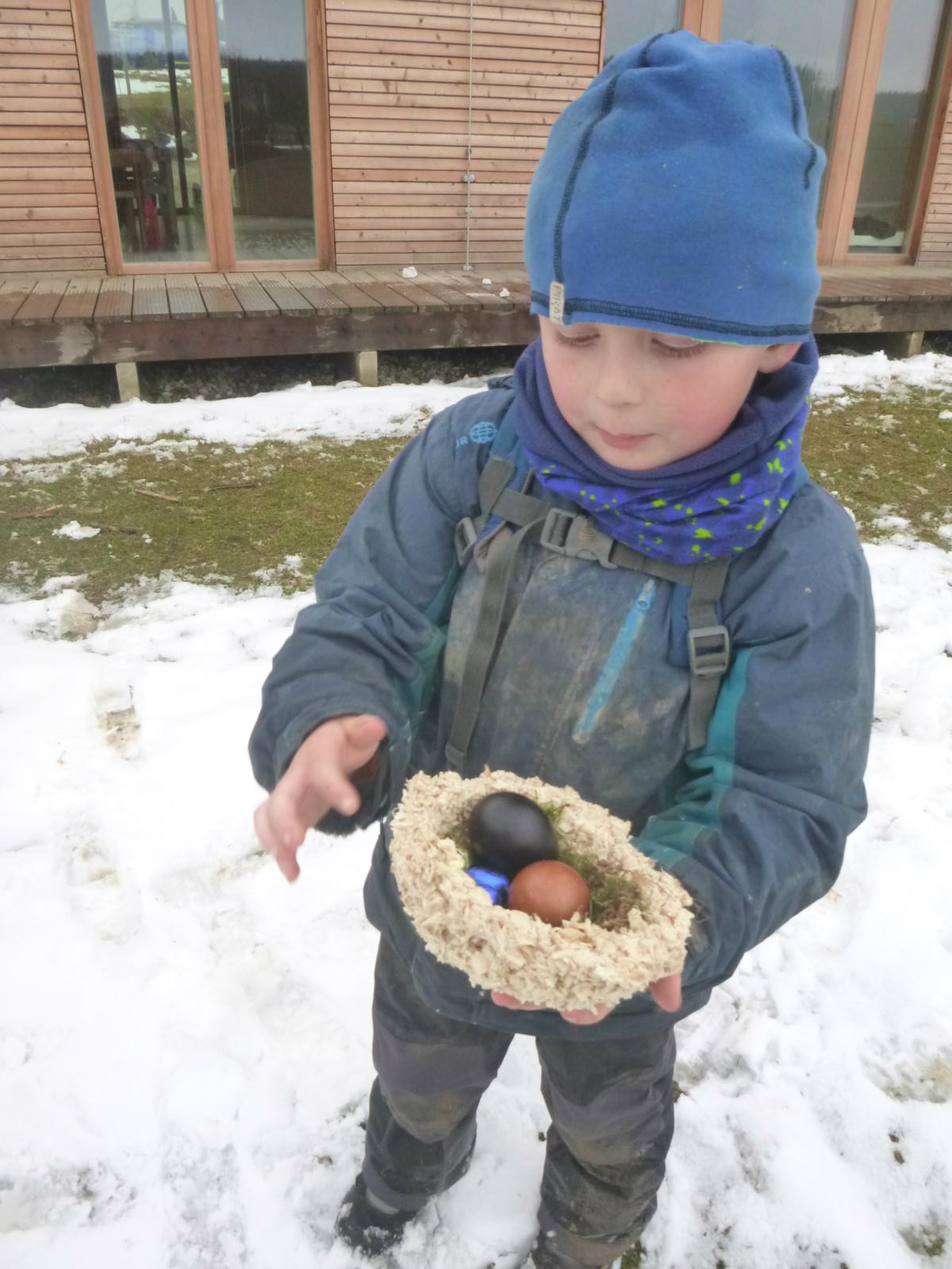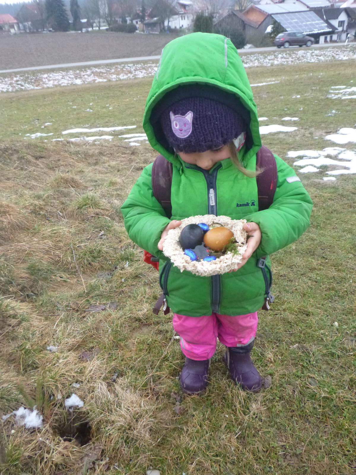 Ob der Osterhase wohl auch Eier bringt, wenn es kalt und die Wiesen und Wege voll Schnee sind? – Diese Frage beschäftigte die Kinder intensiv und sie beschlossen, den vielbeschäftigten Hasen dann doch ein wenig bei den Ostervorbereitungen zu unterstützen und es ihm im Eiermalen gleichzutun. Kunstvolle Nester aus Holzmachè wurden geformt und im Häusl getrocknet, ausgeblasene Eier bemalt und kleine Ostergestecke gebastelt. Viele Geschichten von Hasen und Hühnern, Osterhasenlieder und –spiele und die Passionsgeschichte durften in dieser Zeit natürlich auch nicht fehlen.
