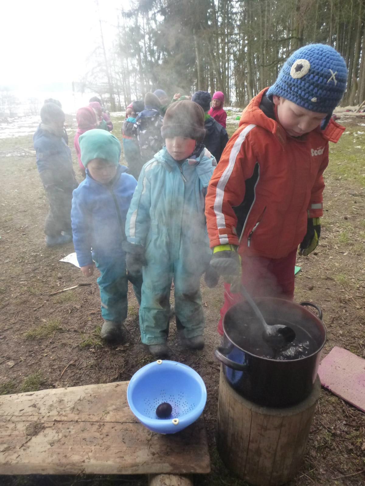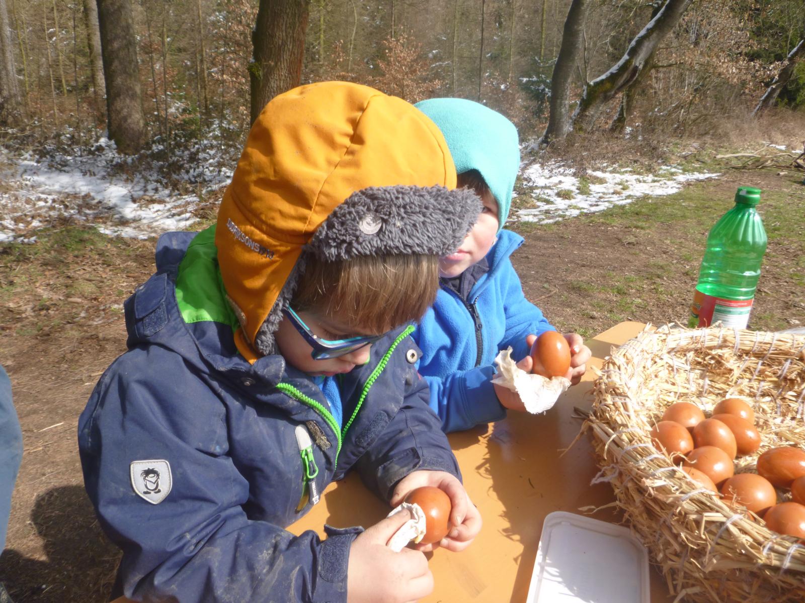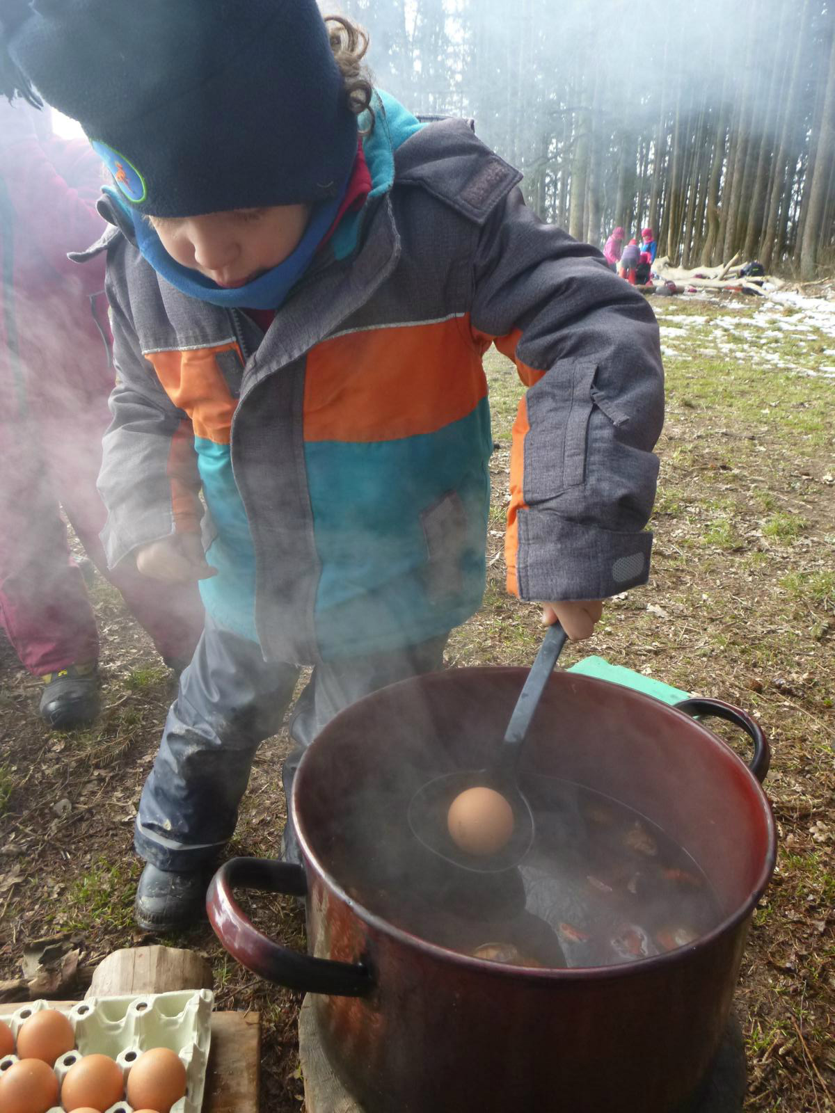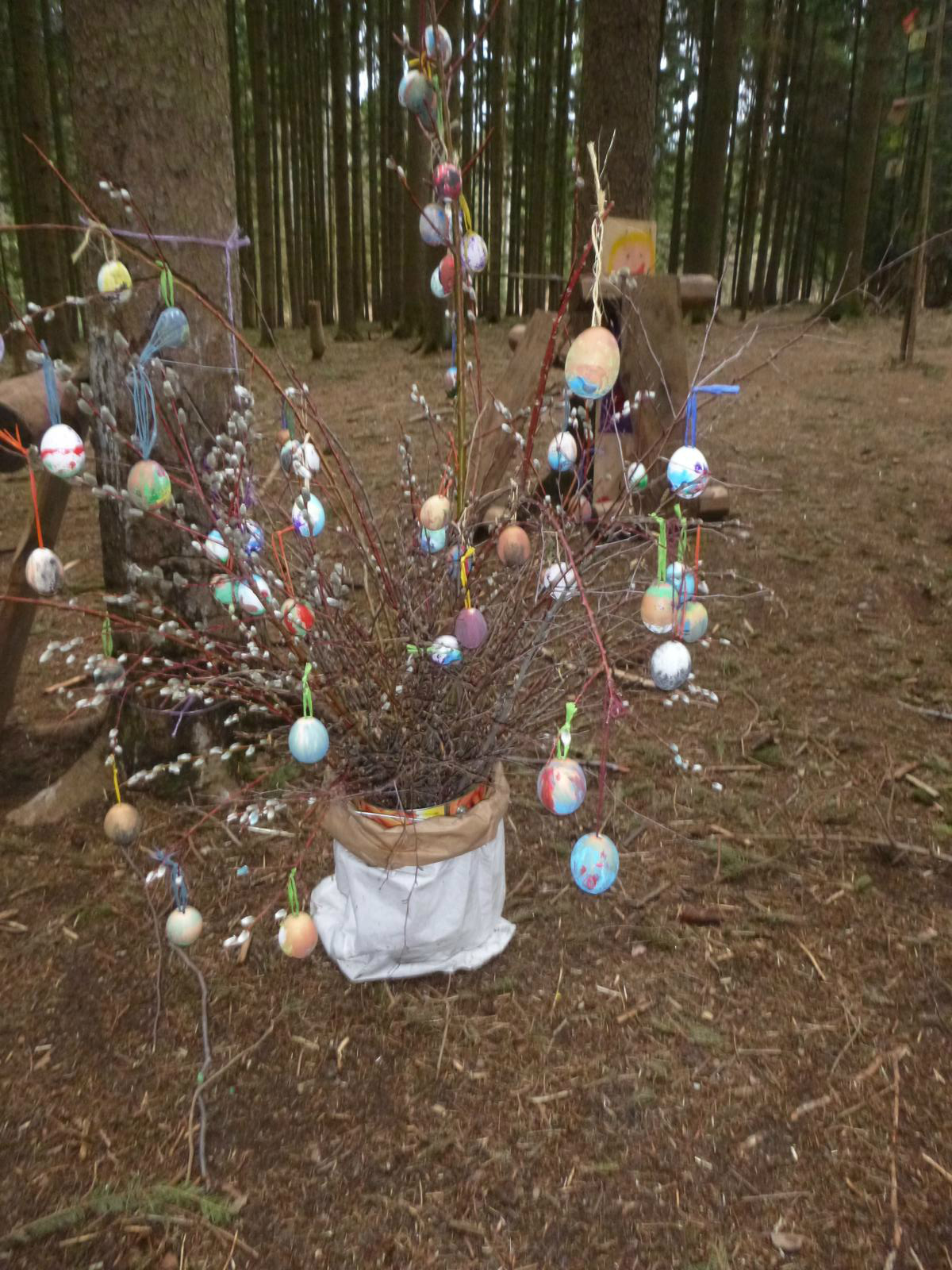 Ob der Osterhase wohl auch Eier bringt, wenn es kalt und die Wiesen und Wege voll Schnee sind? – Diese Frage beschäftigte die Kinder intensiv und sie beschlossen, den vielbeschäftigten Hasen dann doch ein wenig bei den Ostervorbereitungen zu unterstützen und es ihm im Eiermalen gleichzutun. Kunstvolle Nester aus Holzmachè wurden geformt und im Häusl getrocknet, ausgeblasene Eier bemalt und kleine Ostergestecke gebastelt. Viele Geschichten von Hasen und Hühnern, Osterhasenlieder und –spiele und die Passionsgeschichte durften in dieser Zeit natürlich auch nicht fehlen.