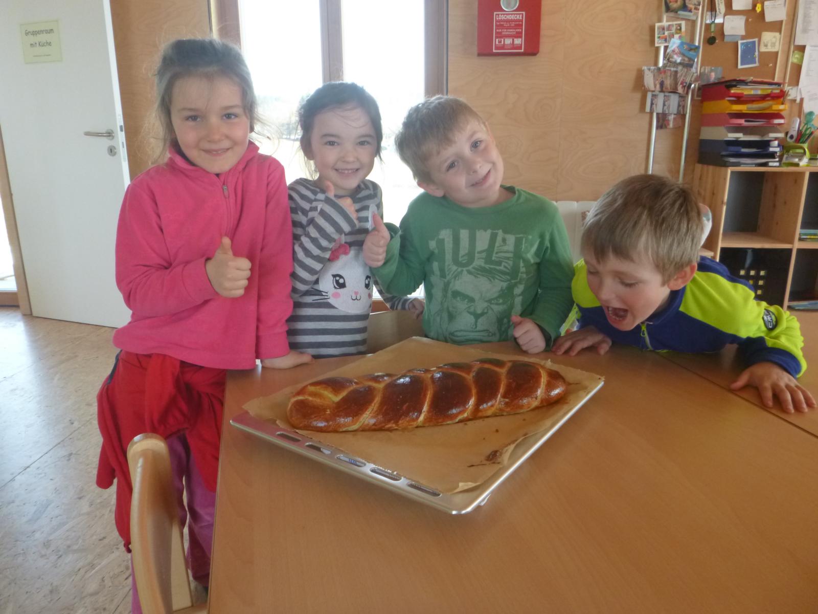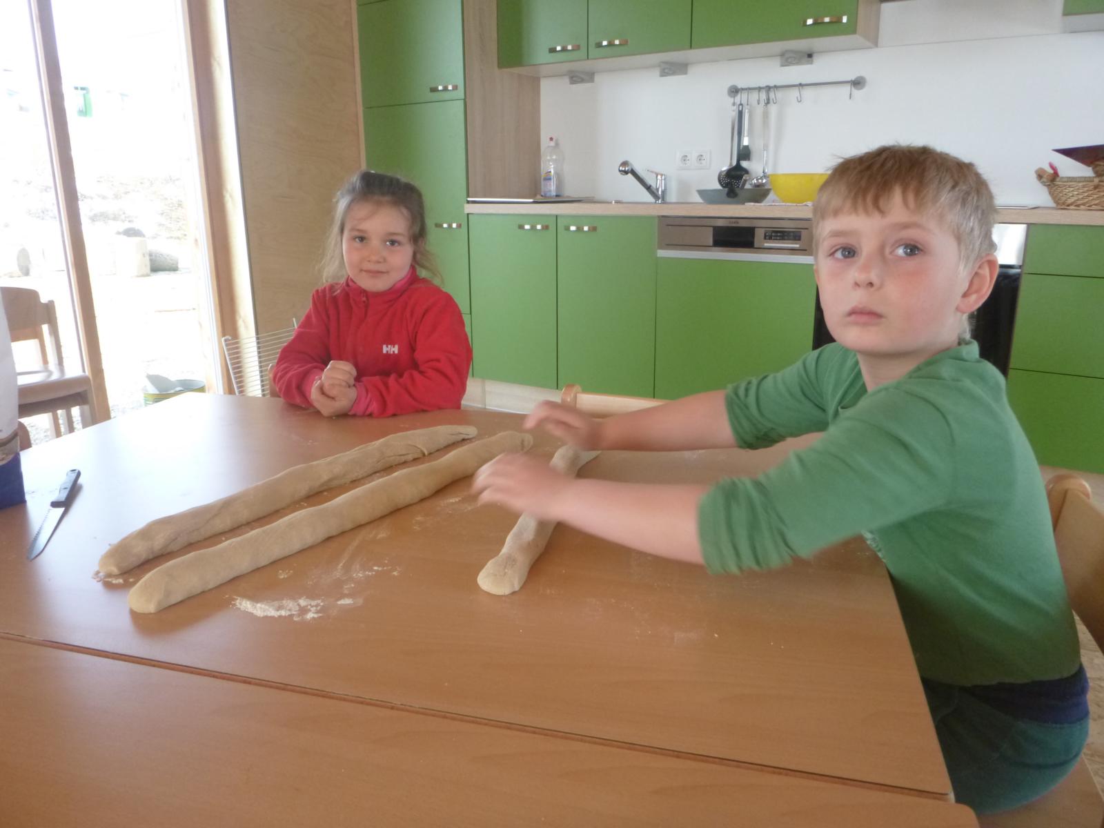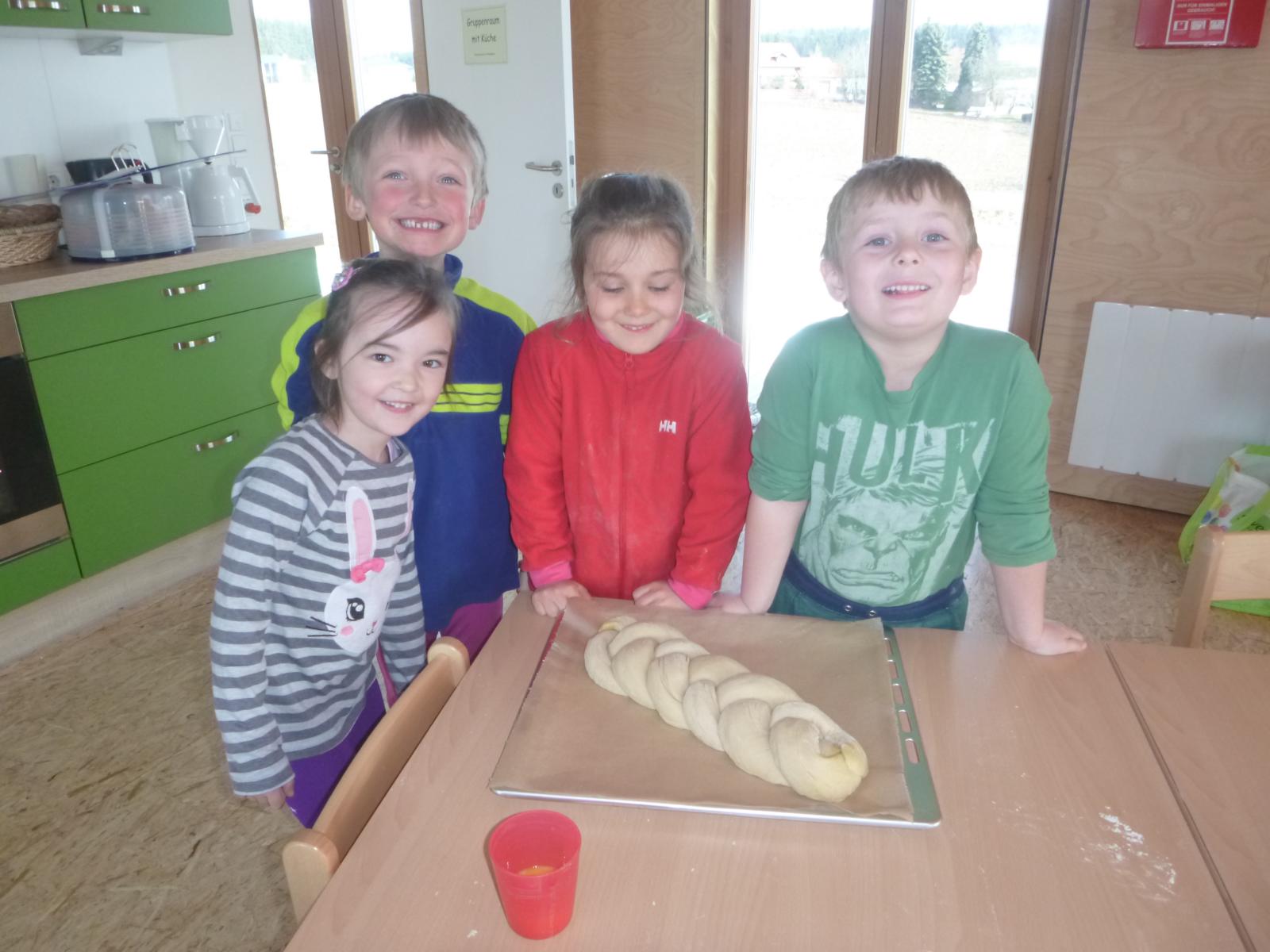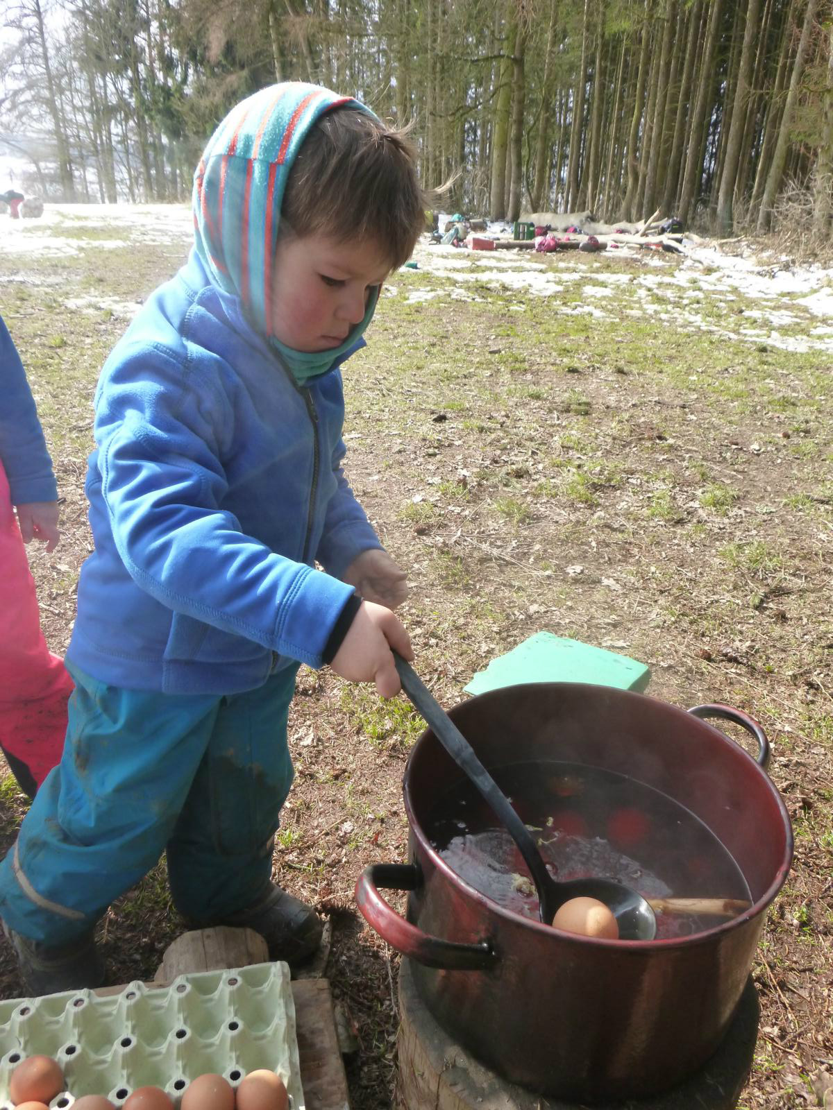 Bei den Vorbereitungen für das gemeinsame Osterfrühstück packten alle mit an – während die einen jede Menge Eier im Pflanzenfarbensud einfärbten, einfetteten und behutsam in den Osterkorb legten, bucken die anderen im Häusl einen prachtvollen Osterzopf.
