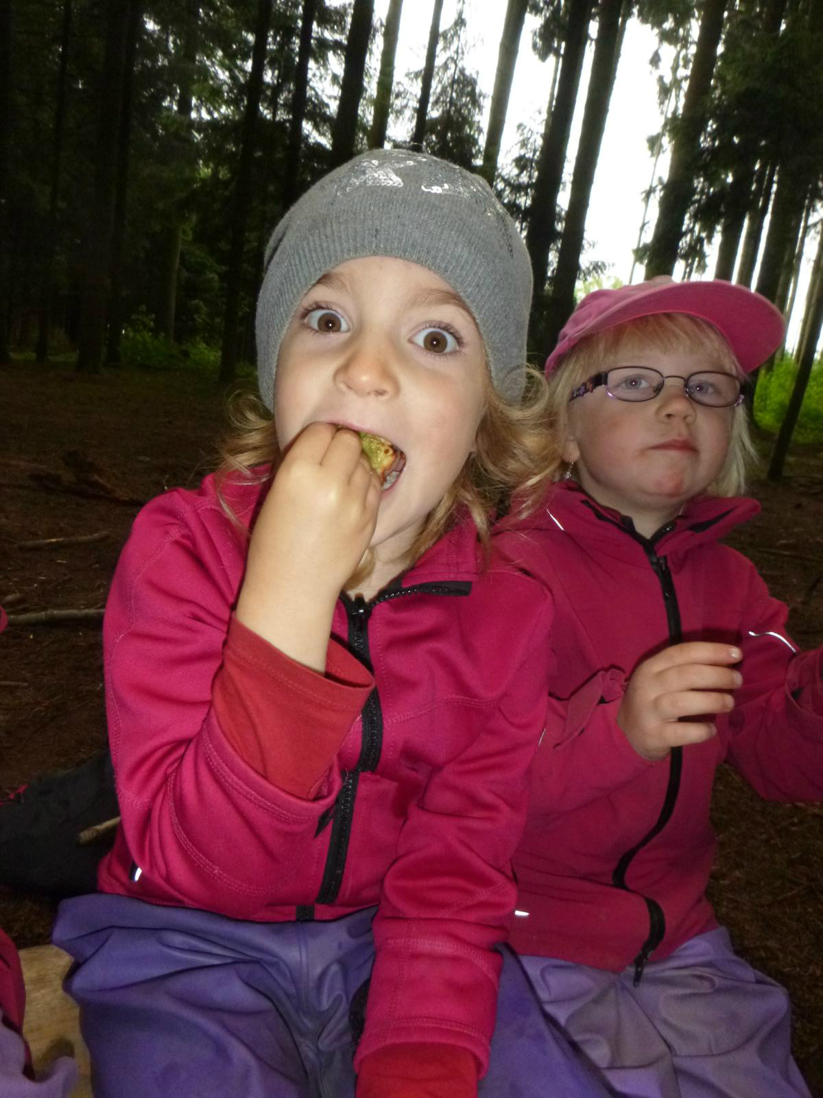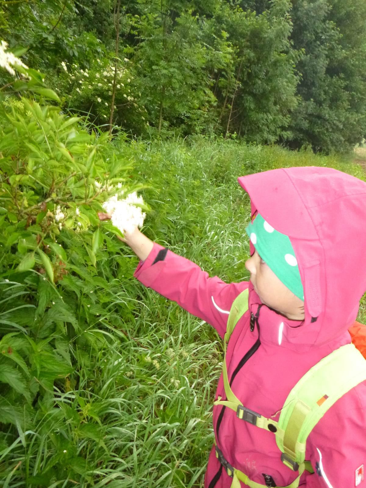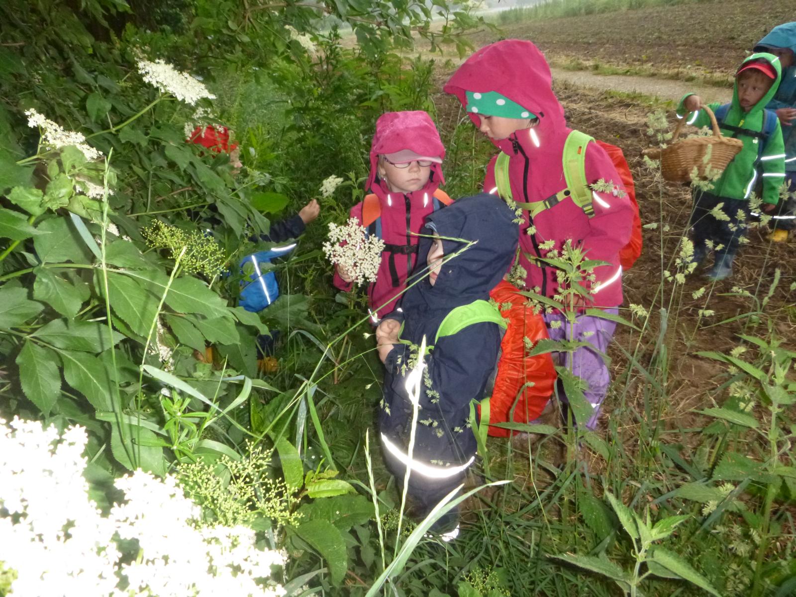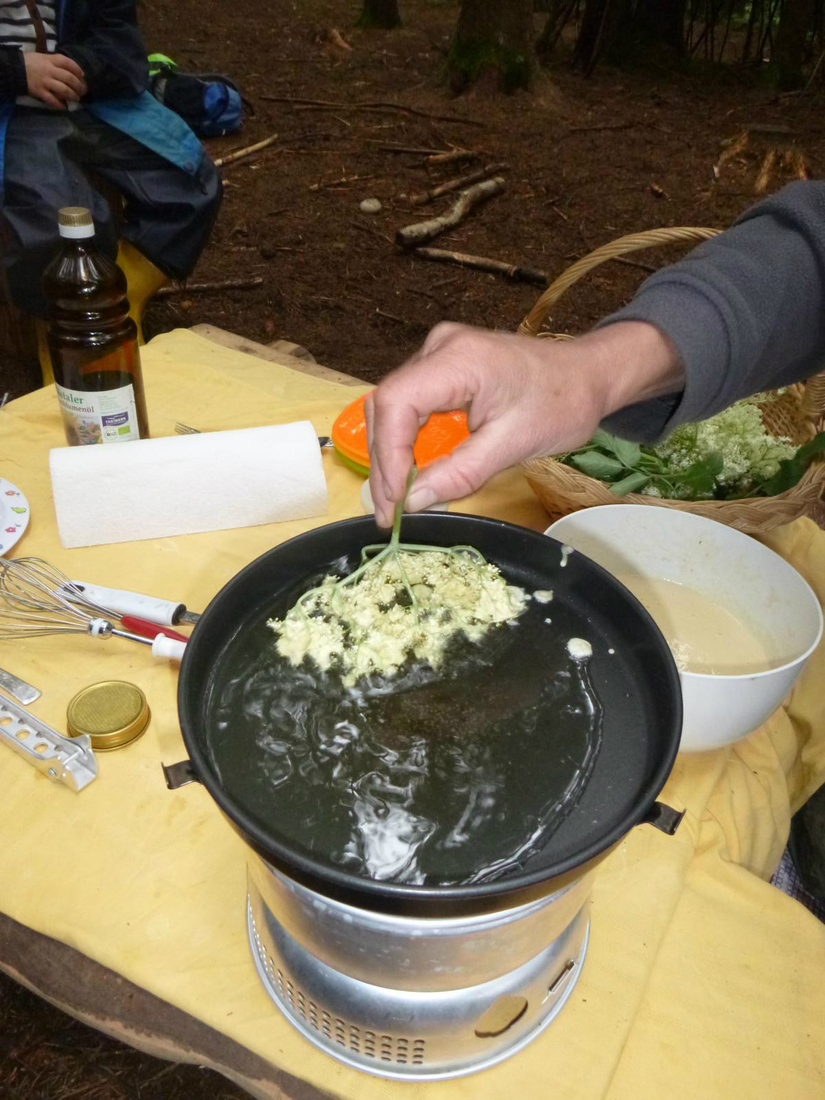 Die weißen Blütendolden des Holunders leuchteten den Waldkindergartenkindern schon von weitem entgegen, als sie sich nach den Pfingstferien wieder auf den Weg ins Lausbacher Holz machten. Höchste Zeit, den Kochtopf auszupacken und Hollerkücherl zu backen. Und so pflückten die Kinder einen ganzen Korb voller duftender Blüten, rührten gemeinsam einen Pfannkuchenteig an, tauchten die feinen Blüten hinein und buken sie schließlich im heißen Fett aus. Bald roch es am Moosplatz ganz lecker und keiner der Kinder konnten den knusprigen Hollerkücherln wiederstehen. Zwar war es für einige der kleinen Köche anfangs etwas ungewohnt, die Blütenstiele „abzuzuzeln“, doch am Ende blieb kein Krümelchen übrig.