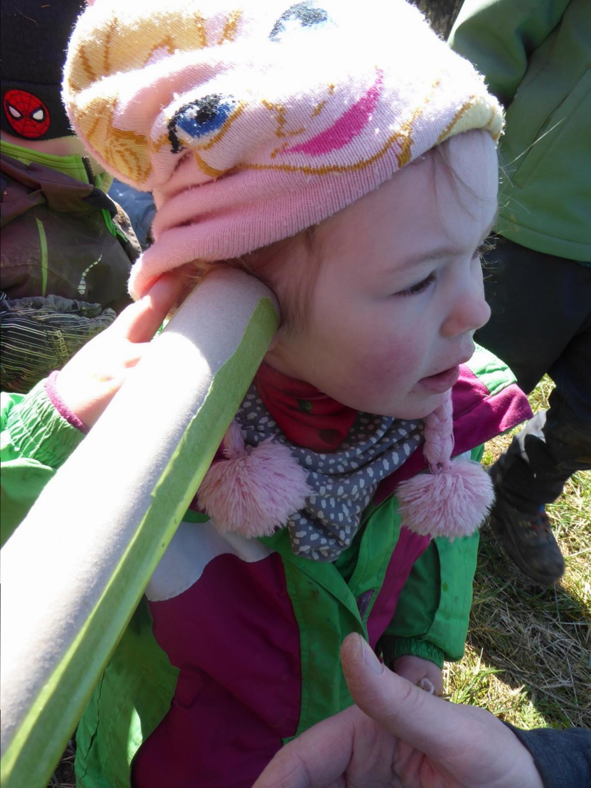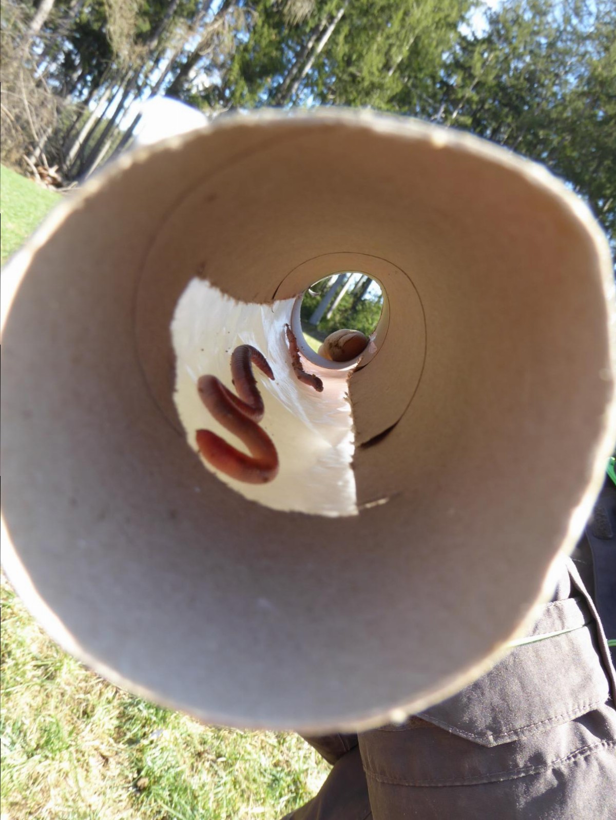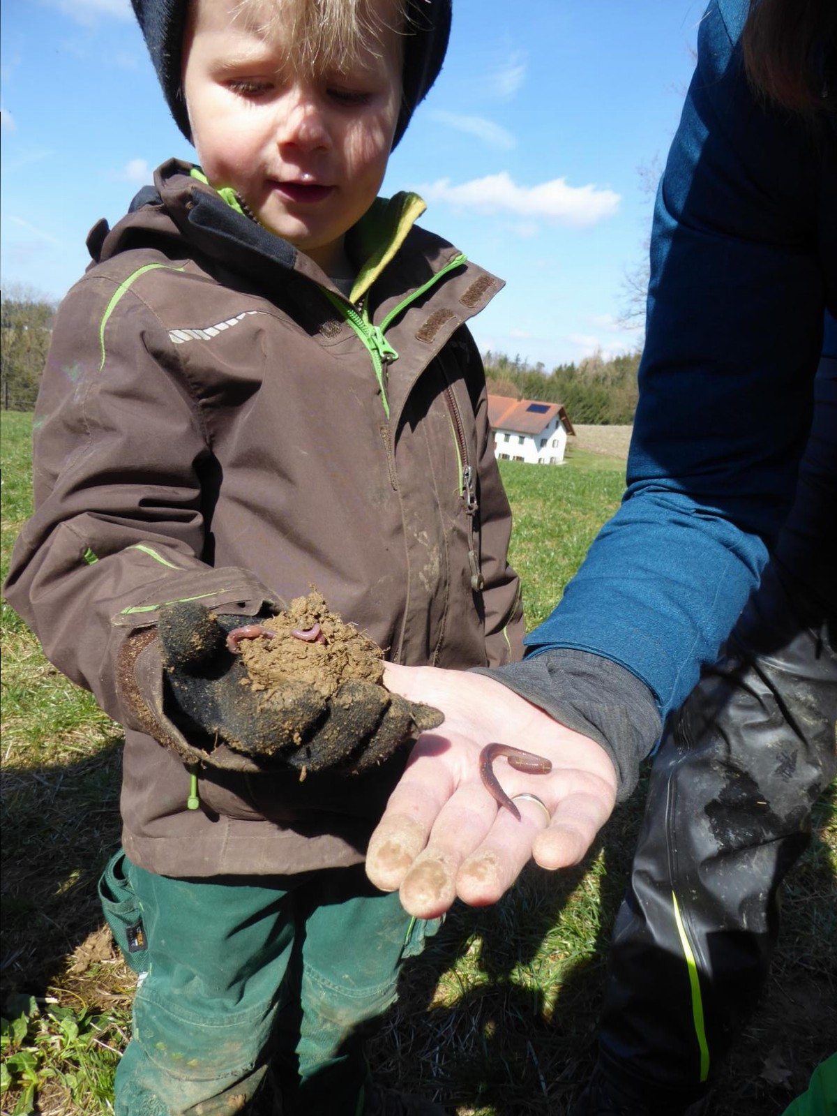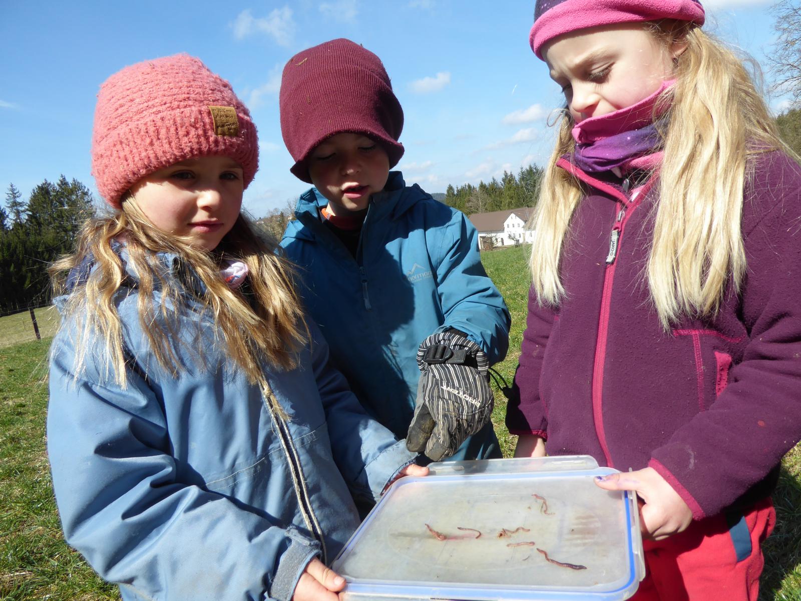 Zu jedem Geburtstag, der im Wald gefeiert wird, laden die Waldlauser die kleine Eule Schuschu ein. Die berichtet von ihren Freunden, die sie im Wald gefunden hat - und da gibt es jedesmal Erstaunliches zu hören. Bei einem ihrer Besuche erzählte Schuschu von den Regenwürmern, die nun vermehrt wieder an der Erdoberfläche zu finden sind. Dass Regenwürmer die Erde lockern und düngen, dass sie Blätter unter die Erde ziehen und herauskommen, wenn es zu stark regnet, da sie sonst in ihren Wurmgängen ertrinken würden, dass wussten die Waldlauser schon. Dass Regenwürmer das 60-fache ihres Körpergewichtes beim Graben stemmen können und sogar „Füße“ haben, brachte die Kinder zum Staunen. Gemeinsam machten sich die Waldlauser auf Wurmsuche und förderten aus der Erde große und kleine Exemplare zu Tage. Eingehend wurden sie betrachtet, die dicken Ringe entdeckt, die zur Fortpflanzung nötig sind und überlegt, wo denn vorn und hinten sei. Mittels einer präparierten Papierröhre konnten dann auch die Geräusche vernommen werden, die die kleinen Borsten erzeugen, mit denen sich die Würmer fortbewegen. Schweren Herzens wurden die Erdbewohner schließlich wieder in die Freiheit entlassen und verschwanden zügig in der feuchten Erde. Das hatten die Waldlauser vorher der Eule Schuschu versprochen…..