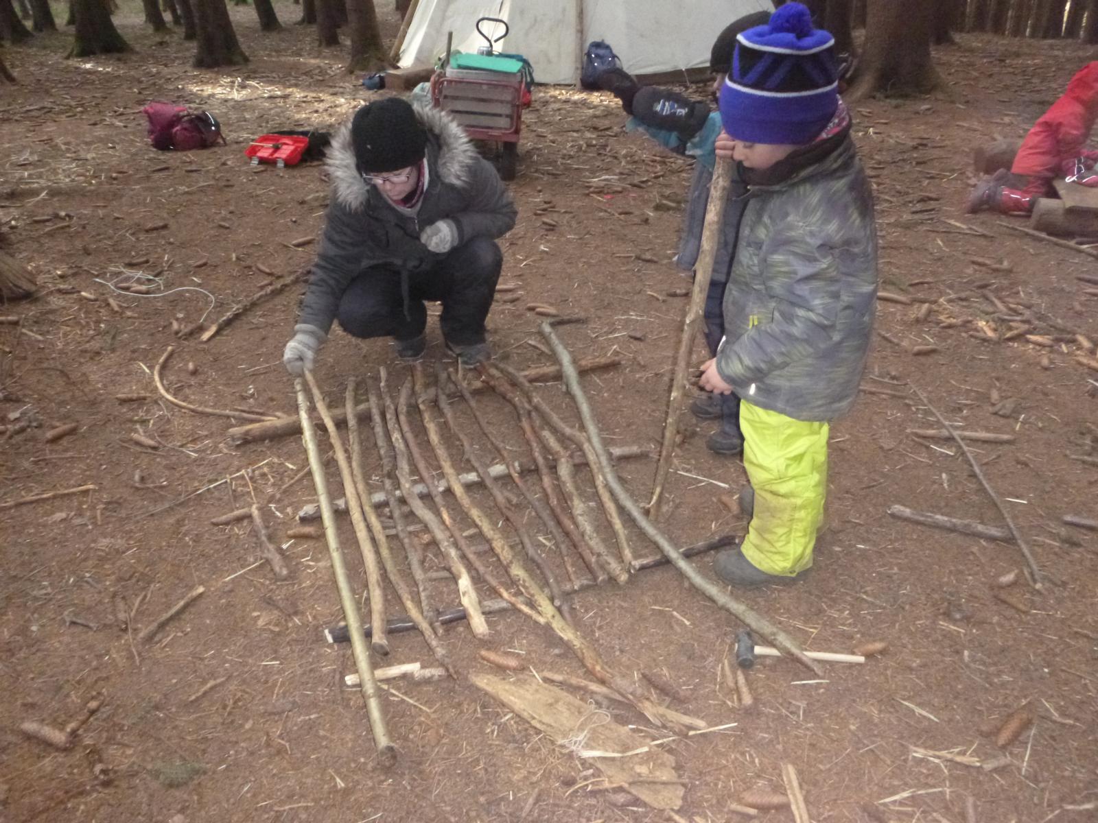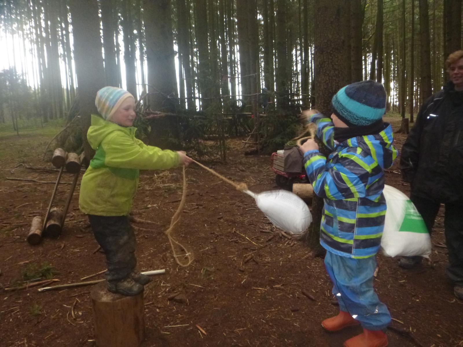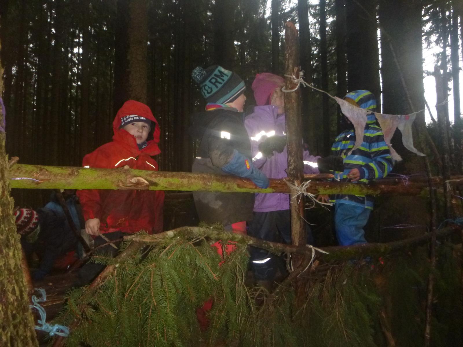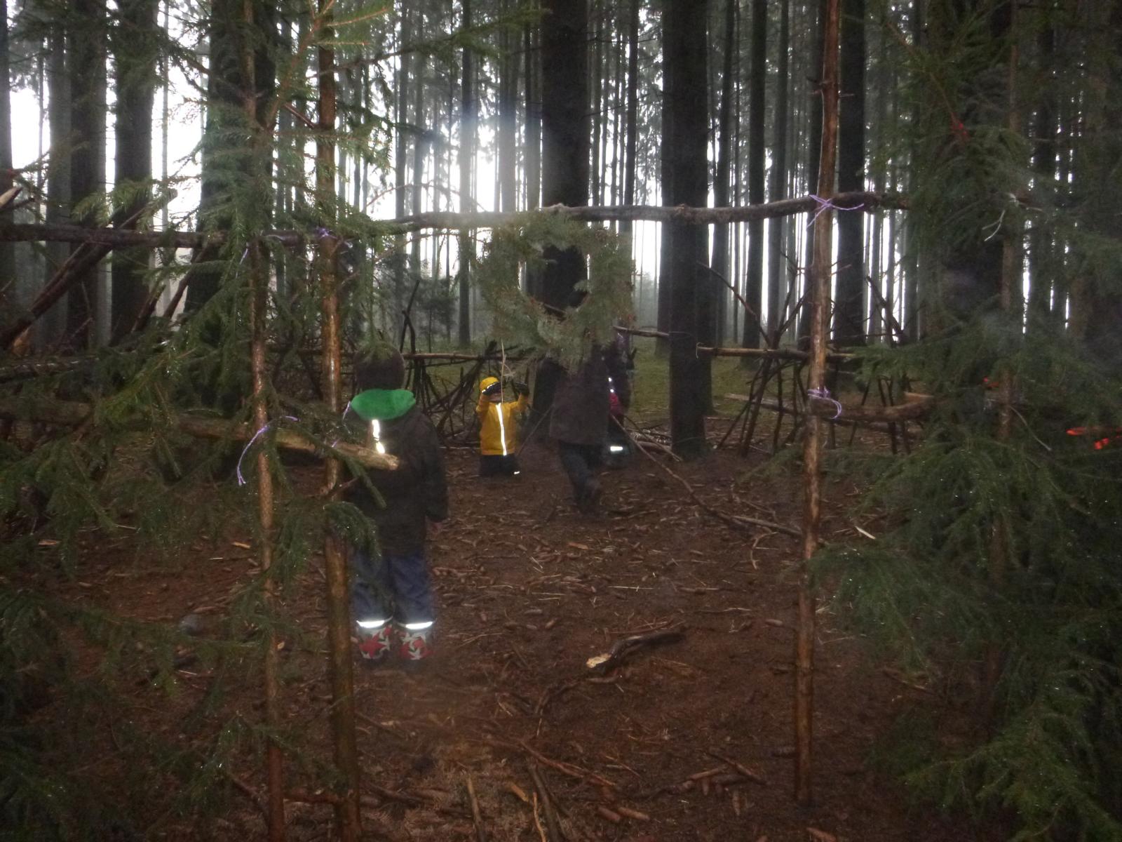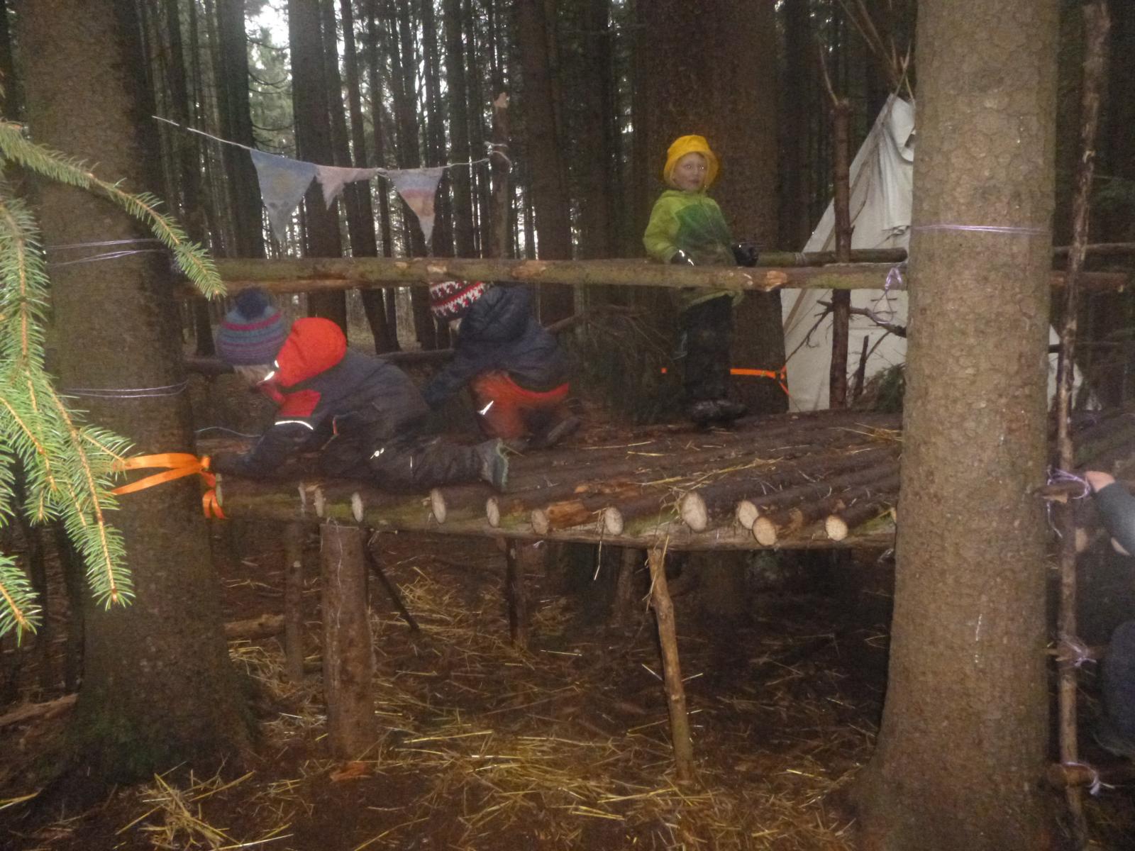 Die Begeisterung für den Bau war am Anfang riesengroß und die Helfer zahlreich. Doch während des Baus schlüpften die Kinder so sehr in ihre Rollen hinein, dass das Bauen zweitrangig wurde und das Rollenspiel an erster Stelle stand Da wurden in dem halbfertigen Bau gleich Wachen positioniert, Pferde untergestellt und die Burgküche in Betrieb genommen. Aber wir Großen brauchen ja auch etwas zu tun und freuten uns, dass die Kinder sich so auf das Thema einliesen.