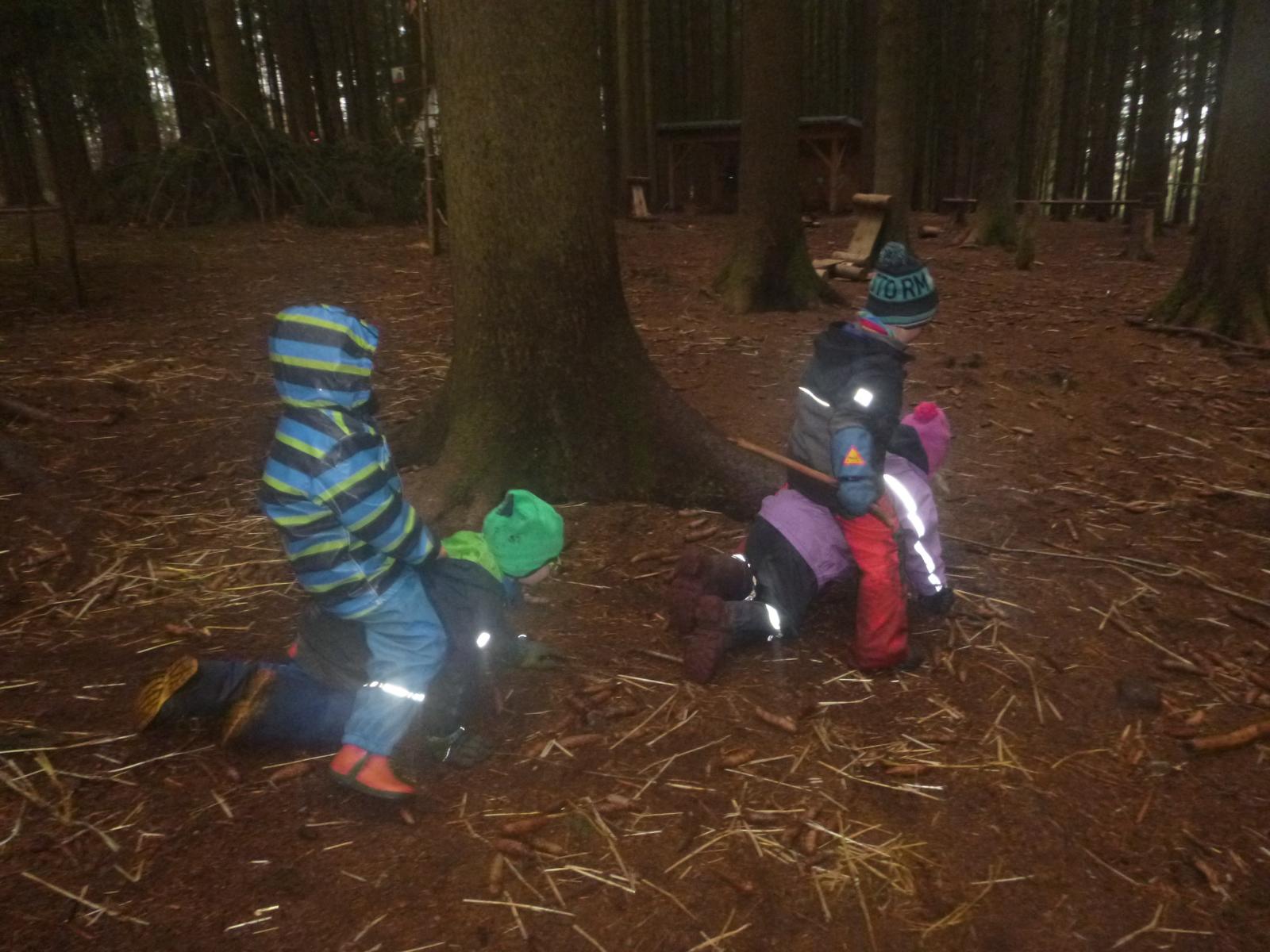 „Ich bin der Ritter Kunibert…..“ schmettern die Kinder mit Begeisterung durch den Wald! Bald mischte sich so mancher tapfere Ritter, Page oder Knappe, anmutige Burgfräuleins und feuerspeiende Drachen ins Spiel der Kinder mit ein und in vielen Geschichten, Fingerspielen und Liedern näherten wir uns dem Thema Mittelalter an.