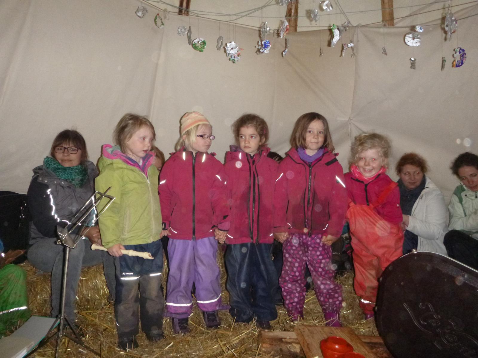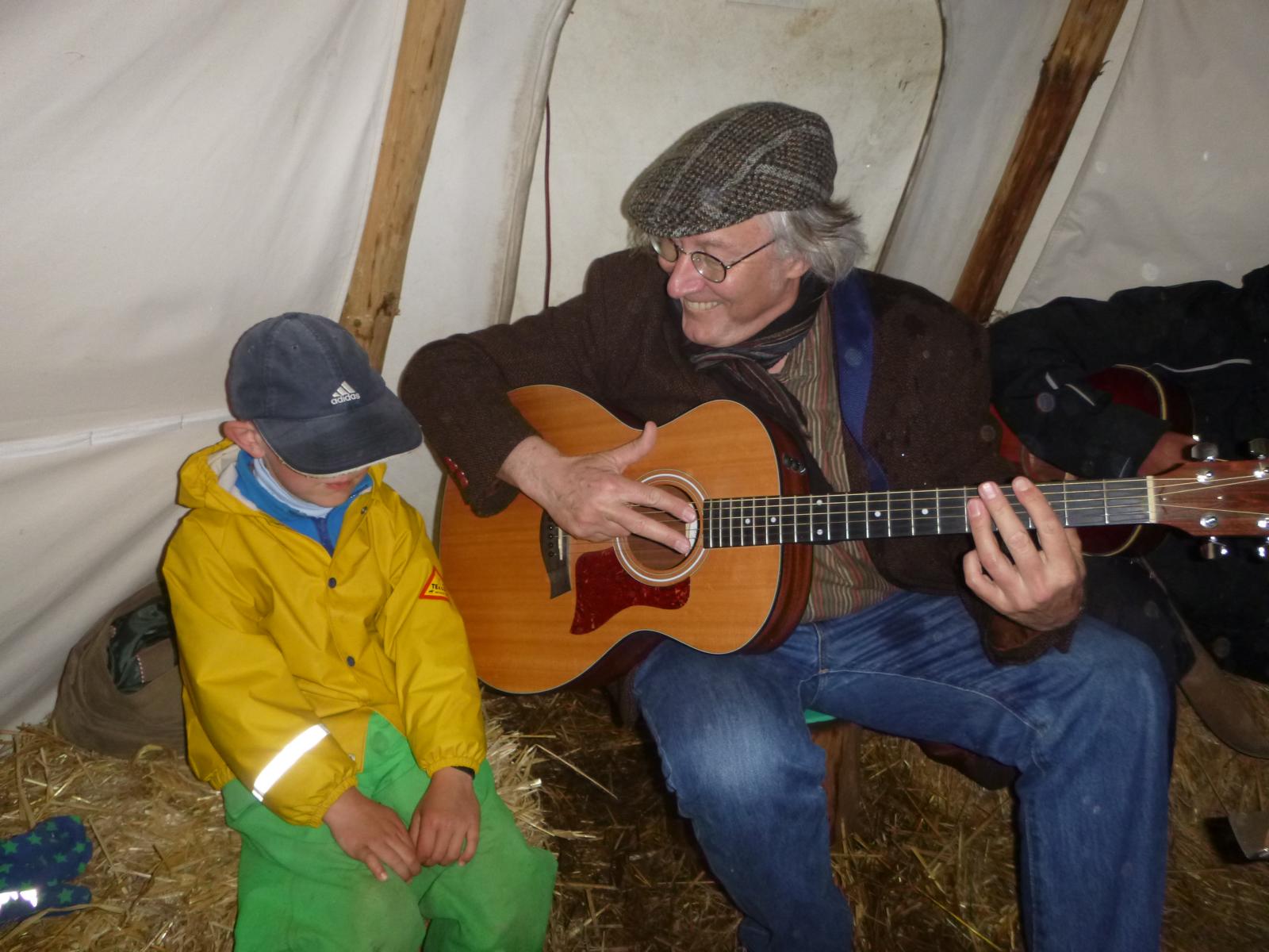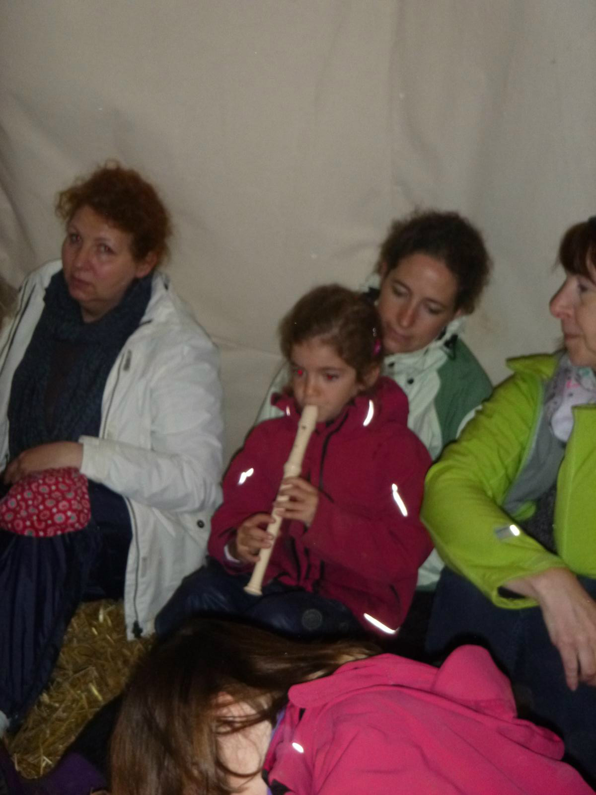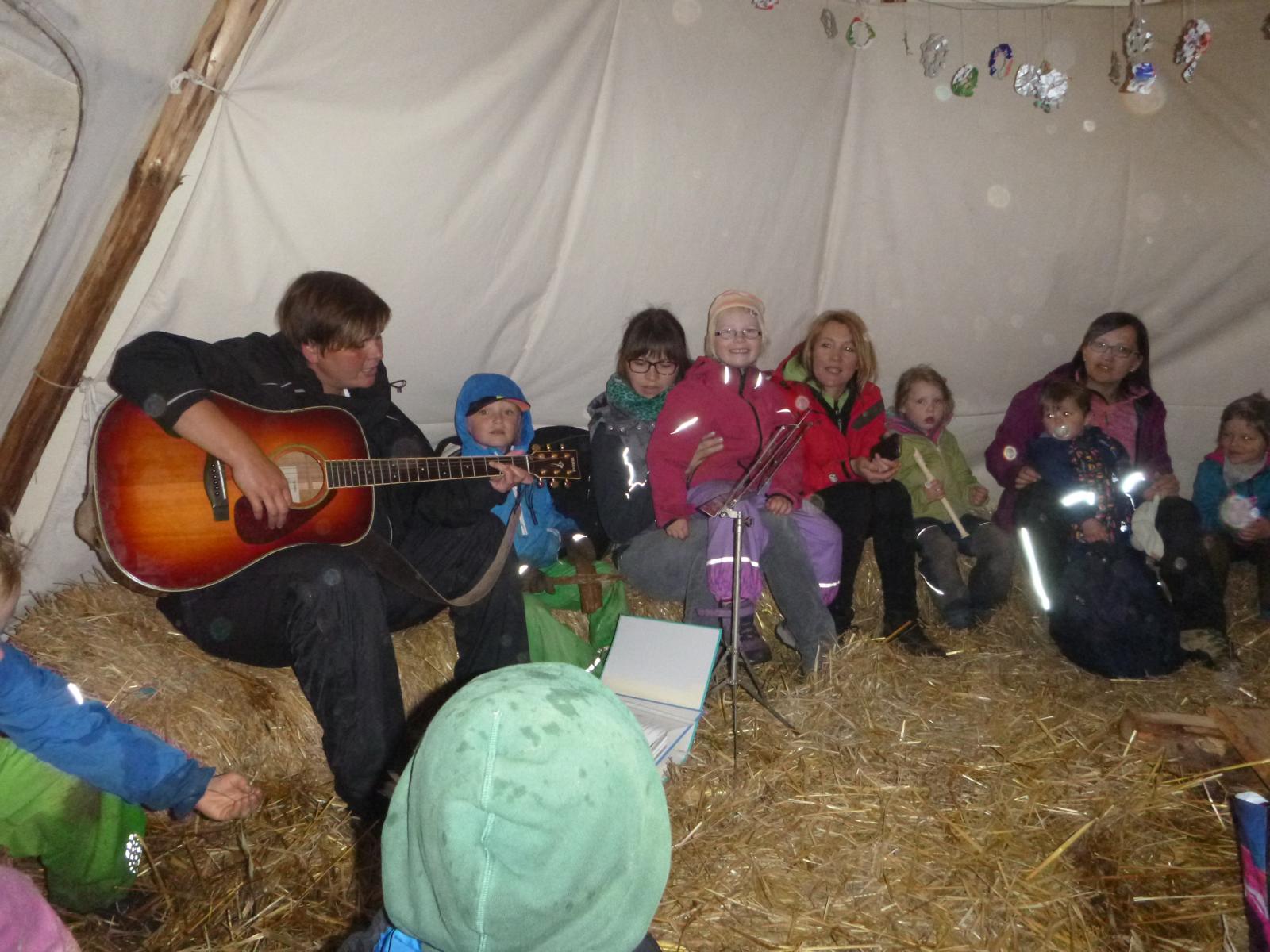 Gesungen wird jeden Tag im Lausbacher Holz. Doch heute luden sich die Waldkinder im Rahmen des Aktionstages Musik noch sangesfreudige Unterstützung ein: viele Eltern und Großeltern kamen am späten Vormittag in den Wald, bepackt mit Liederwünschen und Instrumenten. Aufgrund der nasskalten Witterung setzte man sich im Tipi zusammen und schon bald ertönten in der gemütlichen Runde die Liederwünsche der Kinder und Erwachsenen. Da gab es Sologesänge, Flöteneinlagen und Rhythmusstücke. Vor allem aber wurden viele Lieder gemeinsam und aus voller Kehle gesungen. Die Bandbreite war groß: Der Kuckuck und der Esel waren ebenso dabei, wie der Feuerwehrmann Sam, die Beatles und Eros Ramazotti.