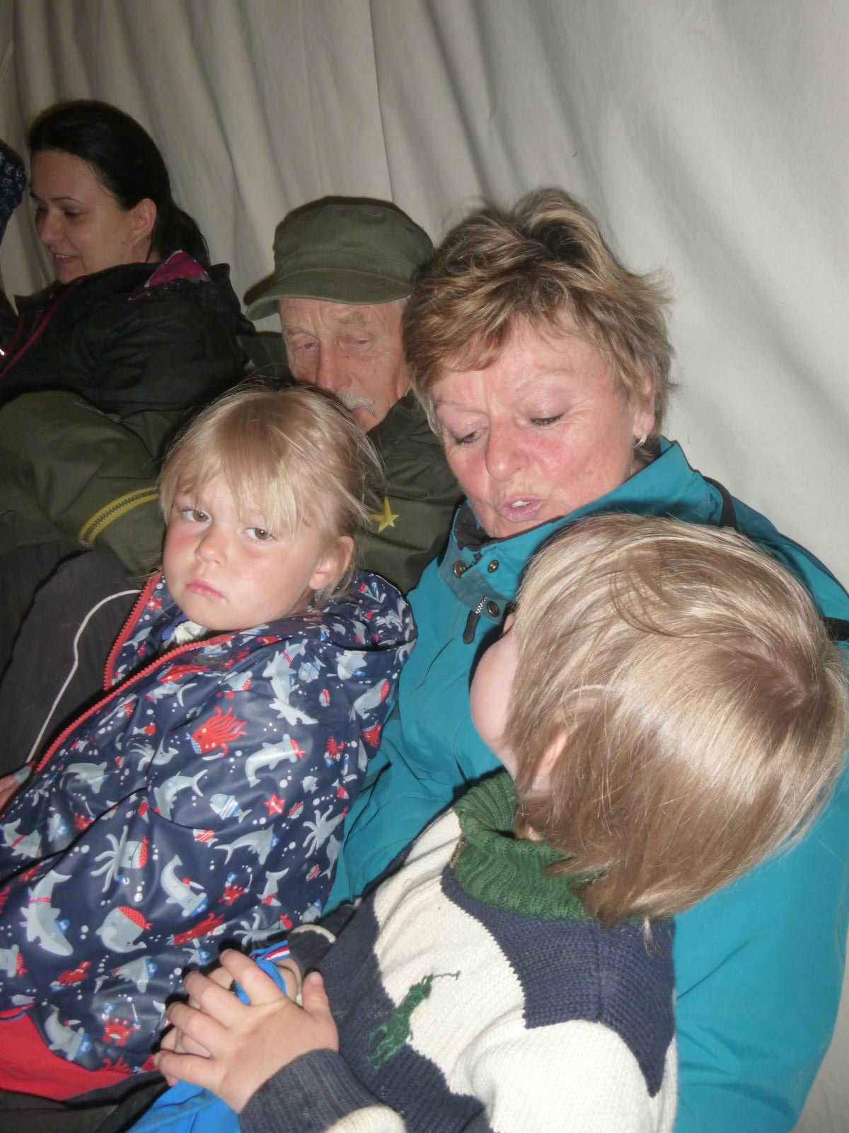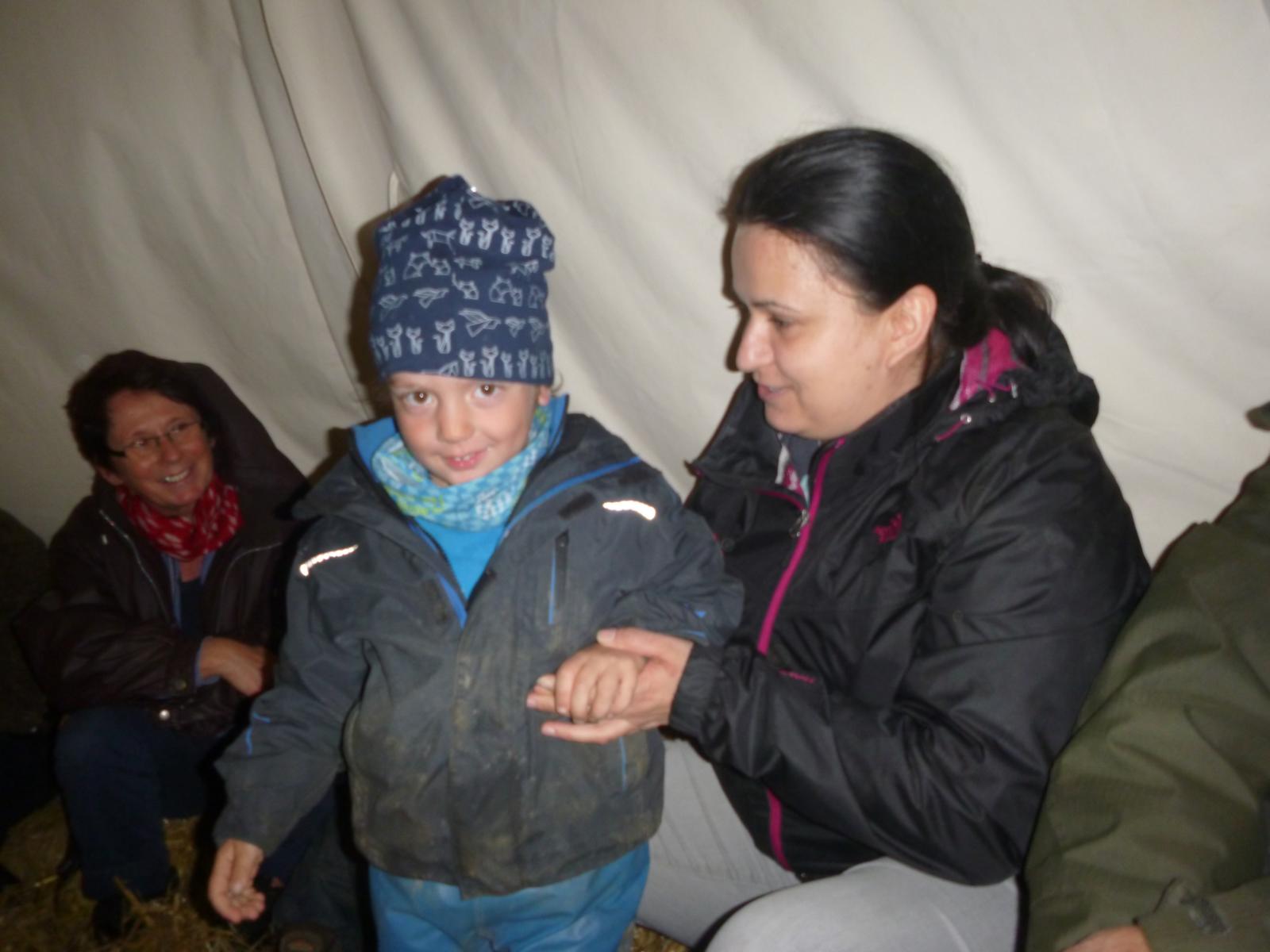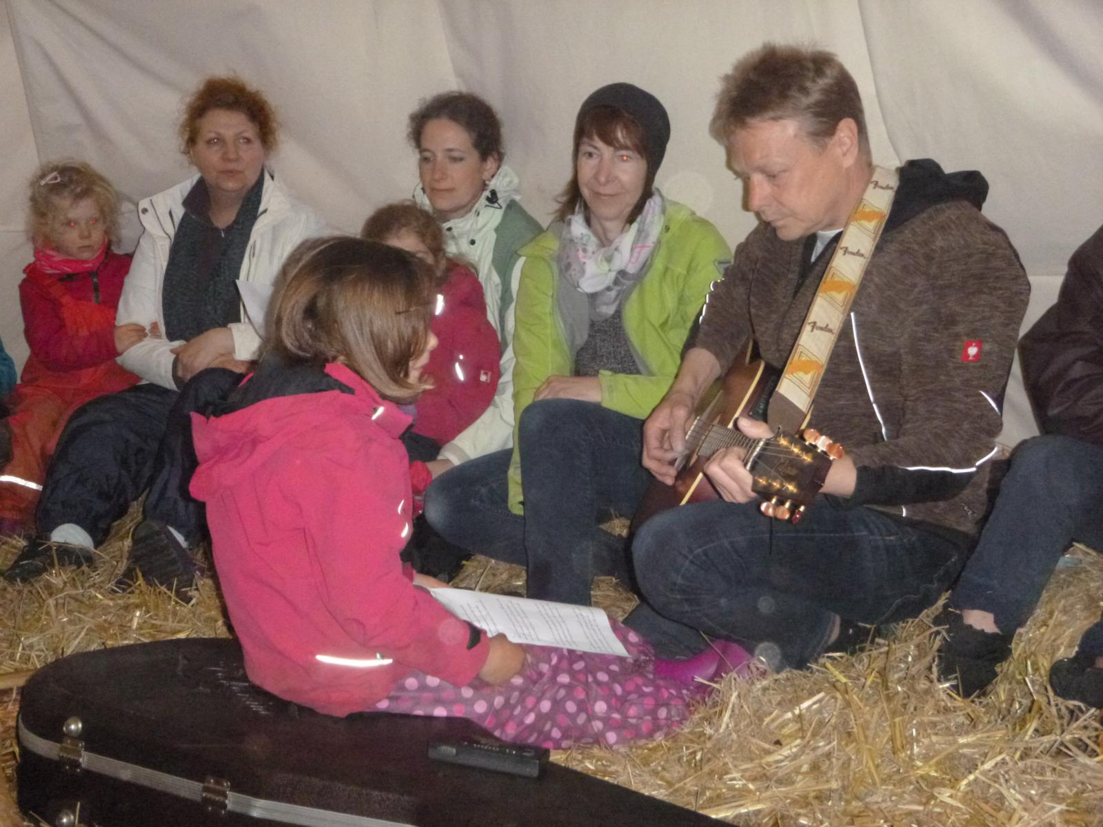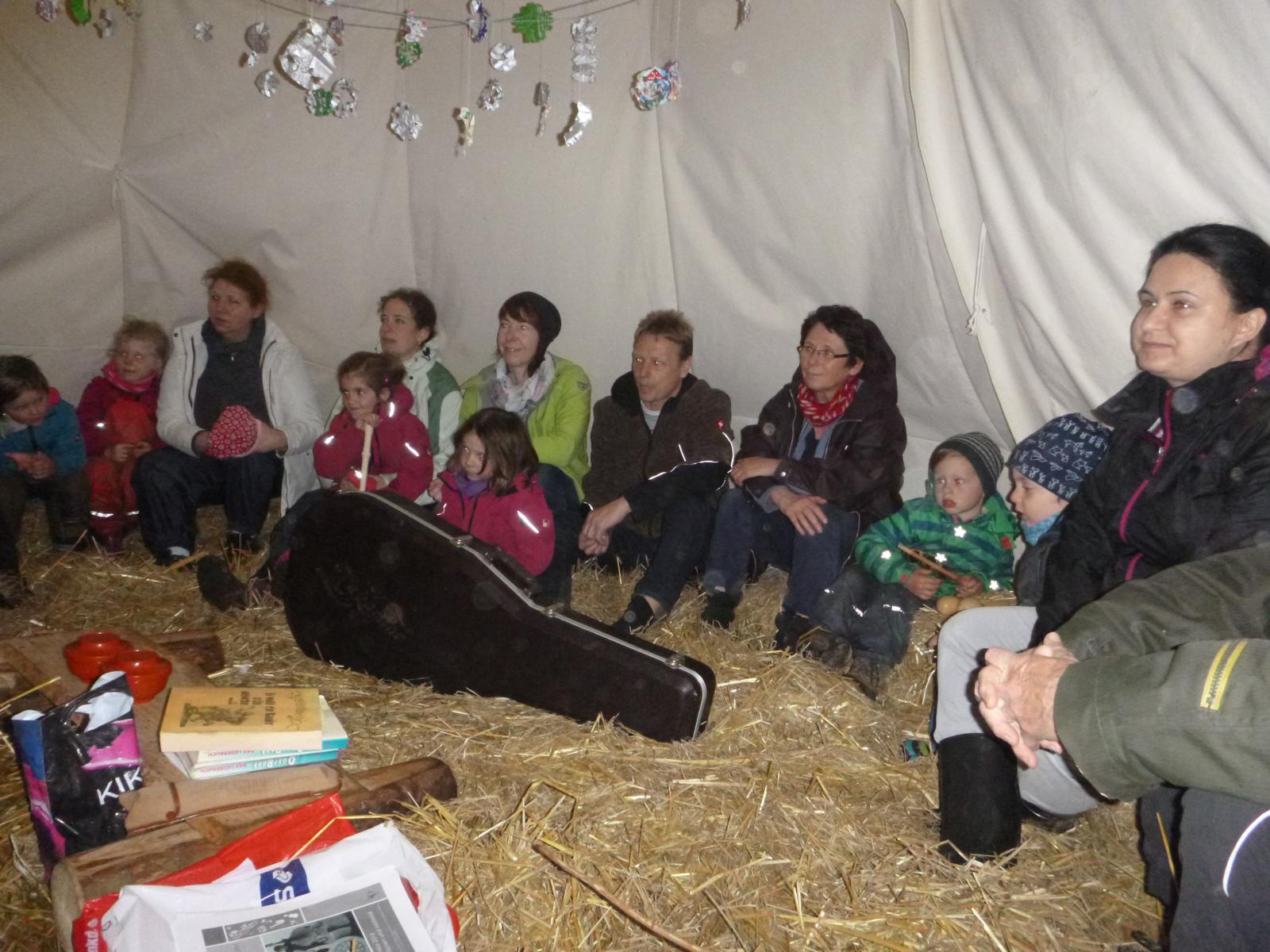 Gesungen wird jeden Tag im Lausbacher Holz. Doch heute luden sich die Waldkinder im Rahmen des Aktionstages Musik noch sangesfreudige Unterstützung ein: viele Eltern und Großeltern kamen am späten Vormittag in den Wald, bepackt mit Liederwünschen und Instrumenten. Aufgrund der nasskalten Witterung setzte man sich im Tipi zusammen und schon bald ertönten in der gemütlichen Runde die Liederwünsche der Kinder und Erwachsenen. Da gab es Sologesänge, Flöteneinlagen und Rhythmusstücke. Vor allem aber wurden viele Lieder gemeinsam und aus voller Kehle gesungen. Die Bandbreite war groß: Der Kuckuck und der Esel waren ebenso dabei, wie der Feuerwehrmann Sam, die Beatles und Eros Ramazotti.