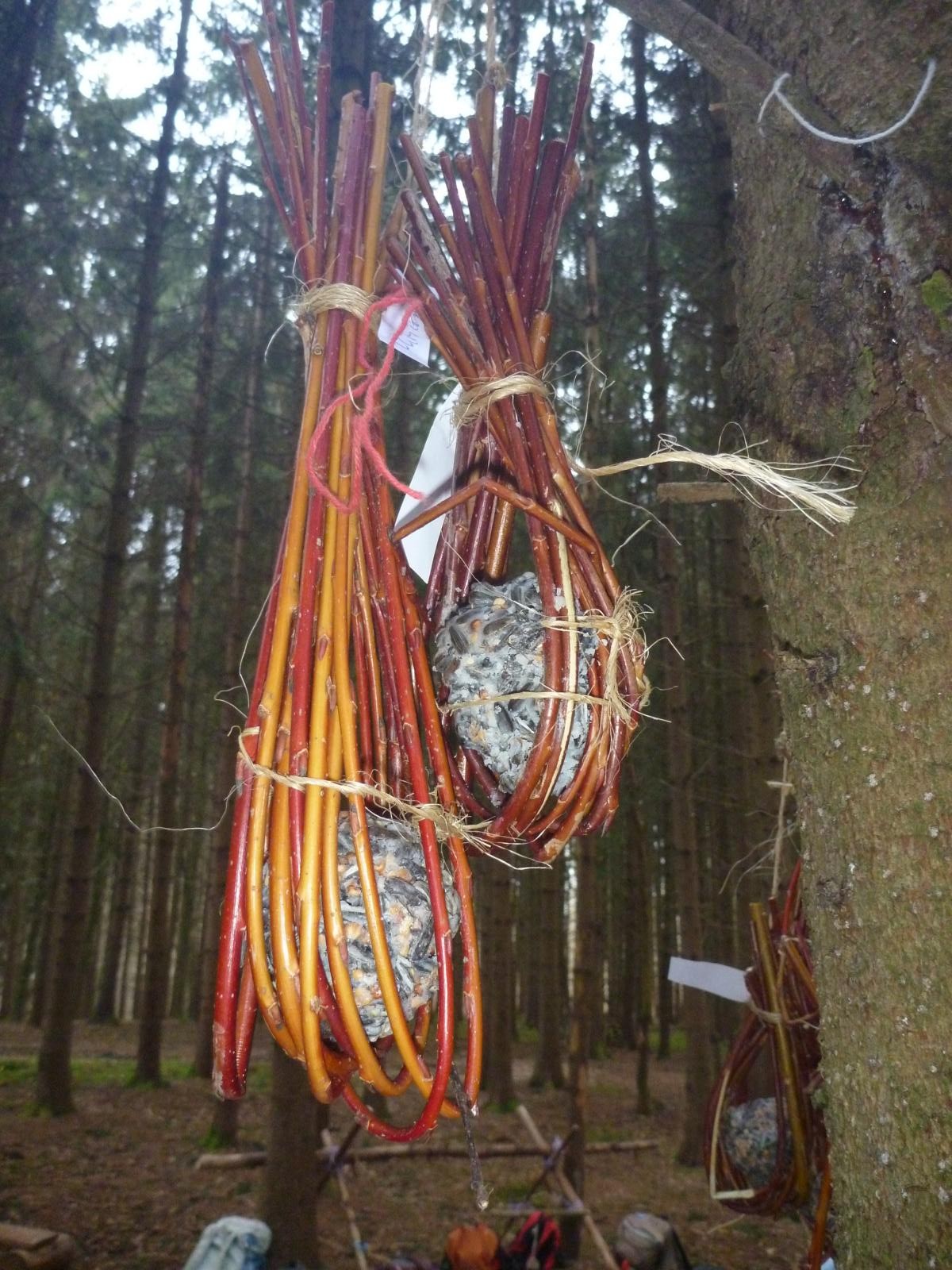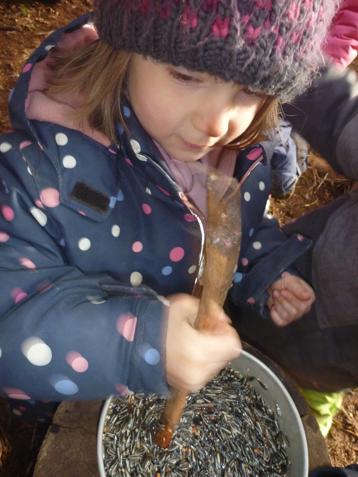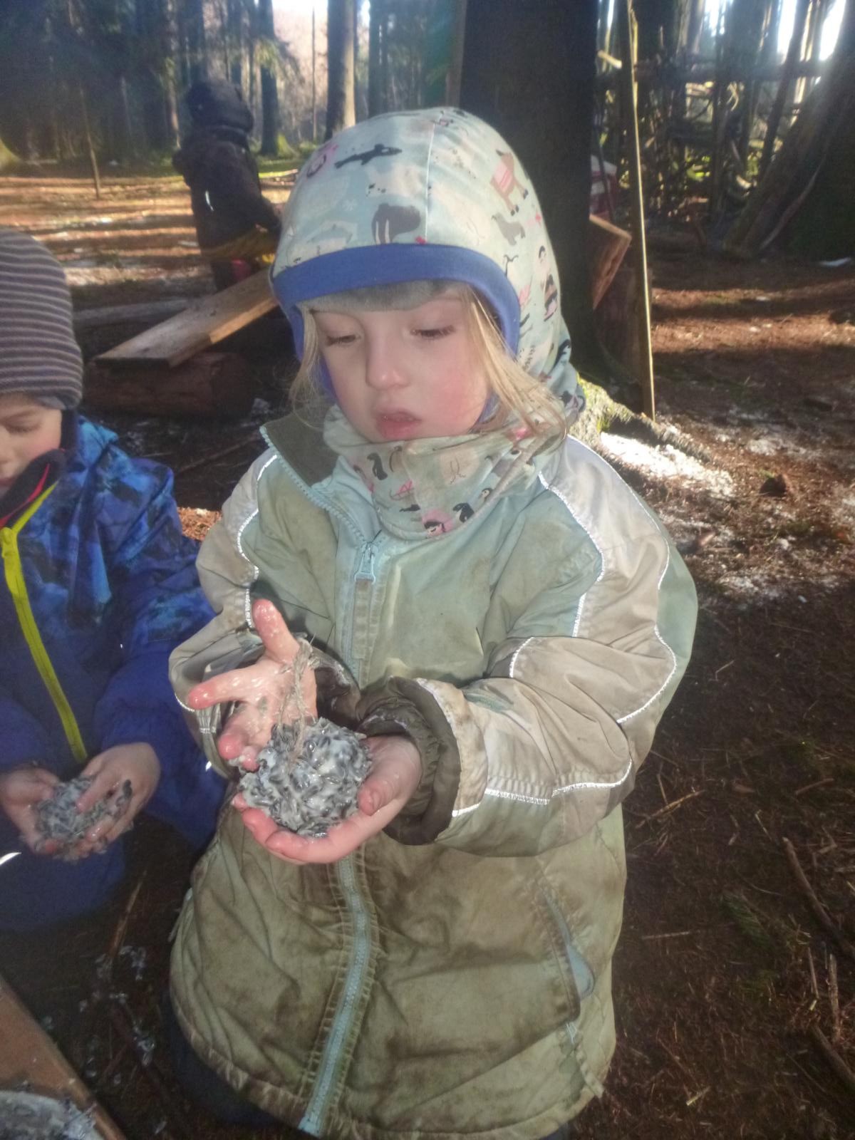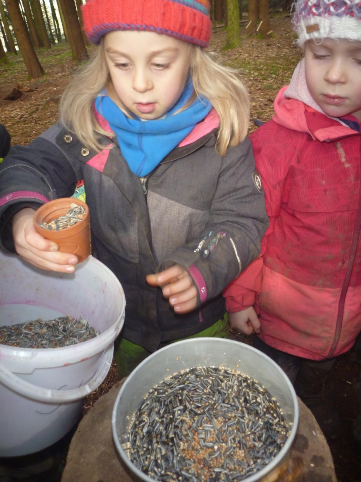Und so schmelzen die Kinder Fett und rühren verschiedene Körner und Samen darunter. Aus der erkalteten Masse werden Kugeln geformt, mit verschiedenen Aufhängern aus Schnur und Weidenzweigen versehen und schließlich werden die fertigen Futterkugeln aufgehängt. Natürlich nehmen die Waldlauser auch noch etwas mit nach Hause – schließlich freuen sich die Vögel daheim im Garten auch über leckeres Futter.