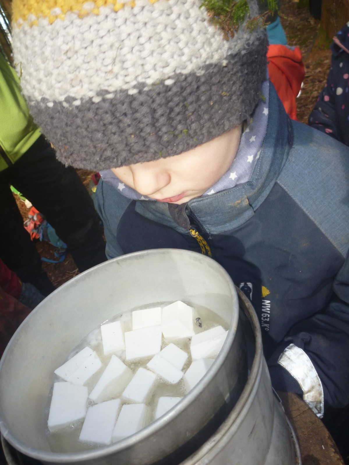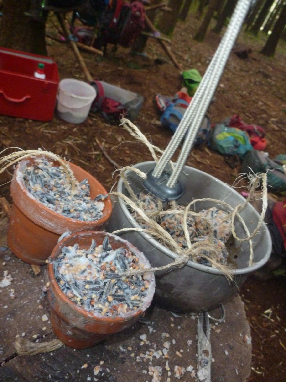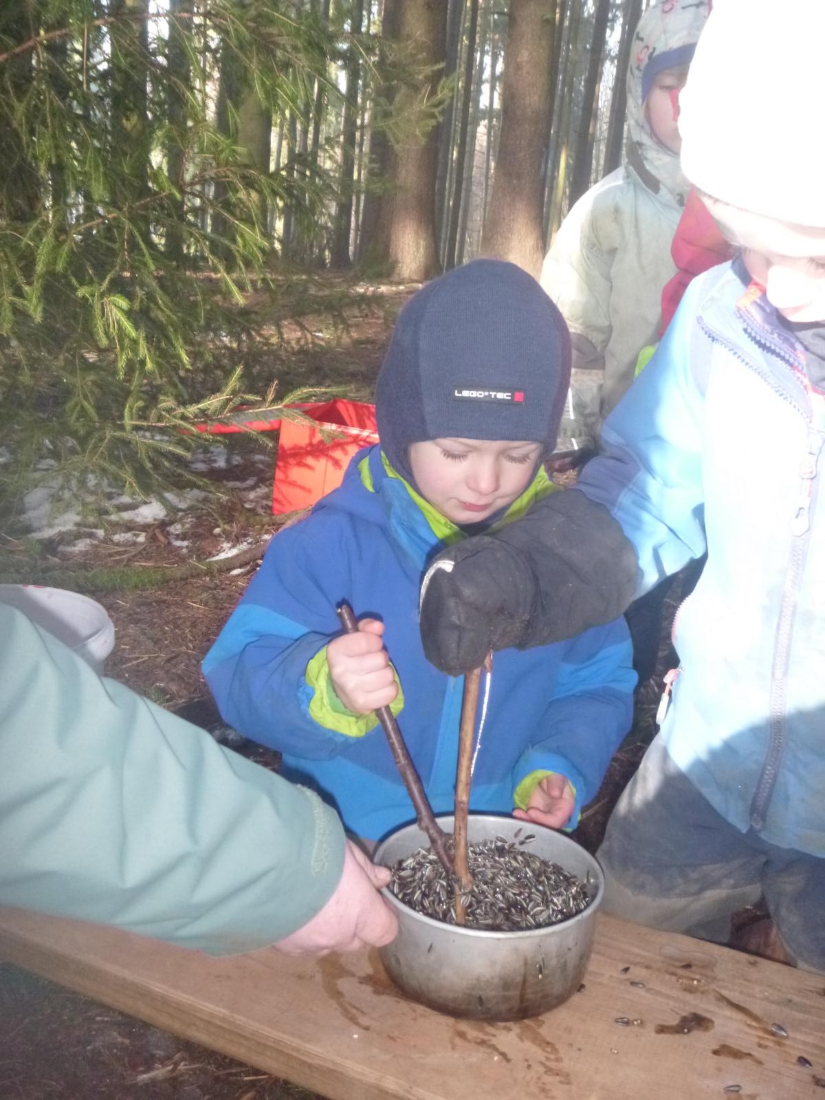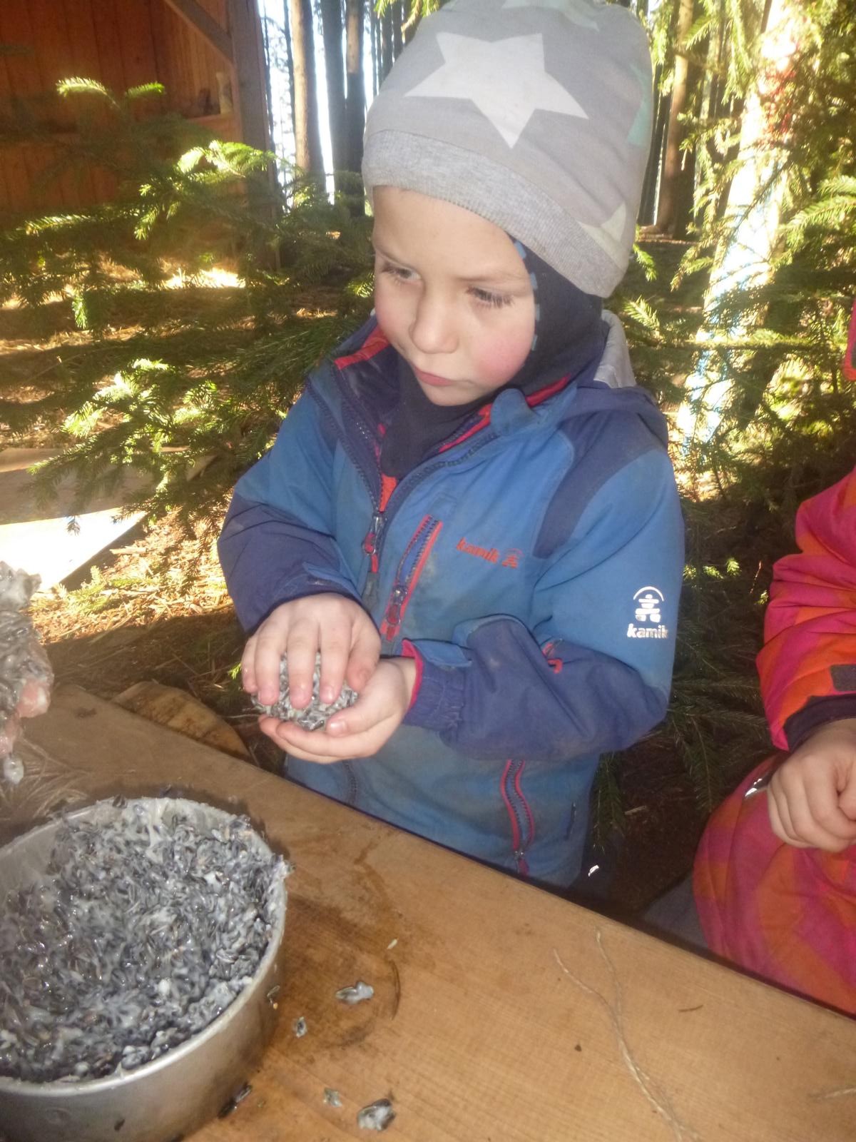 Und so schmelzen die Kinder Fett und rühren verschiedene Körner und Samen darunter. Aus der erkalteten Masse werden Kugeln geformt, mit verschiedenen Aufhängern aus Schnur und Weidenzweigen versehen und schließlich werden die fertigen Futterkugeln aufgehängt. Natürlich nehmen die Waldlauser auch noch etwas mit nach Hause – schließlich freuen sich die Vögel daheim im Garten auch über leckeres Futter.