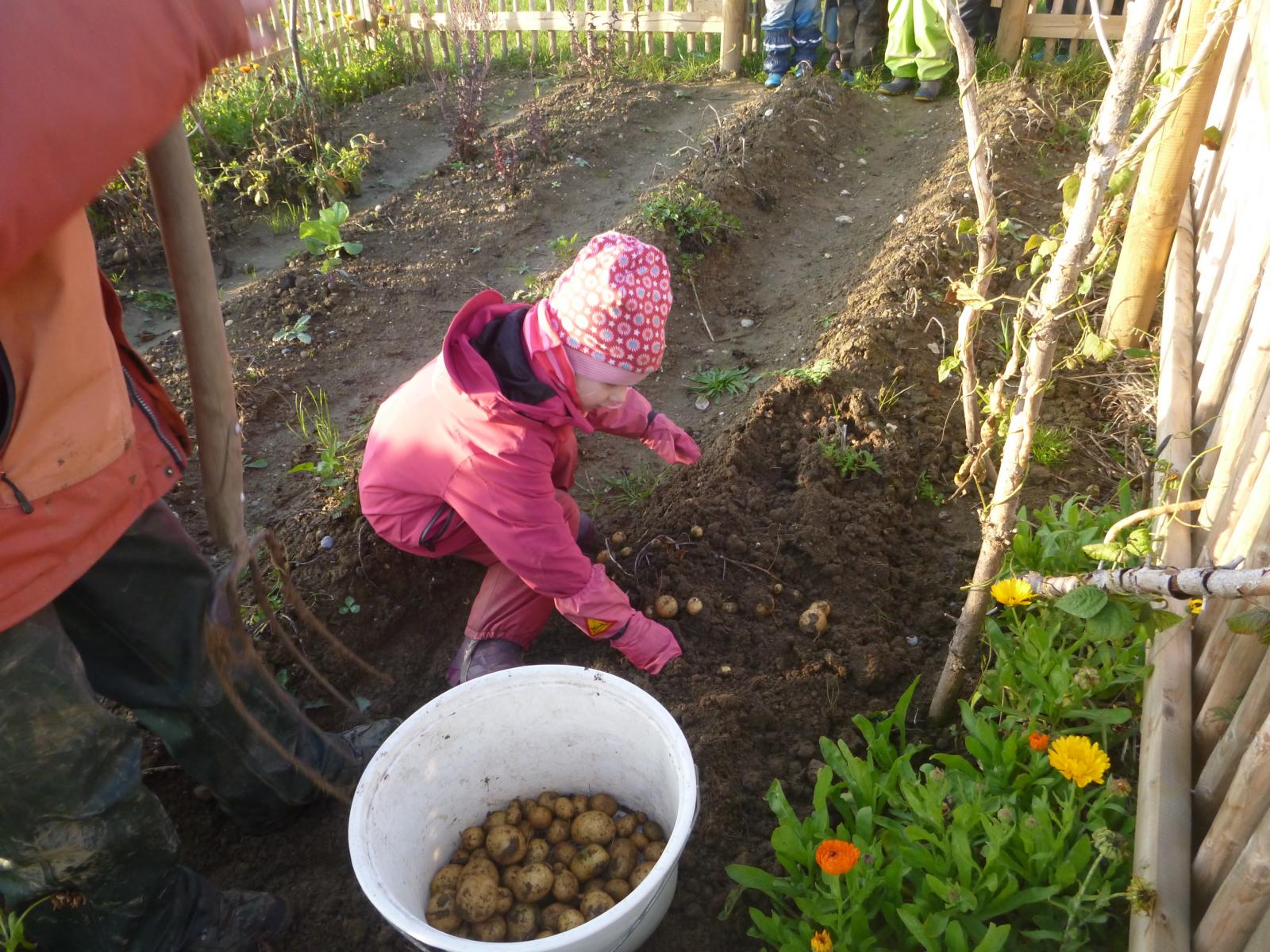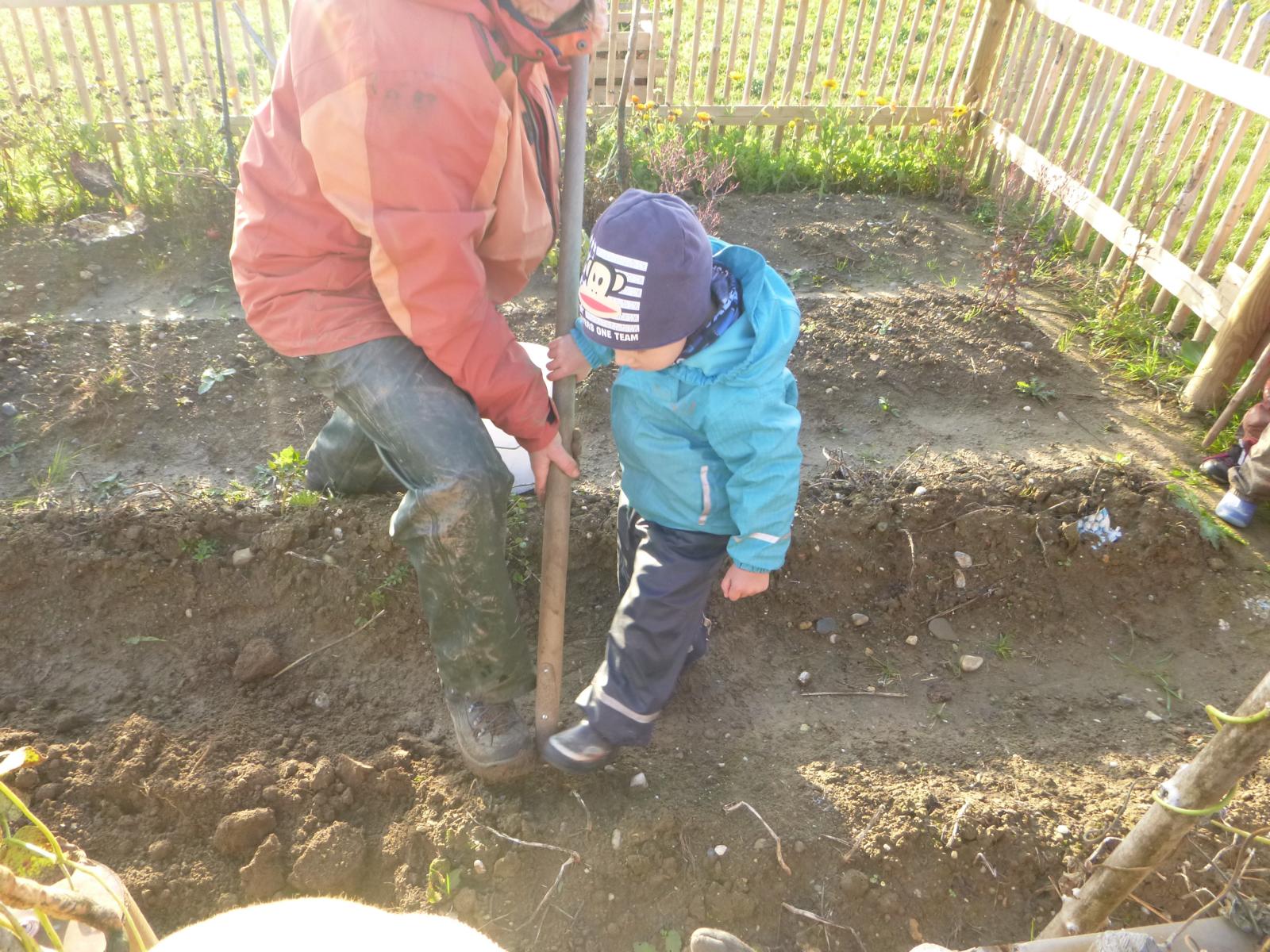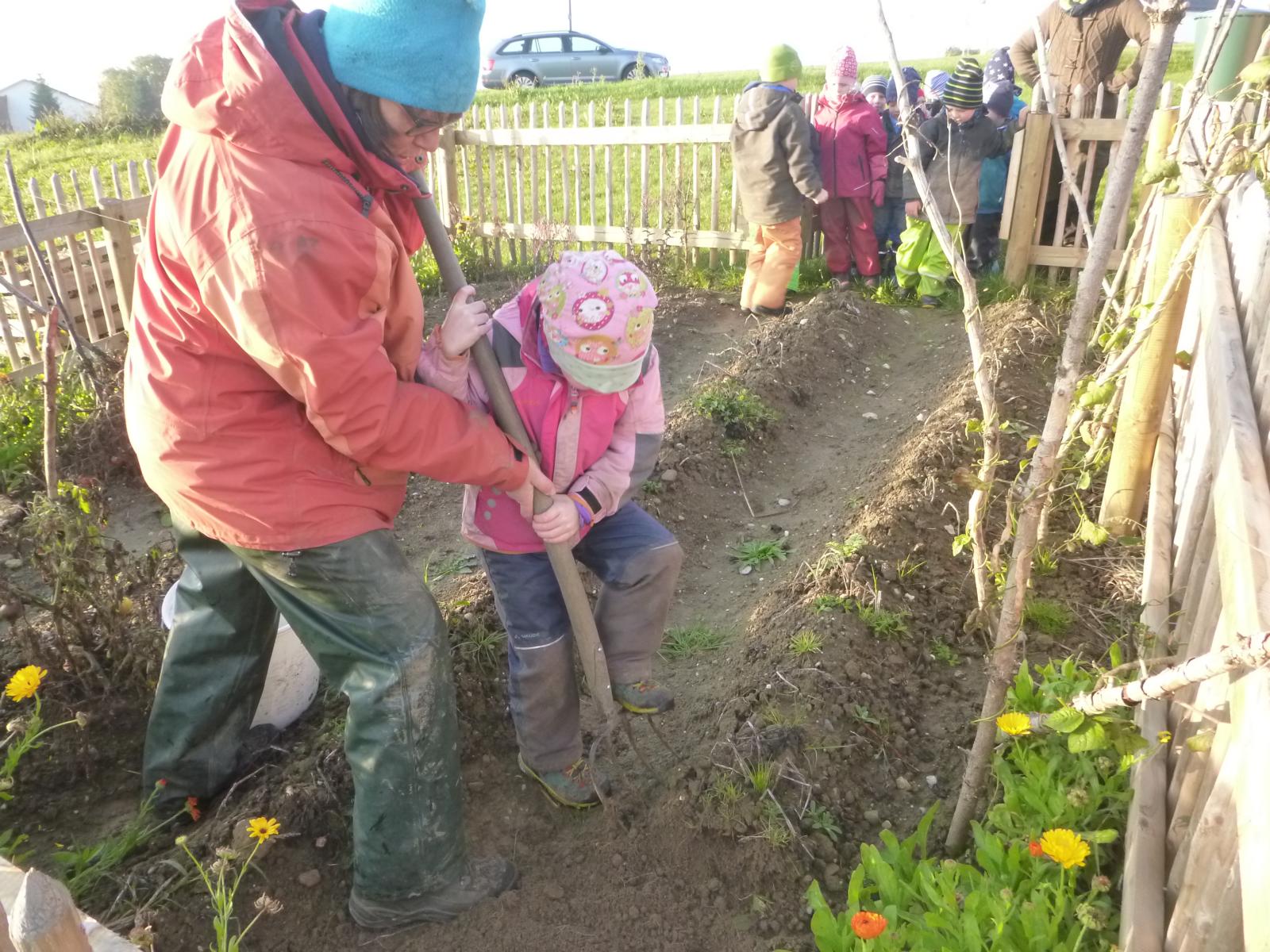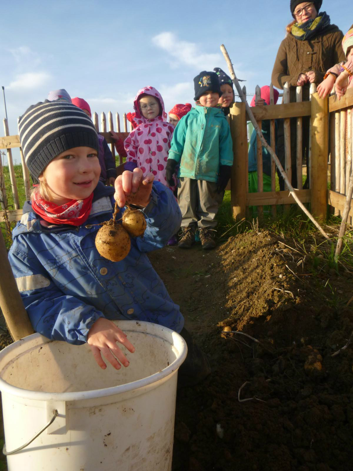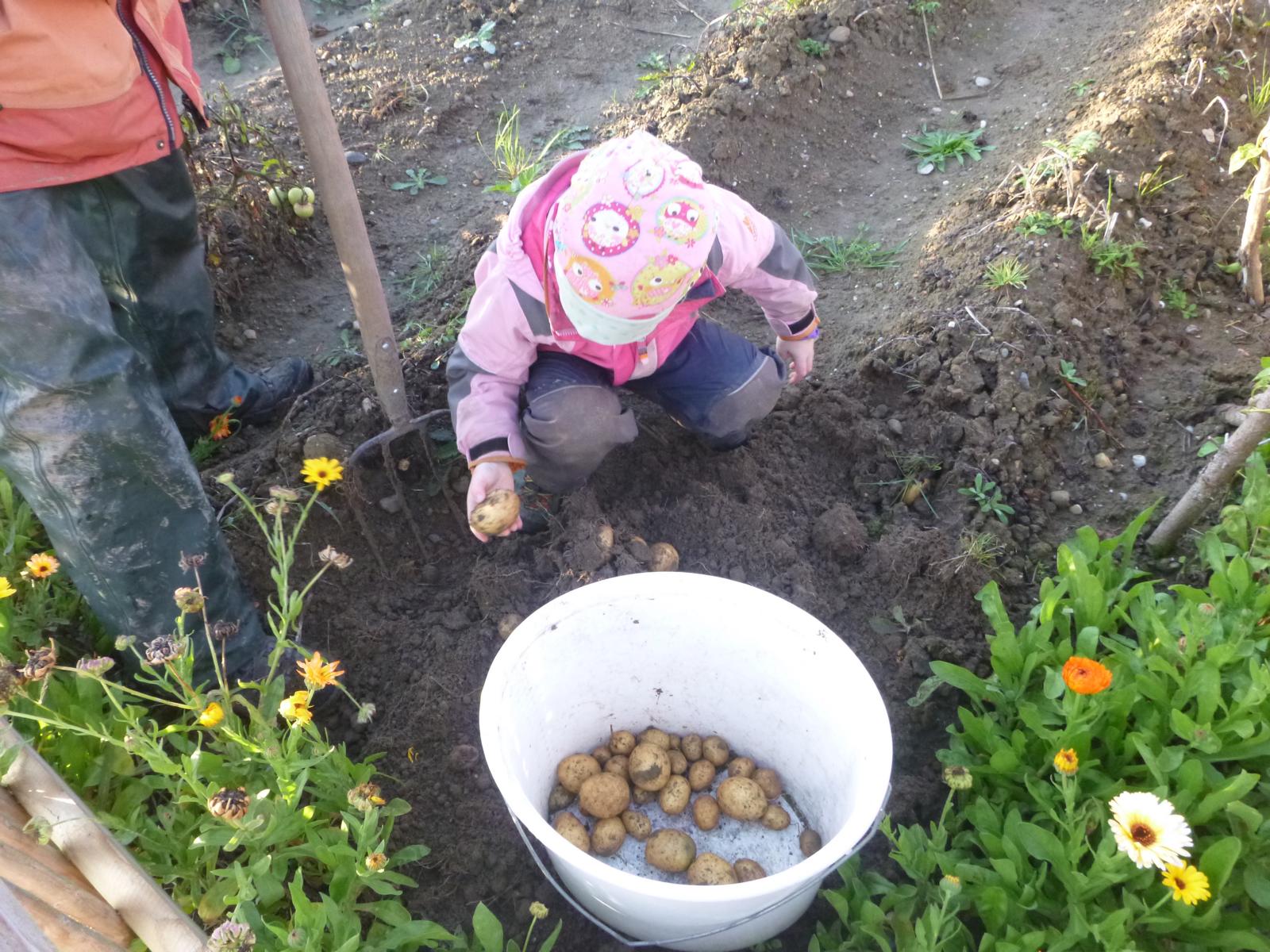 Mit Grabegabel und großem Eimer machten wir uns ans Werk. Jedes Kind versuchte sein Glück, grub gespannt in die Tiefe und wurde fündig. Nach und nach wurde der Kartoffelschatz geborgen und unser großer Eimer tatsächlich bis zum Rand gefüllt.