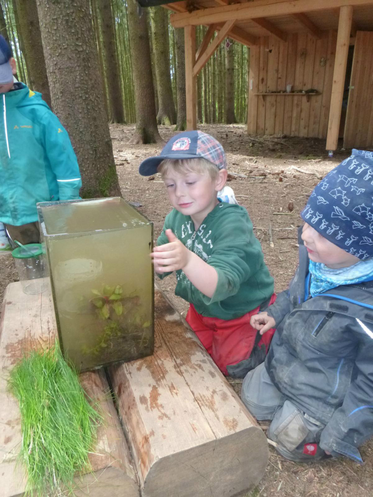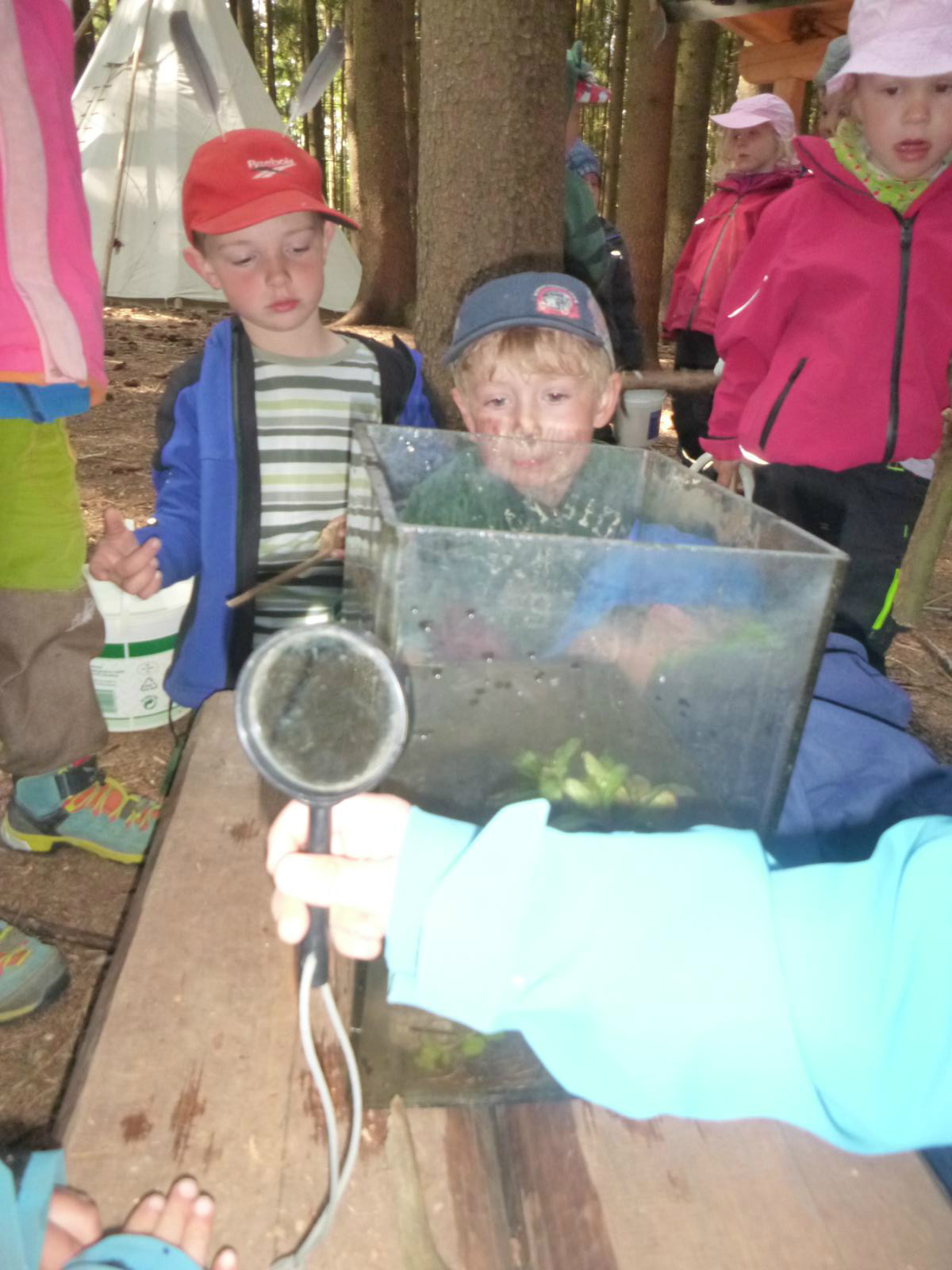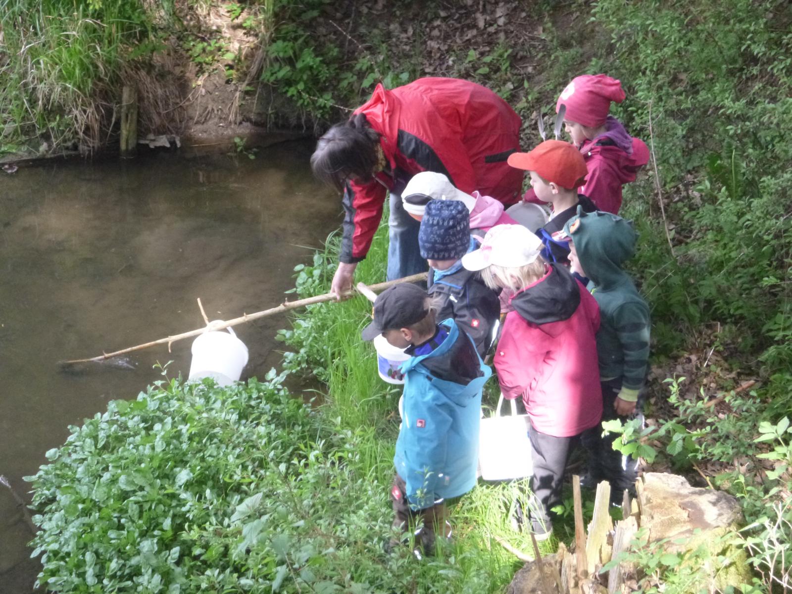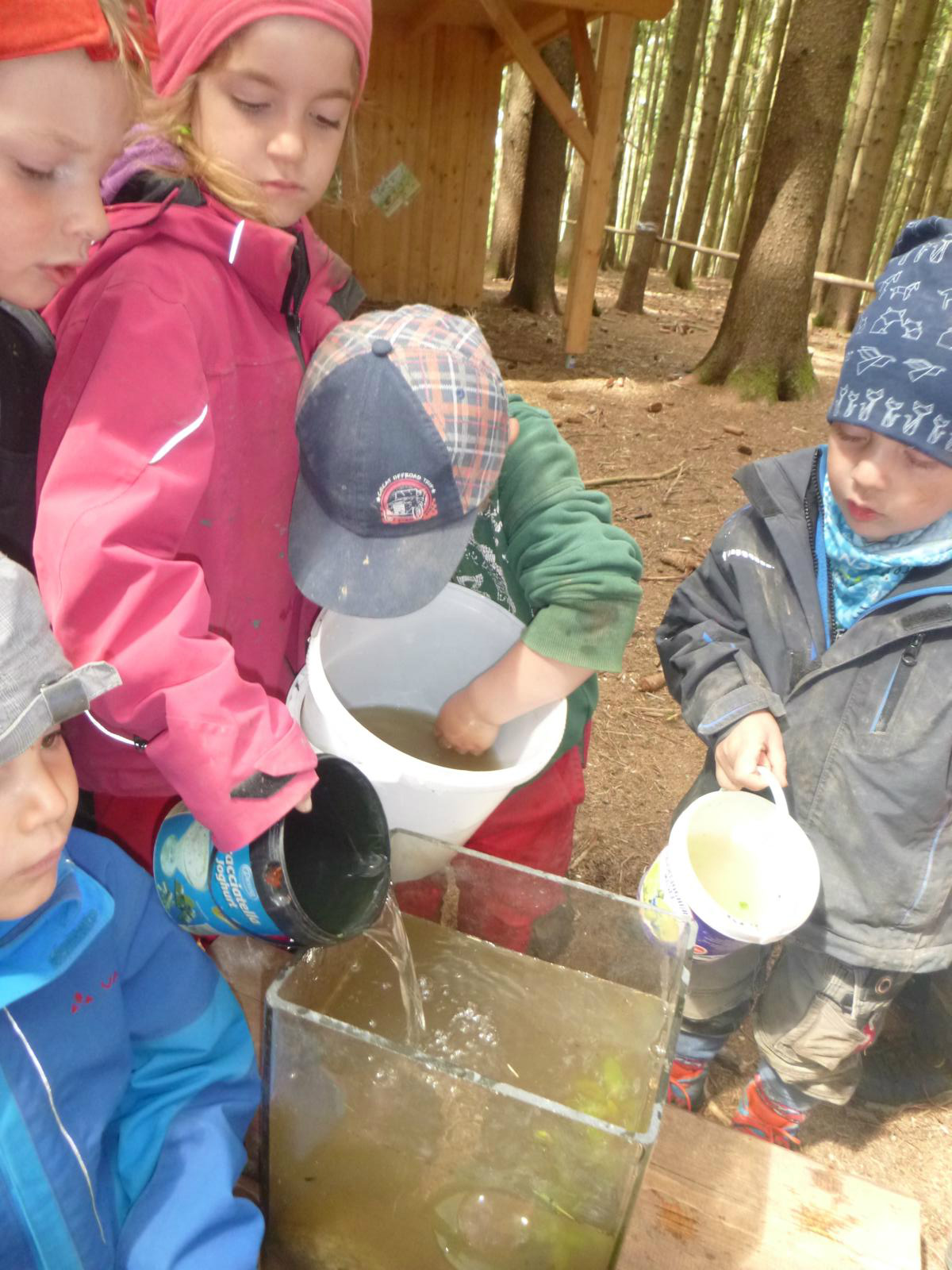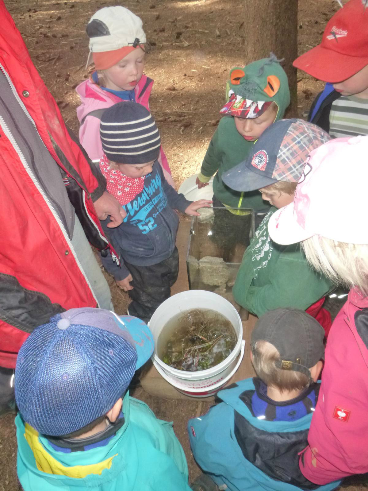 Mit großem Eifer holten die Kinder eimerweise Wasser aus dem Lausbach, bestückten das Auqarium mit Steinen und Wasserpflanzen und schauten den Kaulquappen beim Einzug zu. Jeden Tag werden sie genauestens beobachtet, ob sich schon ein Beinchen sehen lässt oder andere Veränderungen vor sich gehen. Die zehn Kaulis haben natürlich schon Namen bekommen und obwohl die eine oder andere Kinderhand nicht der Versuchung widerstehen kann, nach den Tierchen zu grapschen, scheinen sie sich noch guter Gesundheit zu erfreuen.