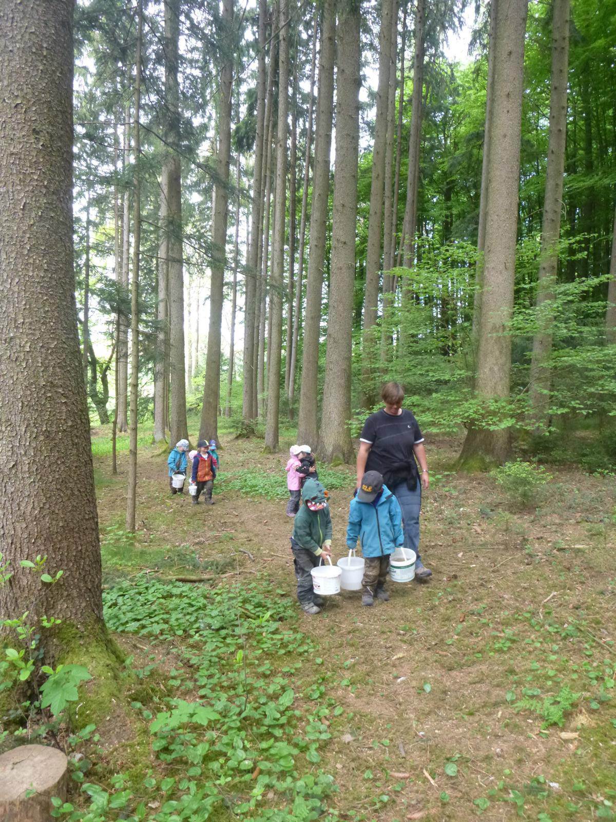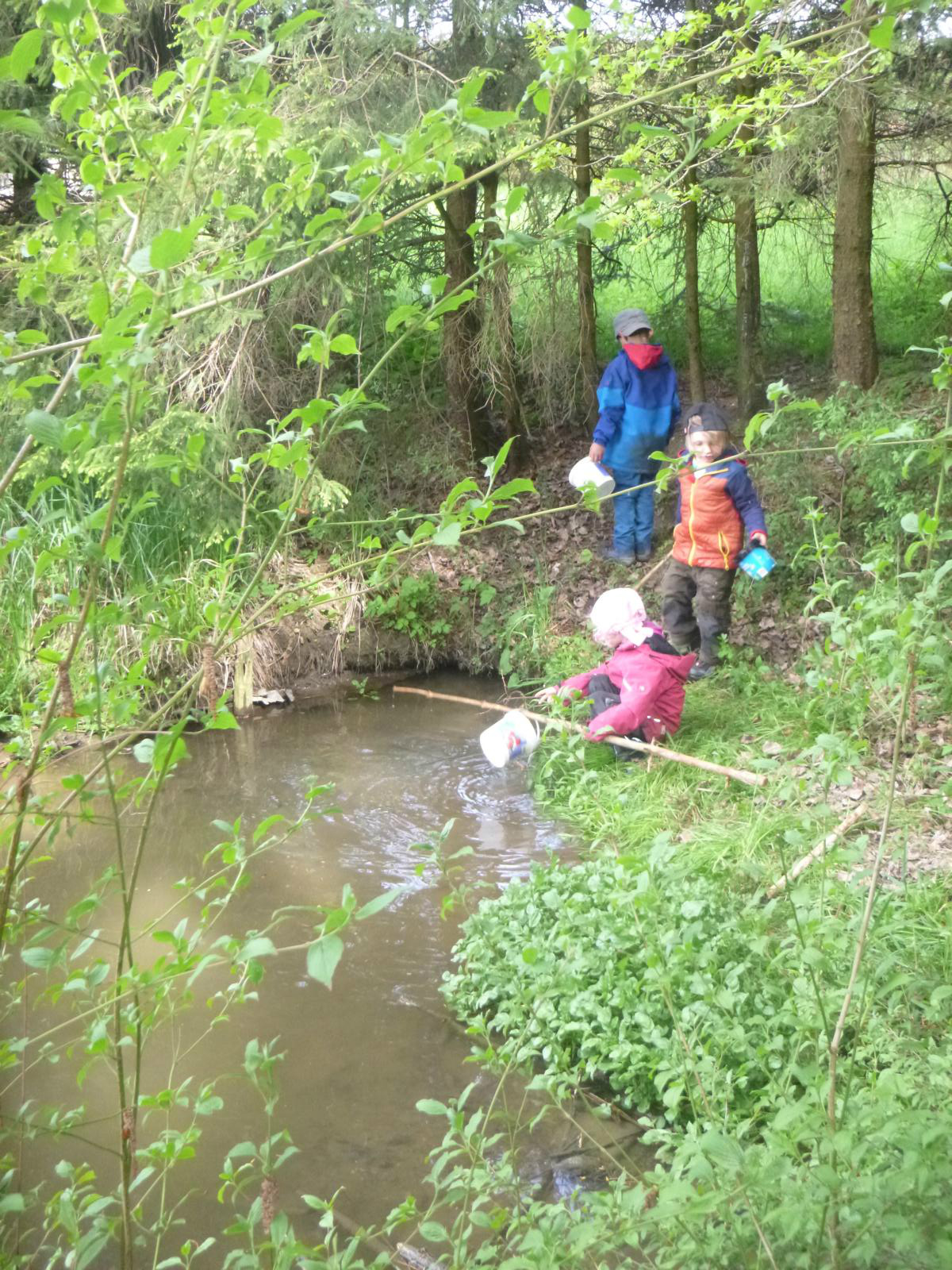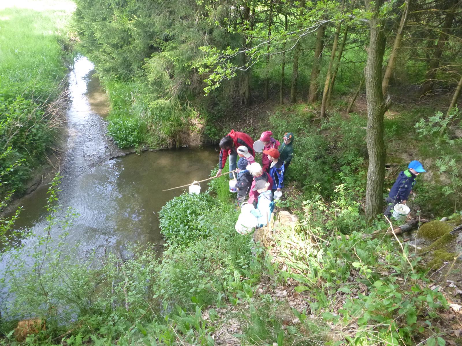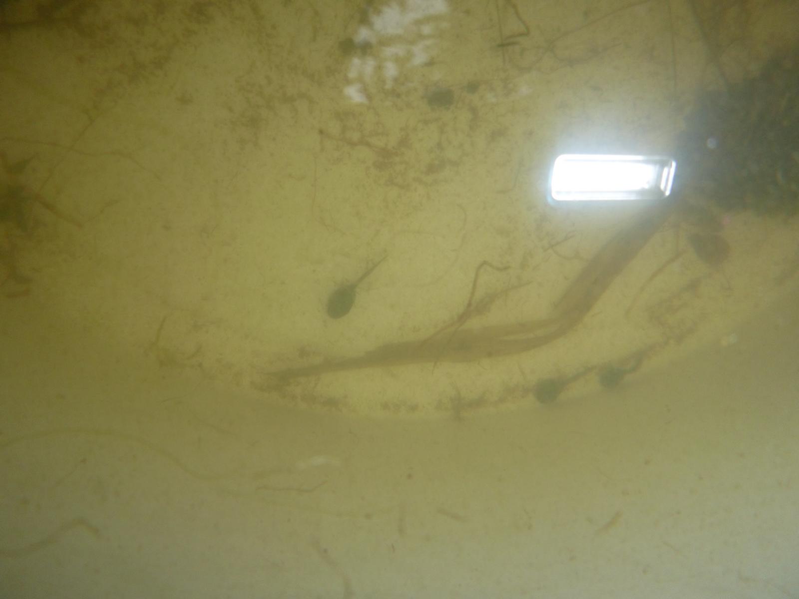 Schon vor einigen Wochen hatten wir im Lausbach einen großen Klumpen mit Froschlaich entdeckt. Doch unsere Hoffnung, auch ein paar Kaulquappen zu entdecken und beobachten zu können, hat sich leider nicht erfüllt. Doch nun haben wir aus einem anderen Weiher ein paar der flinken Tierchen entführt und ihnen ein großes - hoffentlich behagliches - Zuhause in unserem Wald verschafft.